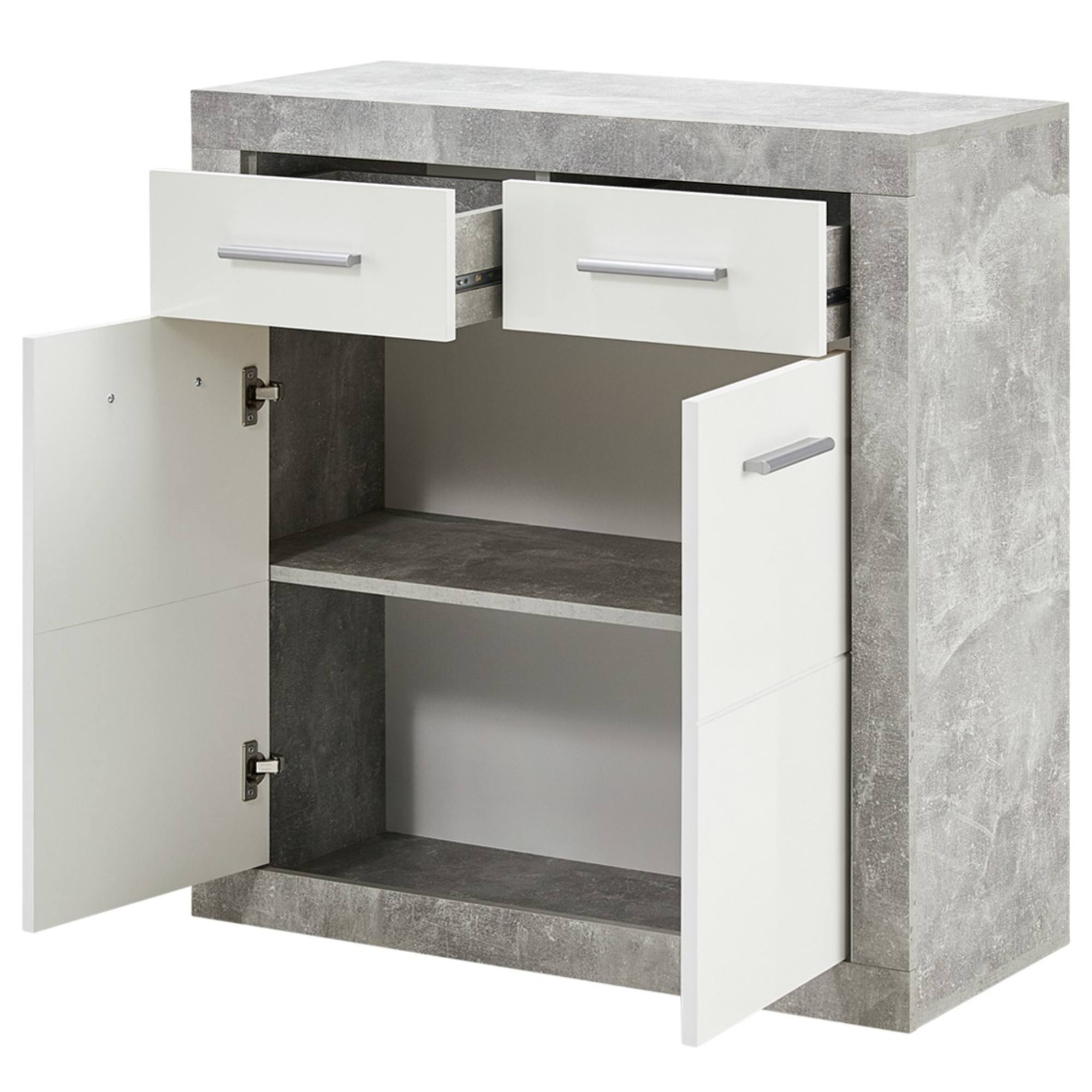 Menšia dvojdverová komoda STONE 5, ktorá kombinuje dekor kameňa na korpuse s bielou farbou vo vysokom lesku na čelách zásuviek a dvierok. Váš interiér tak bude vybavený v modernom duchu. Dve vložené police za dvierkami a dve zásuvky vytvárajú veľmi praktický kus nábytku v jednoduchom funkčnom štýle. Všetko potrebné tak budete mať vždy po ruke. Vyrobená je z laminovaného dreveného materiálu, ktorý sa vyznačuje jednoduchou údržbou.