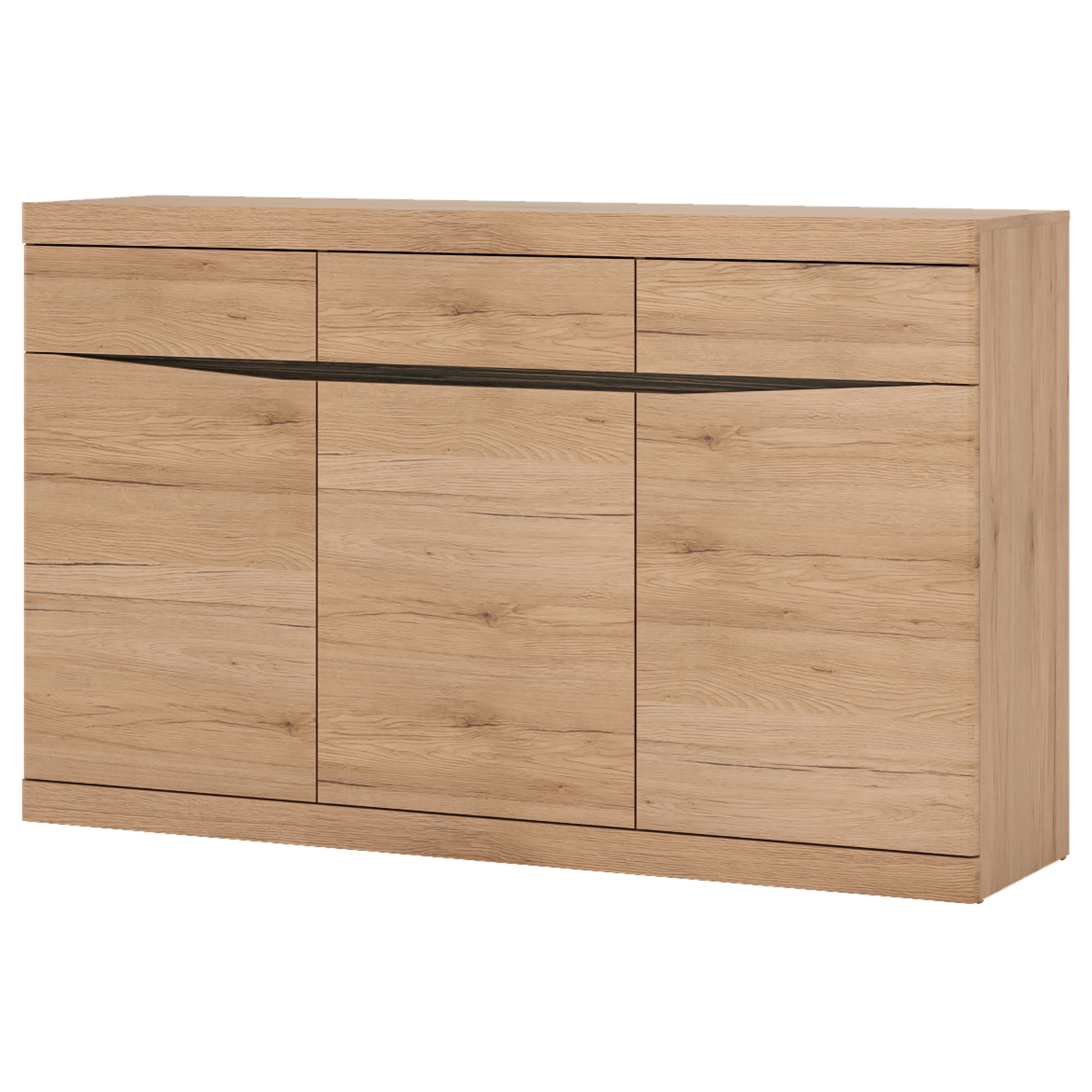 Elegantná komoda SUMMER 42 v minimalistickom dizajne, na ktorej vyniká výrazná drevená kresba. Je vyrobená z kvalitného lamina v dekore duba, atypicky tvarované predné plochy sú z MDF dosky. Skvele sa tak bude vynímať v obývacej izbe, či spálni. Obsahuje tri zásuvky s kovovými pojazdmi a celkom tri vnútorné police schované za dvierkami. Manipuláciu dvierok a zásuviek vám uľahčí systém SOFT CLOSE. Doplňte váš interiér ďalšími prvkami z rovnomenného programu SUMMER.