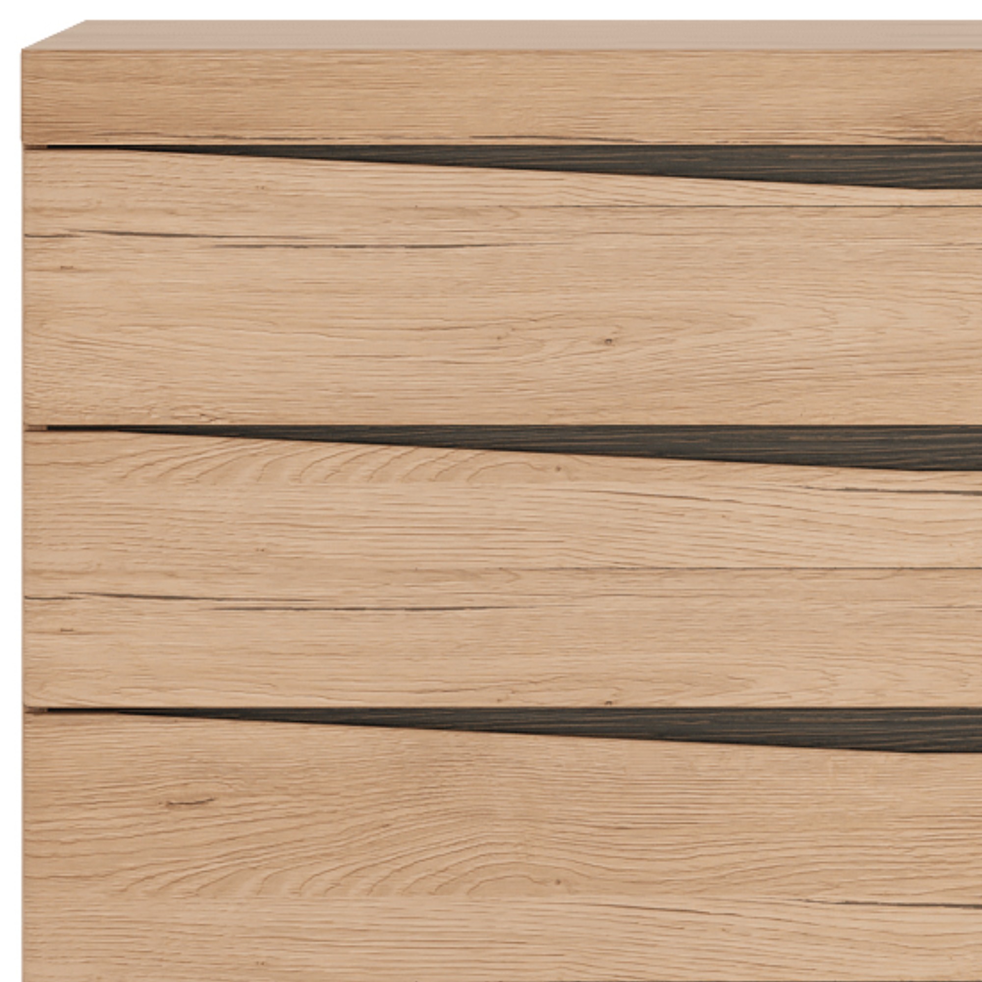 Elegantná komoda SUMMER 44 v minimalistickom dizajne, na ktorej vyniká výrazná drevená kresba. Je vyrobená z kvalitného lamina v dekore duba, atypicky tvarované predné plochy sú z MDF dosky. Skvele sa tak bude vynímať v obývacej izbe, či spálni. Obsahuje osem zásuviek s kovovými pojazdmi vrátane systému SOFT CLOSE. Doplňte váš interiér ďalšími prvkami z rovnomenného programu SUMMER.