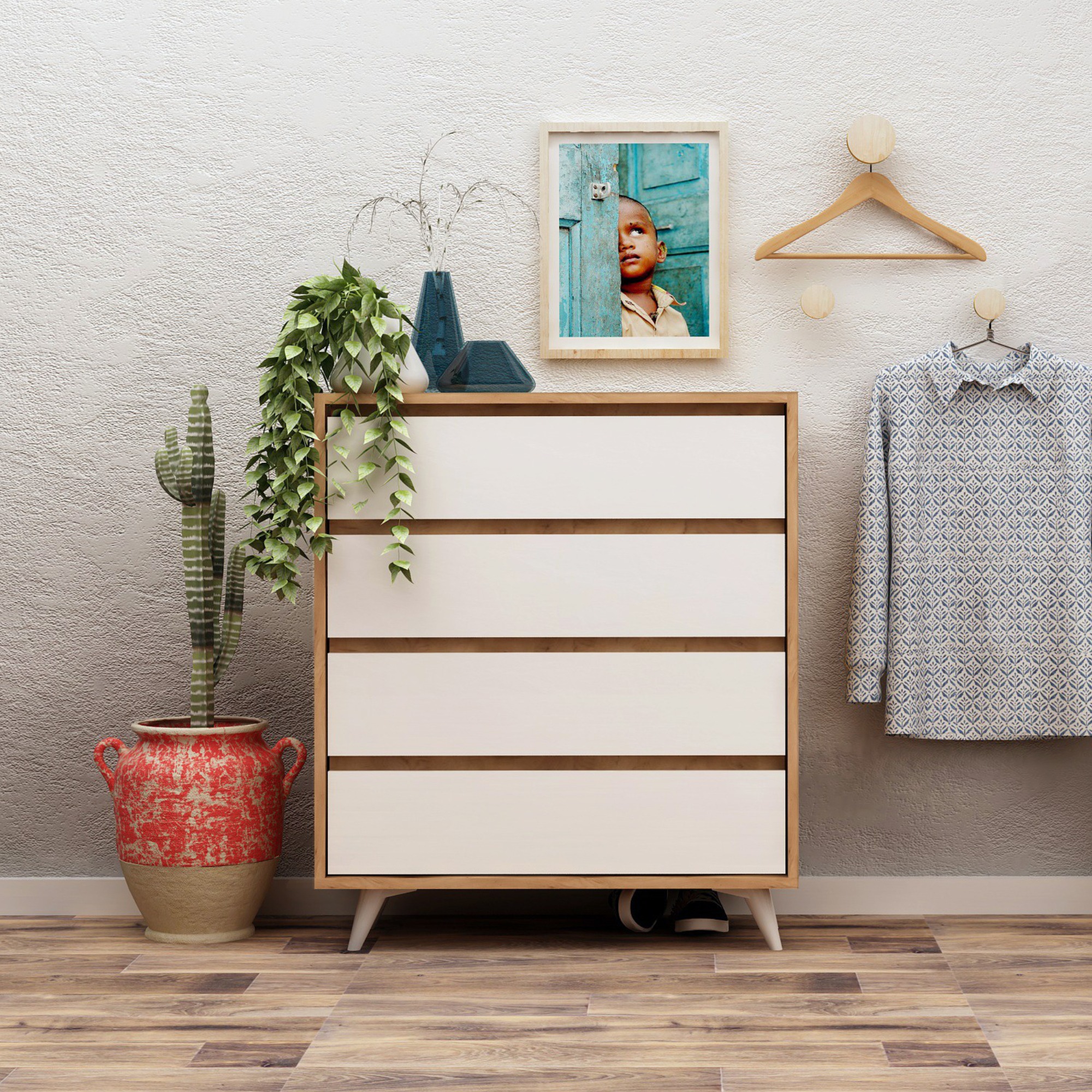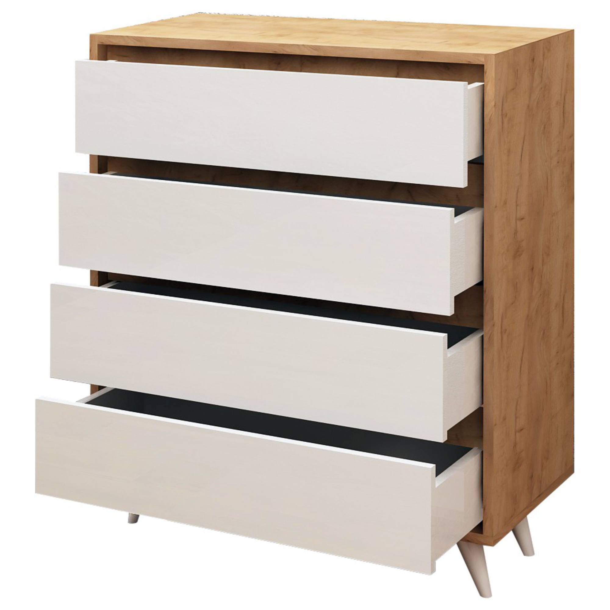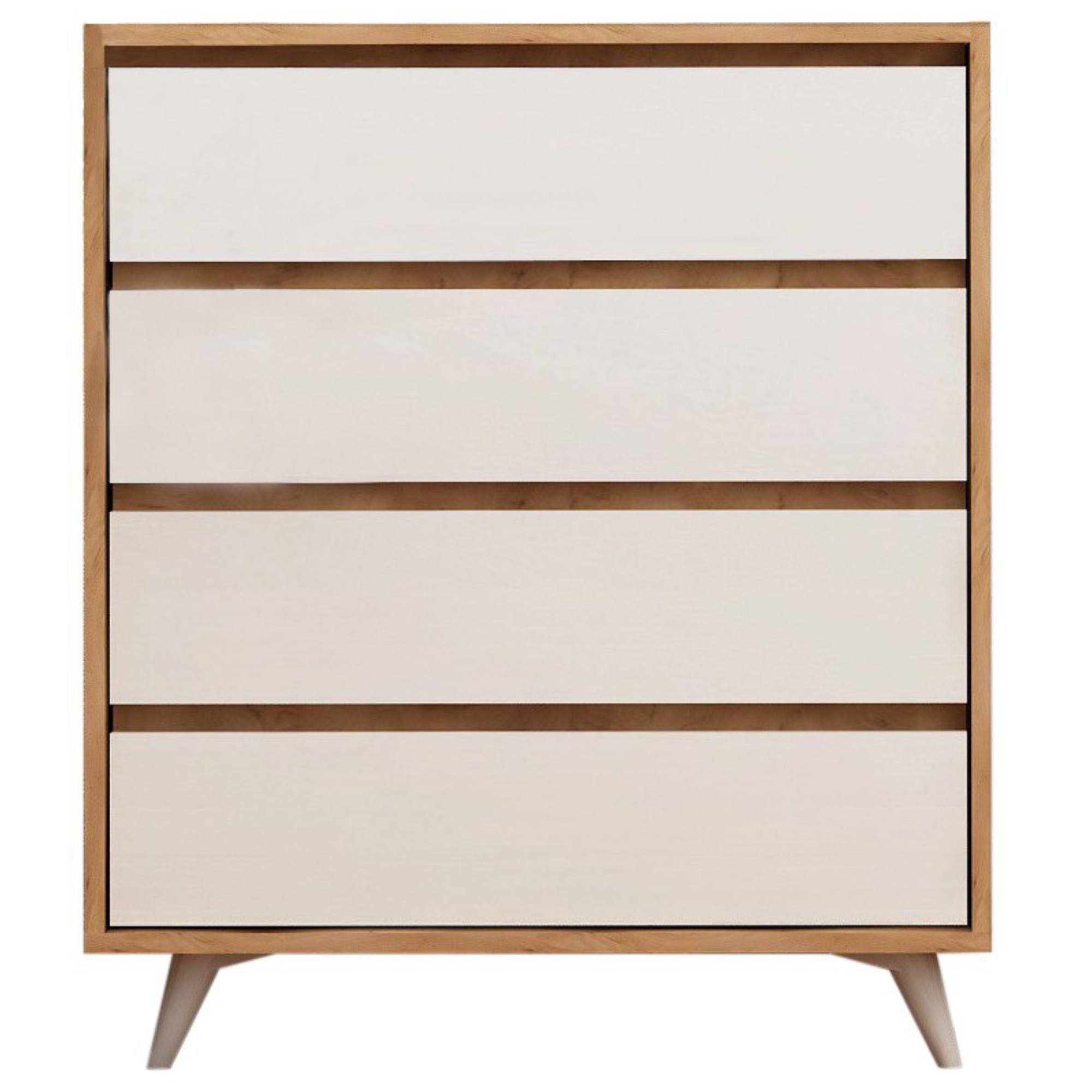 V komode nájdete štyri praktické zásuvky, kde môžete uschovať všetko, čo sa vám doma bezvládne povaľuje. Bezrúčkové vyhotovenie zásuviek zvýrazňuje celkový minimalistický štýl komody. Kónické nohy dodávajú komode šmrnc. Laminovaný drevený materiál sa vyznačuje jednoduchou údržbou.