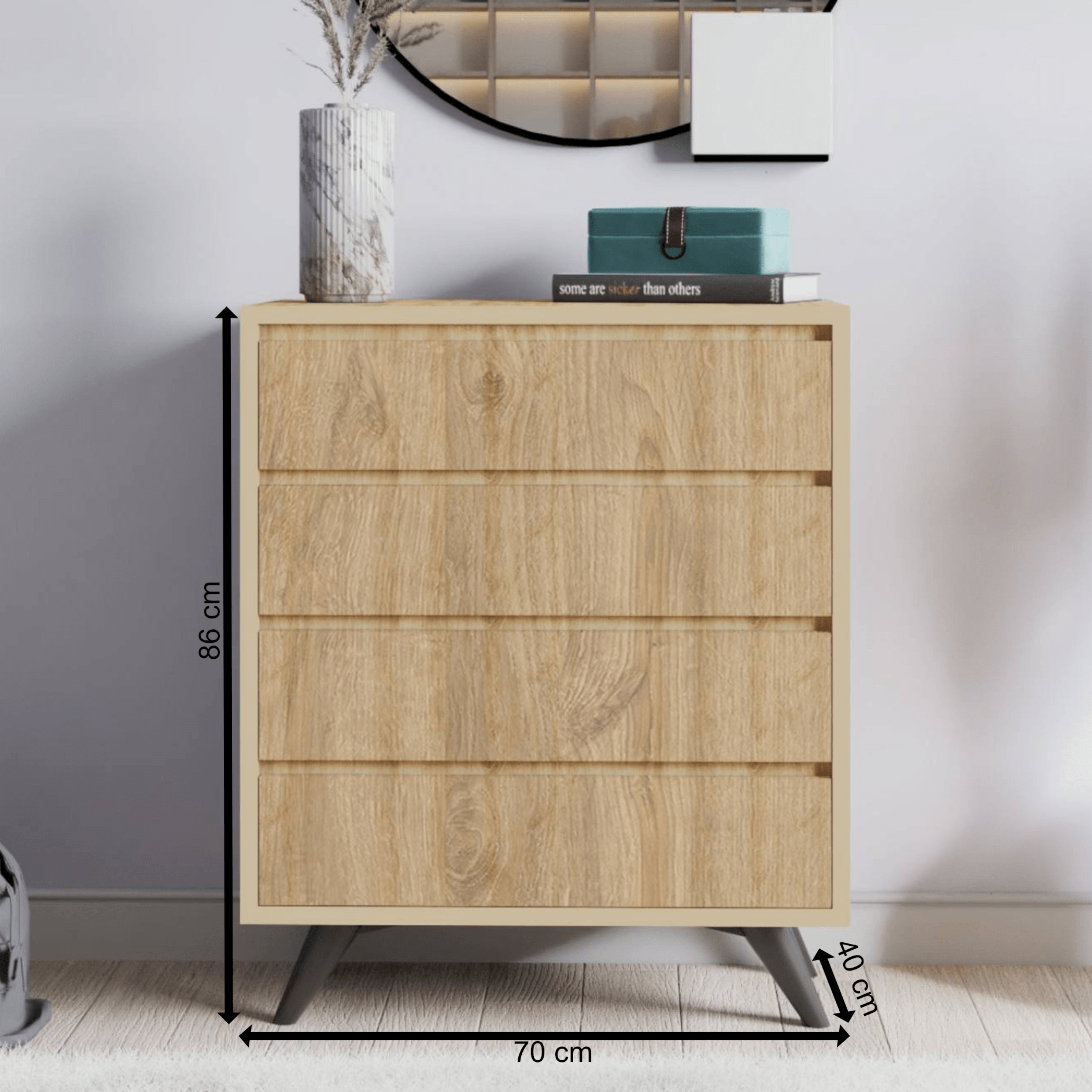 Komoda je vyrobená z laminovanej drevotrieskovej dosky a je ladená do dekora duba svetlého. Bude sa vám tak ľahko udržiavať. Disponuje štyrmi delenými zásuvkami, ktoré poskytujú dostatok úložného priestoru. Od oblečenia až po doplnky, bude mať všetko svoje určené miesto, čo vám uľahčí hľadanie toho, čo práve potrebujete.