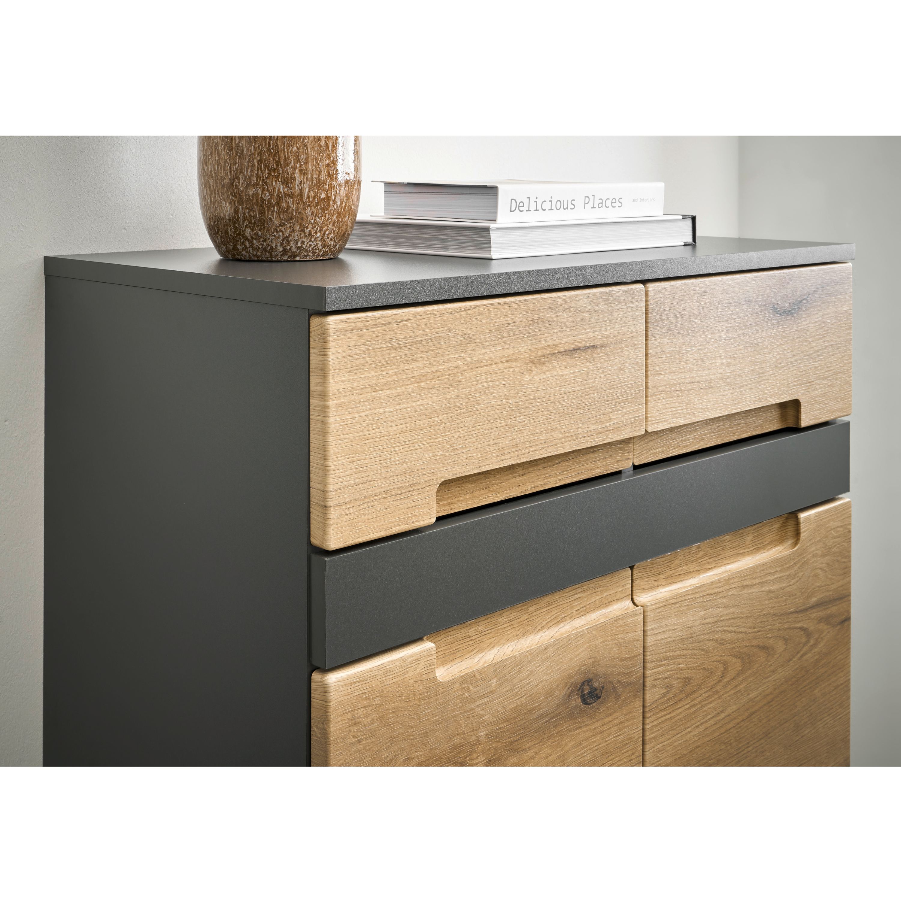 Komoda TAYLOR 1 v modernom vyhotovení s čistými líniami zaujme kontrastnou kombináciou dekoru duba evoke a antracitovej farby, vďaka ktorej ľahko zapadne do súčasných interiérov.