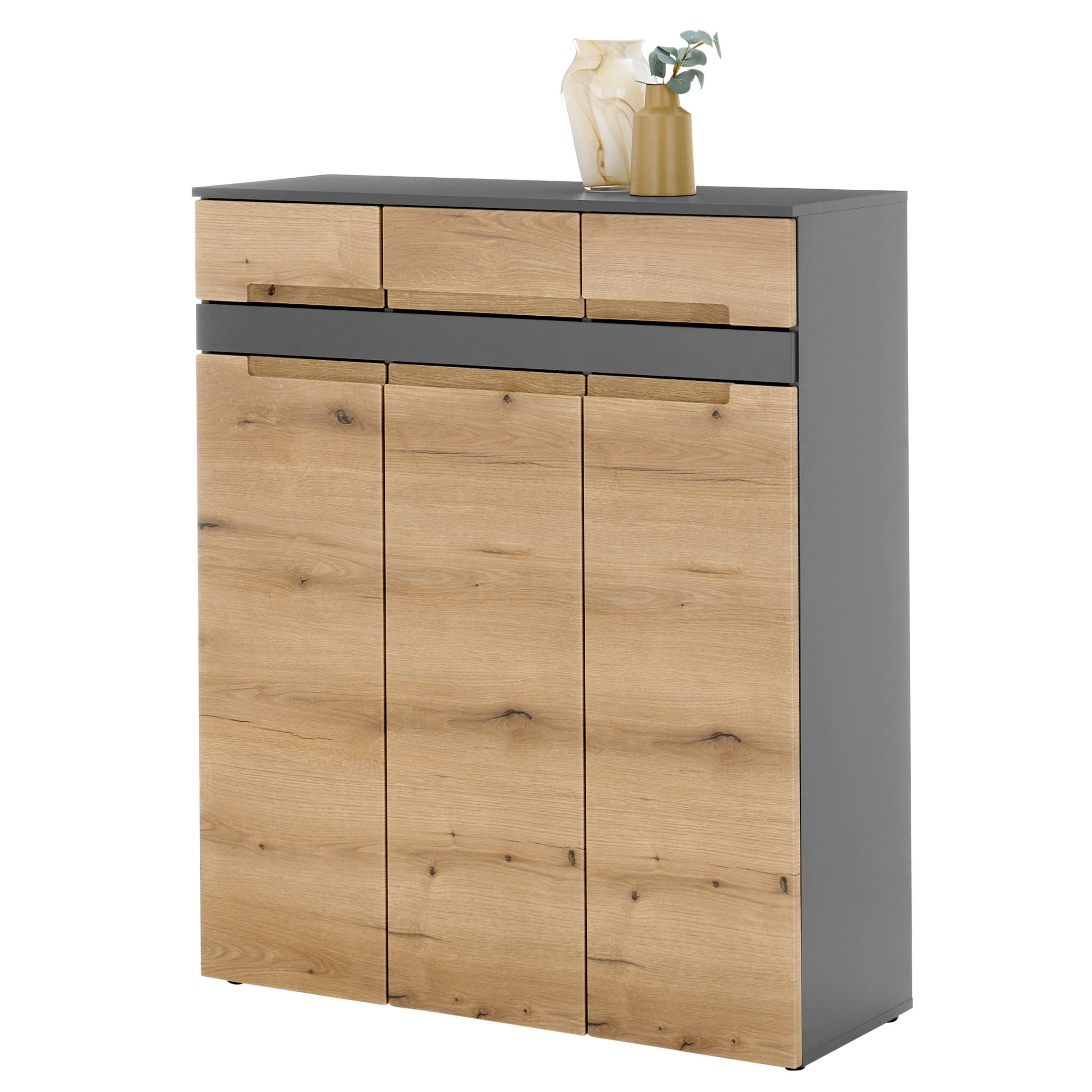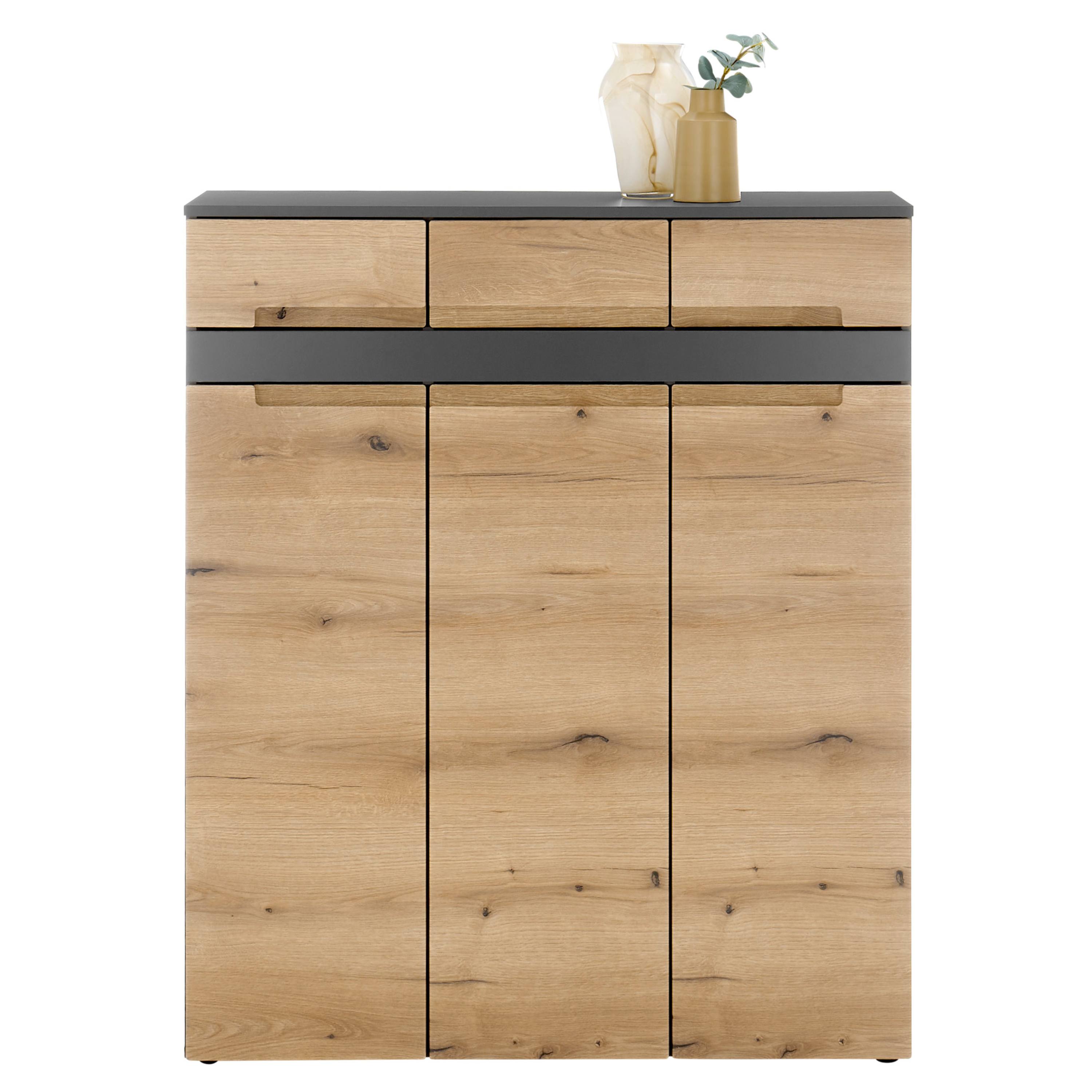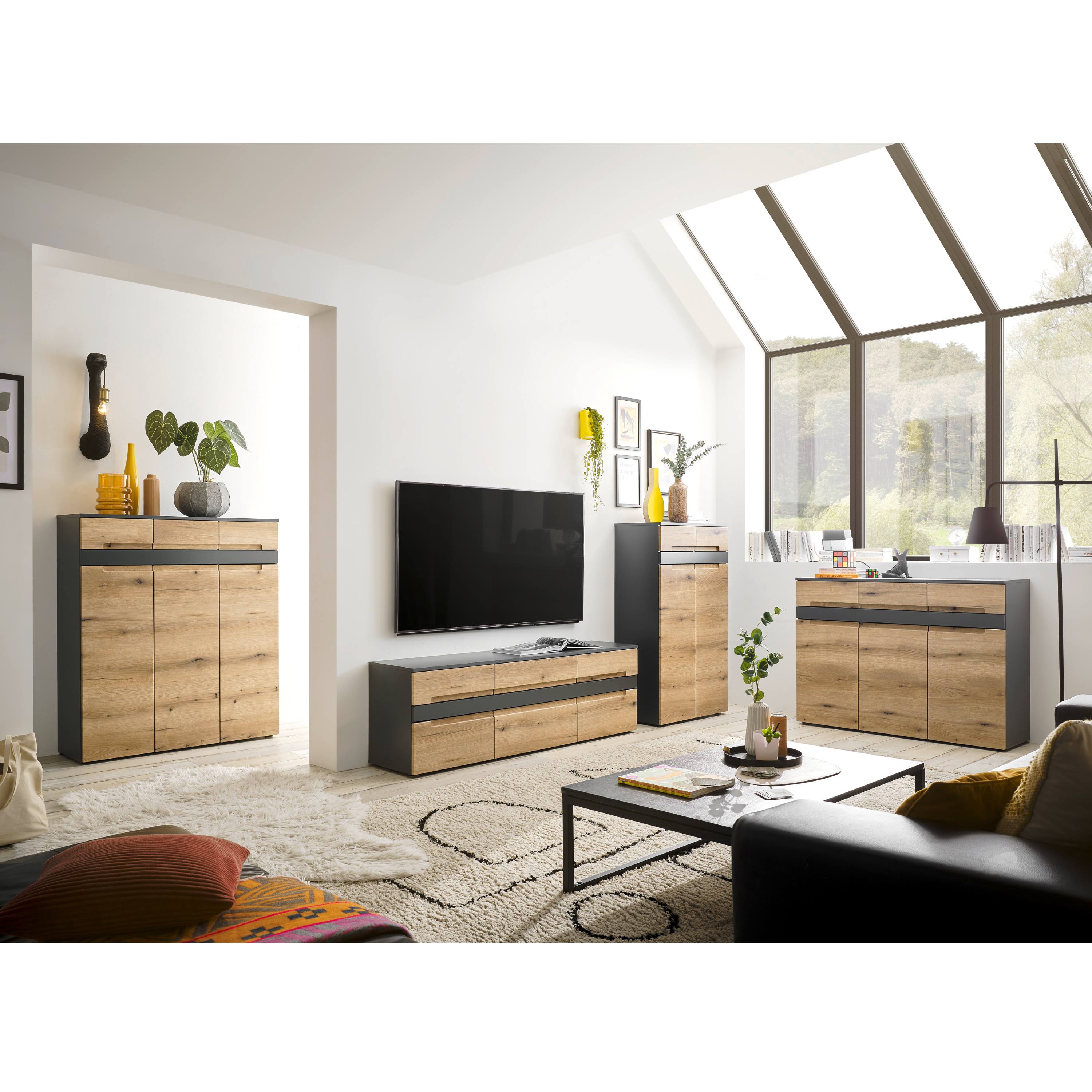Komoda TAYLOR 2 v modernom vyhotovení s čistými líniami zaujme kontrastnou kombináciou dekoru duba evoke a antracitovej farby, vďaka ktorej ľahko zapadne do súčasných interiérov.