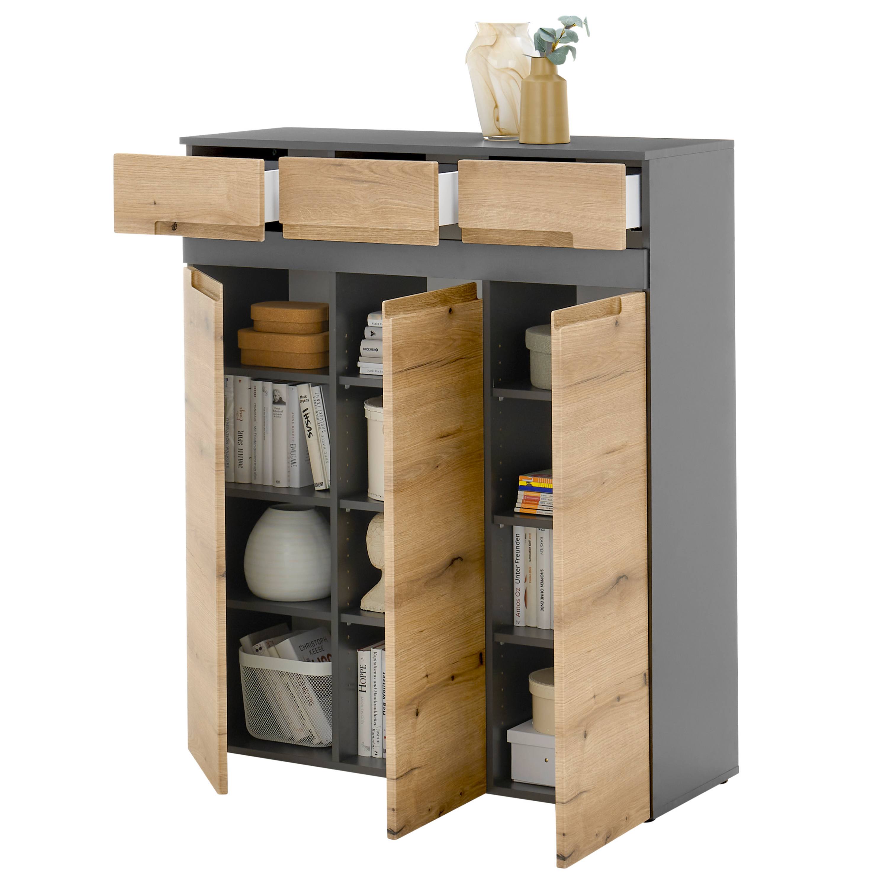 Prakticky riešený úložný priestor tvorí trojica zásuviek v hornej časti a uzatvárateľná časť s 3 otočnými dverami, za ktorými sa nachádzajú členené priestory s celkom 9 vloženými policami na prehľadné usporiadanie vecí. Dvierka aj zásuvky sú vybavené zapustenými úchytmi, ktoré podčiarkujú minimalistický dizajn a zároveň zaisťujú pohodlné každodenné používanie. Korpus je vyrobený z laminovanej drevotriesky v kombinácii s MDF, ktoré zaručujú jednoduchú údržbu.