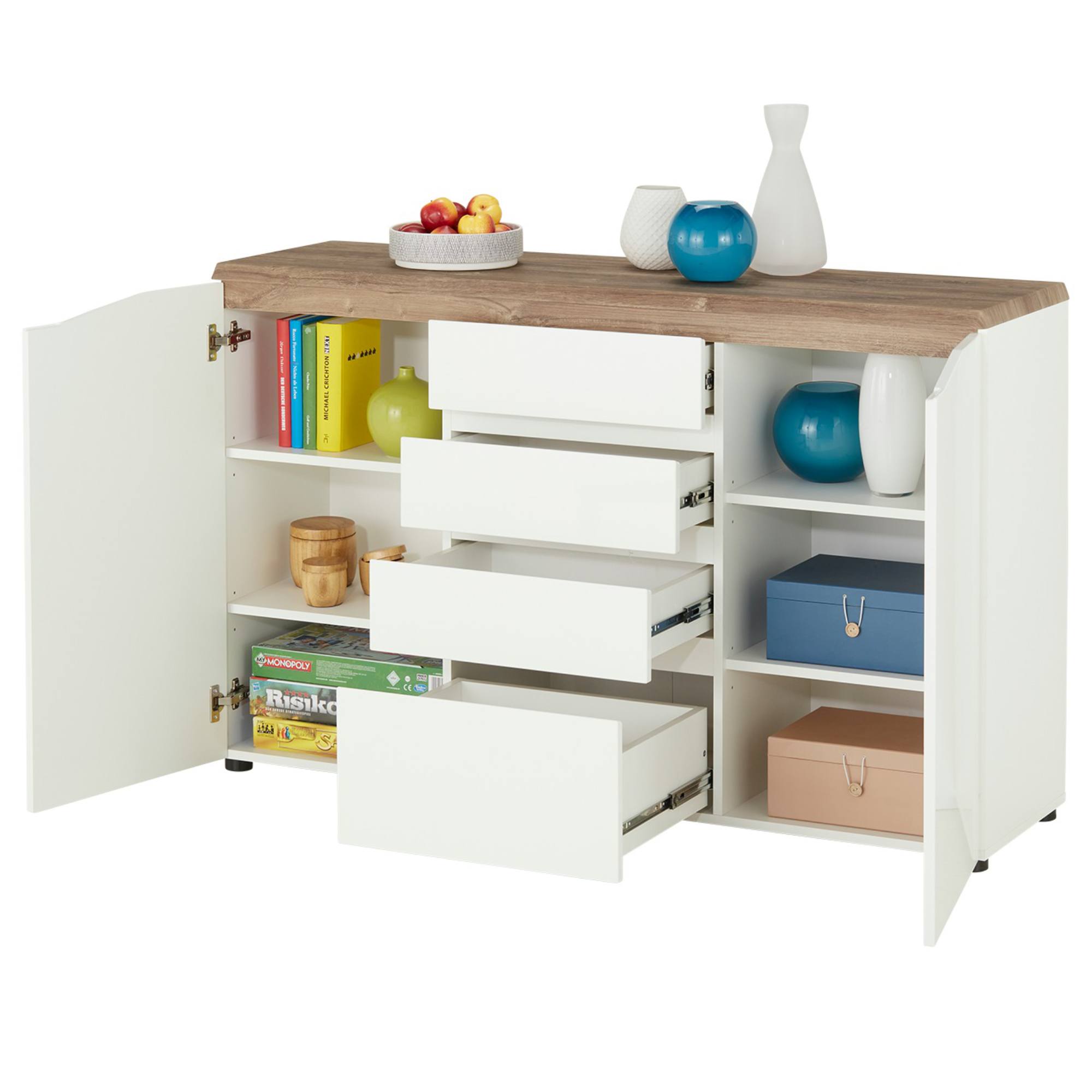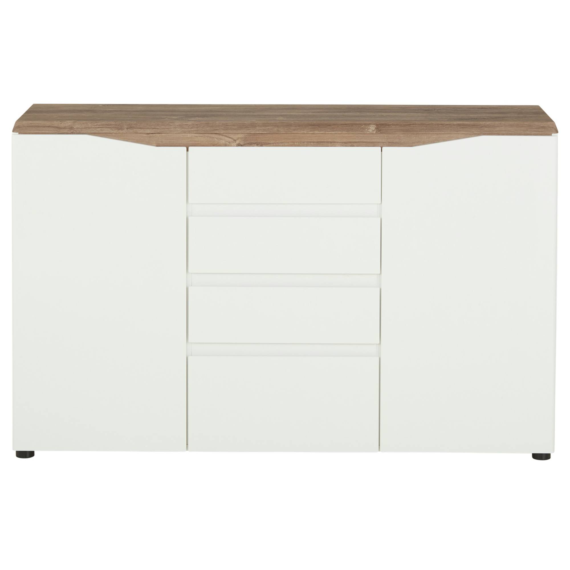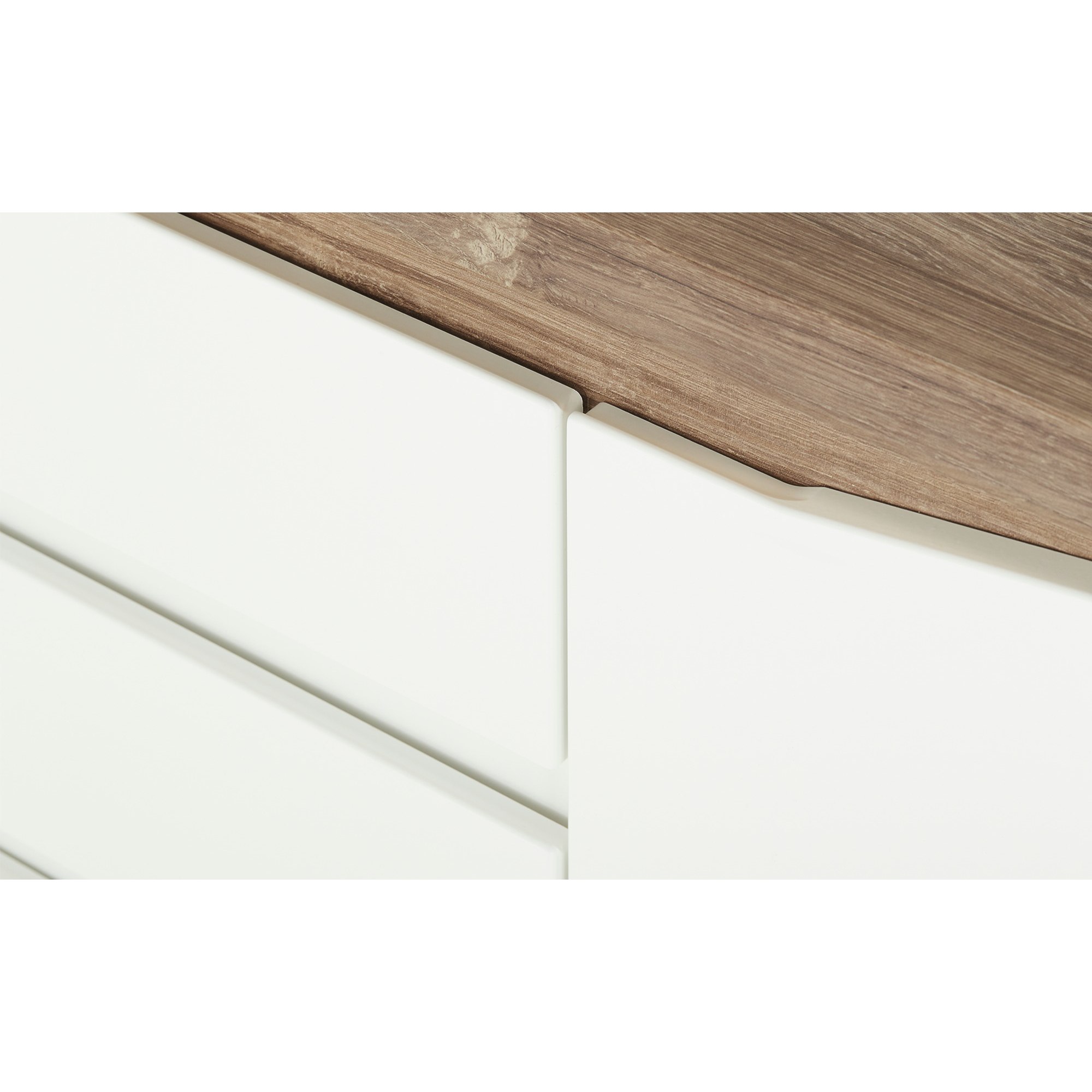 Komoda TOLEDO spája prakticky rozdelený úložný priestor na dve uzatvárateľné skrinky a štyri zásuvky a moderný štýl kombinujúci bielu farbu s dreveným dekorom. Komoda je vyrobená z odolného laminovaného materiálu, ktorého povrch zaručuje ľahkú údržbu.