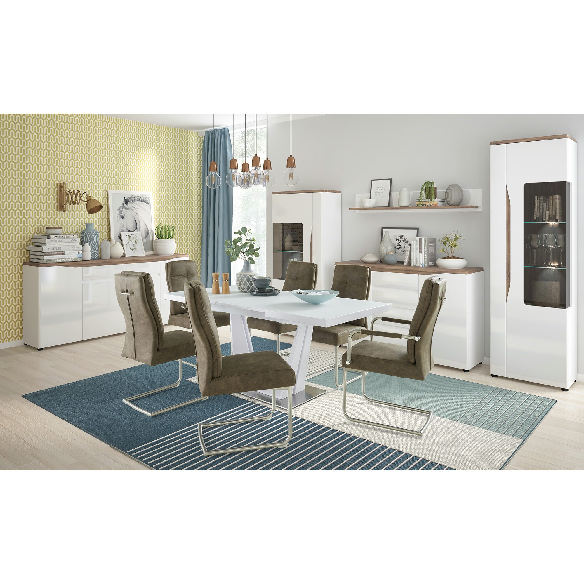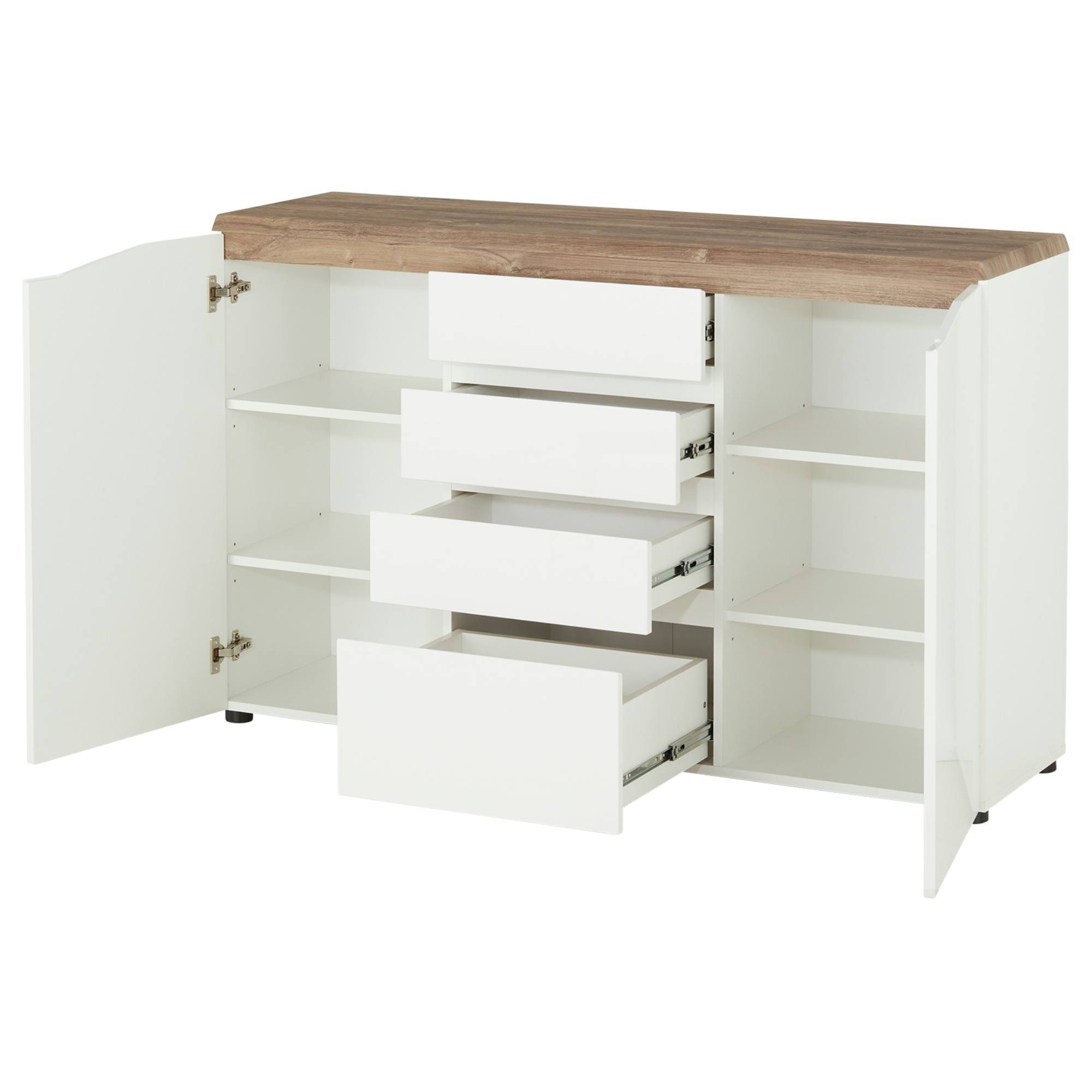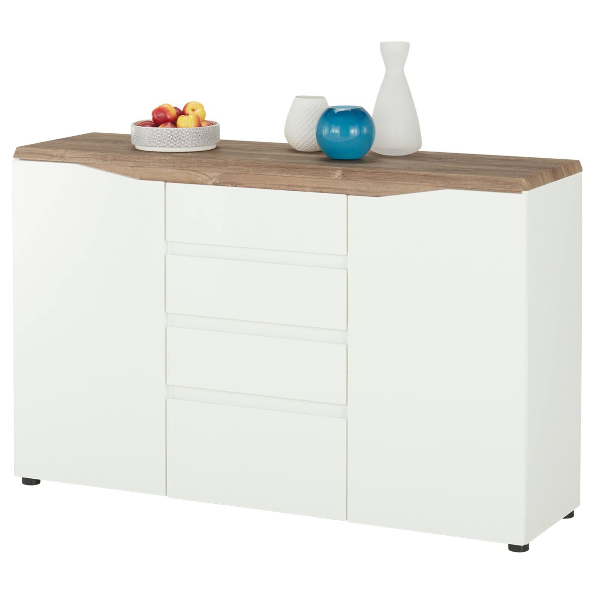 Komoda TOLEDO spája prakticky rozdelený úložný priestor na dve uzatvárateľné skrinky a štyri zásuvky a moderný štýl kombinujúci bielu farbu s dreveným dekorom. Komoda je vyrobená z odolného laminovaného materiálu, ktorého povrch zaručuje ľahkú údržbu.
