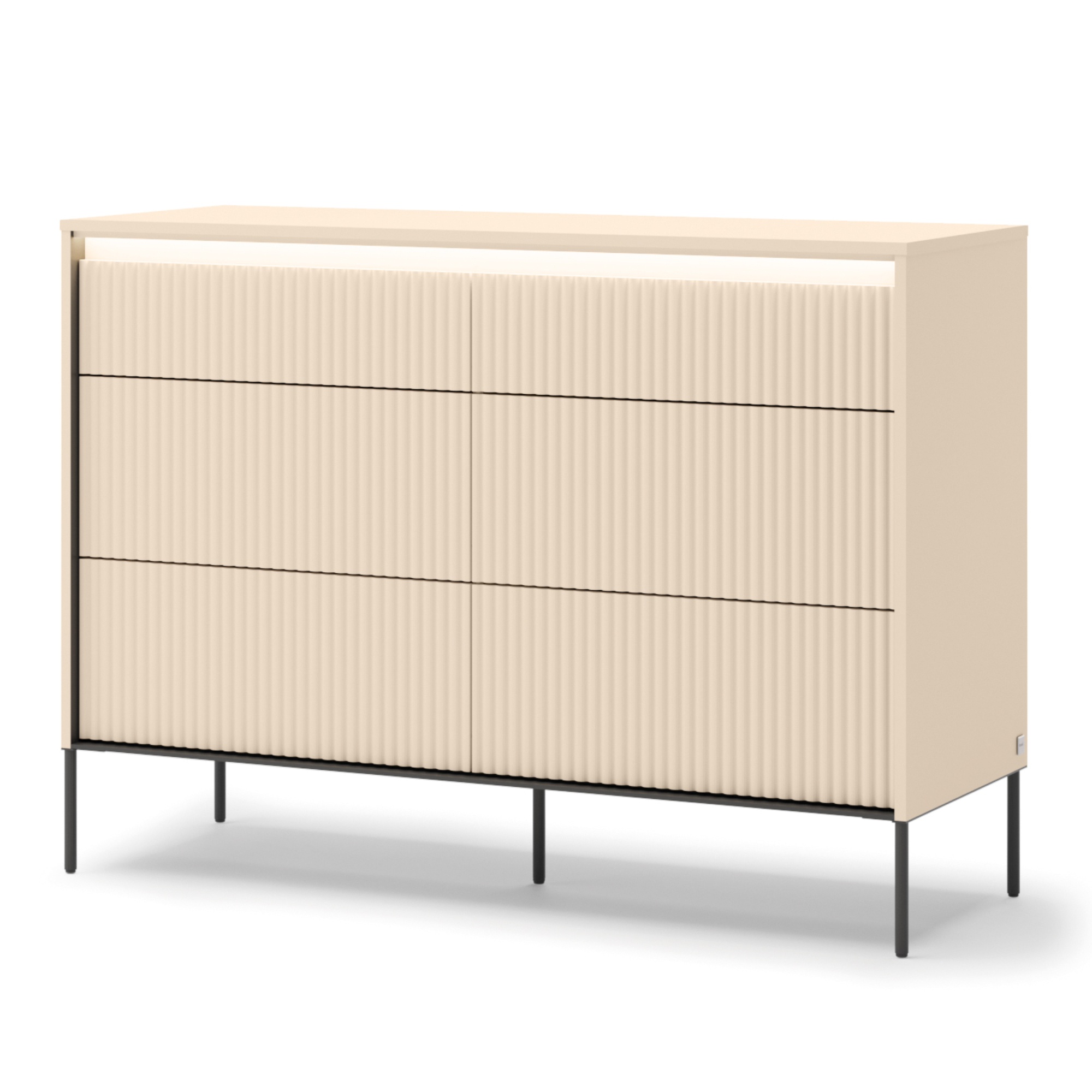 Komoda poskytuje dostatok úložného priestoru. Jej súčasťou je 6 zásuviek, do ktorých si môžete prehľadne uložiť rôzne drobnosti. Nechýba ani elegantné LED osvetlenie.