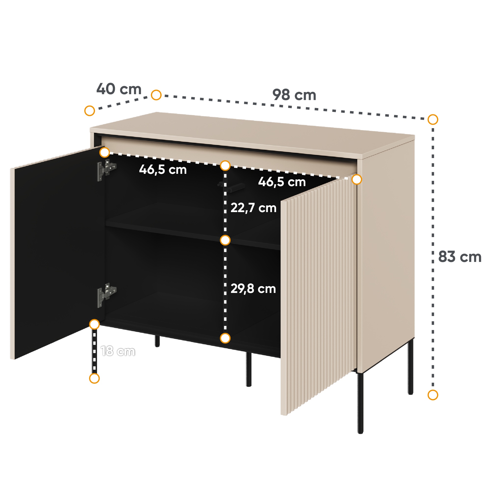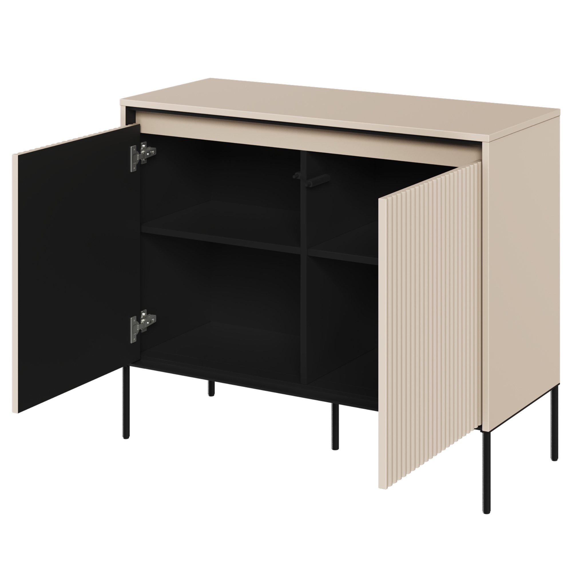 Priestor za dvierkami vám pomôže usporiadať a udržať poriadok v miestnosti. Môžete uschovať oblečenie, spodnú bielizeň, doplnky, doklady alebo iné drobnosti, ktoré chcete mať vždy po ruke. Vďaka variabilnému úložnému priestoru komodu prispôsobíte svojim individuálnym potrebám.