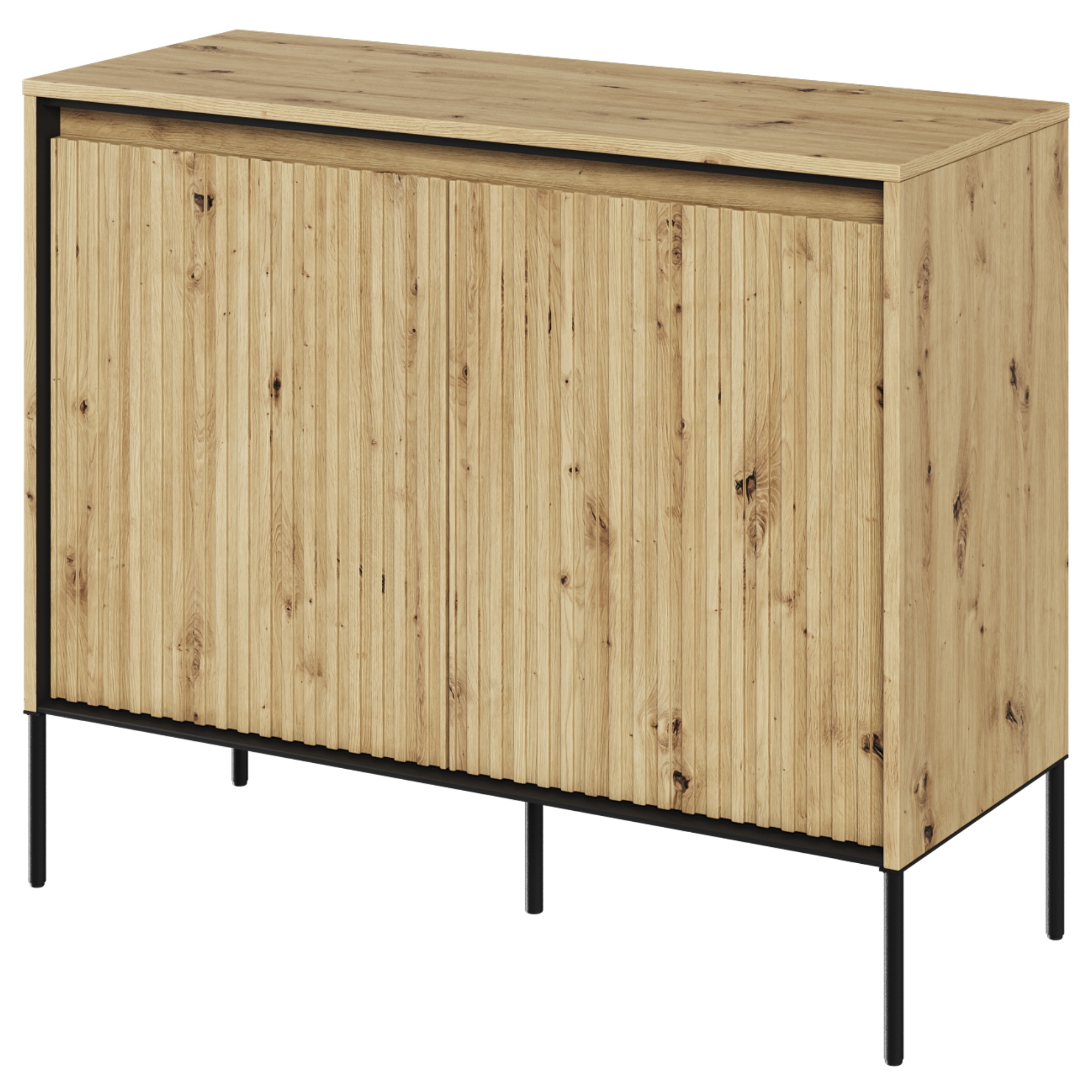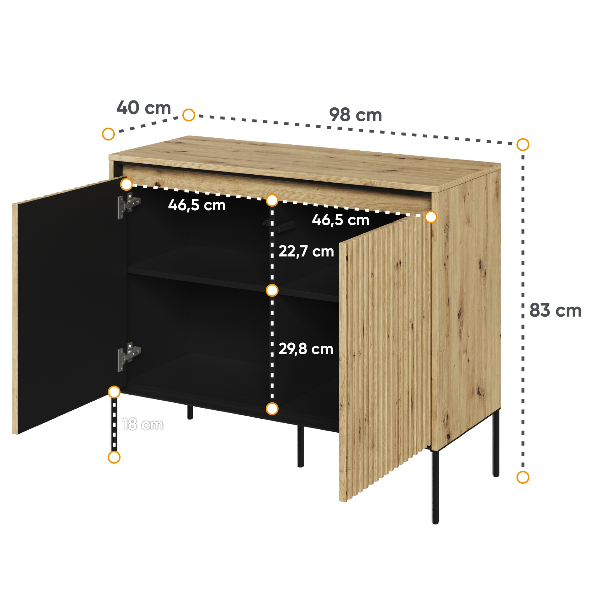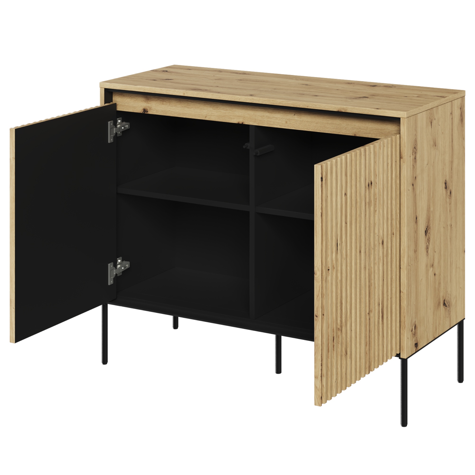 Priestor za dvierkami vám pomôže usporiadať a udržať poriadok v miestnosti. Môžete uschovať oblečenie, spodnú bielizeň, doplnky, doklady alebo iné drobnosti, ktoré chcete mať vždy po ruke. Vďaka variabilnému úložnému priestoru komodu prispôsobíte svojim individuálnym potrebám.