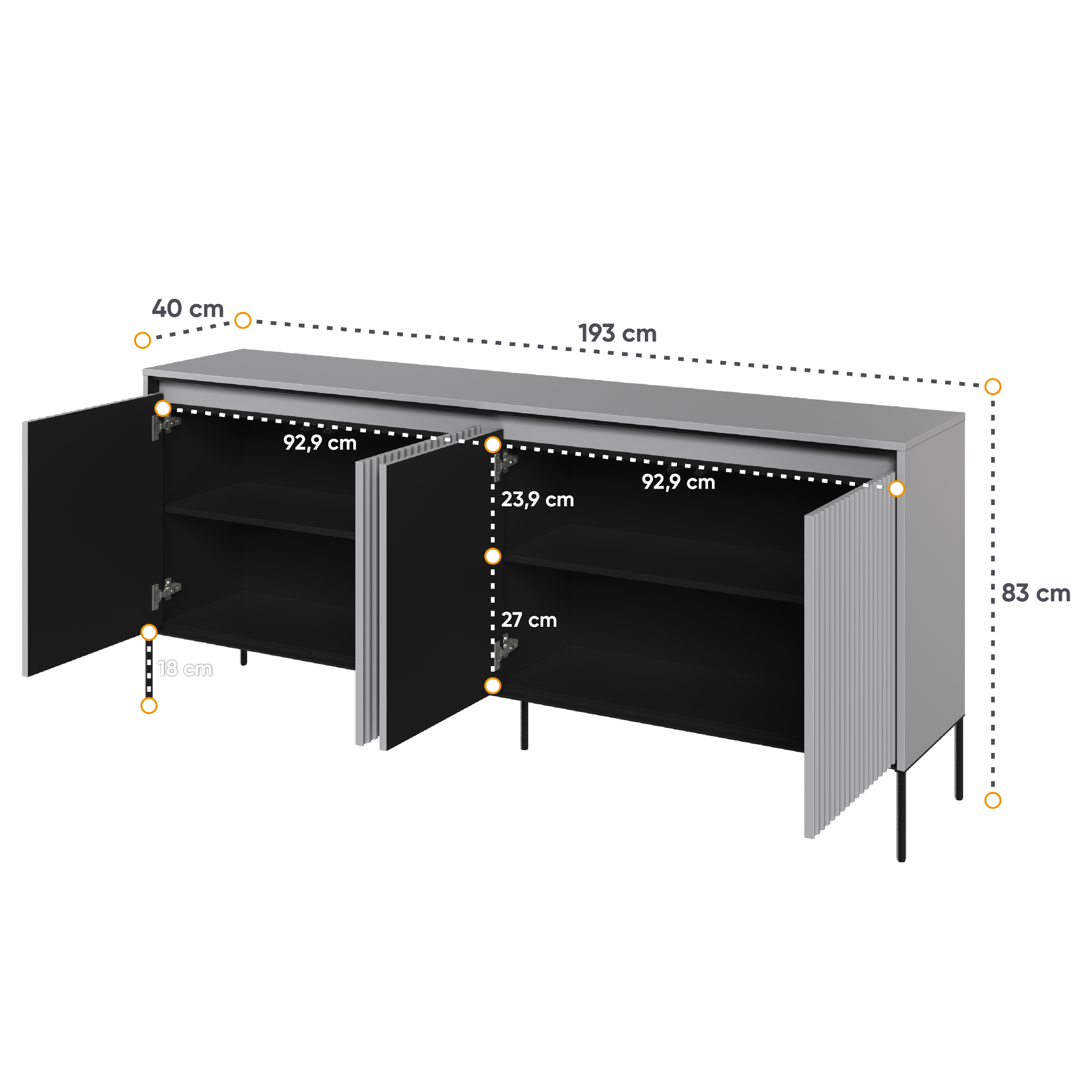 Priestor za dvierkami vám pomôže usporiadať a udržať poriadok v miestnosti. Môžete uschovať oblečenie, spodnú bielizeň, doplnky, doklady alebo iné drobnosti, ktoré chcete mať vždy po ruke. Vďaka variabilnému úložnému priestoru komodu prispôsobíte svojim individuálnym potrebám.