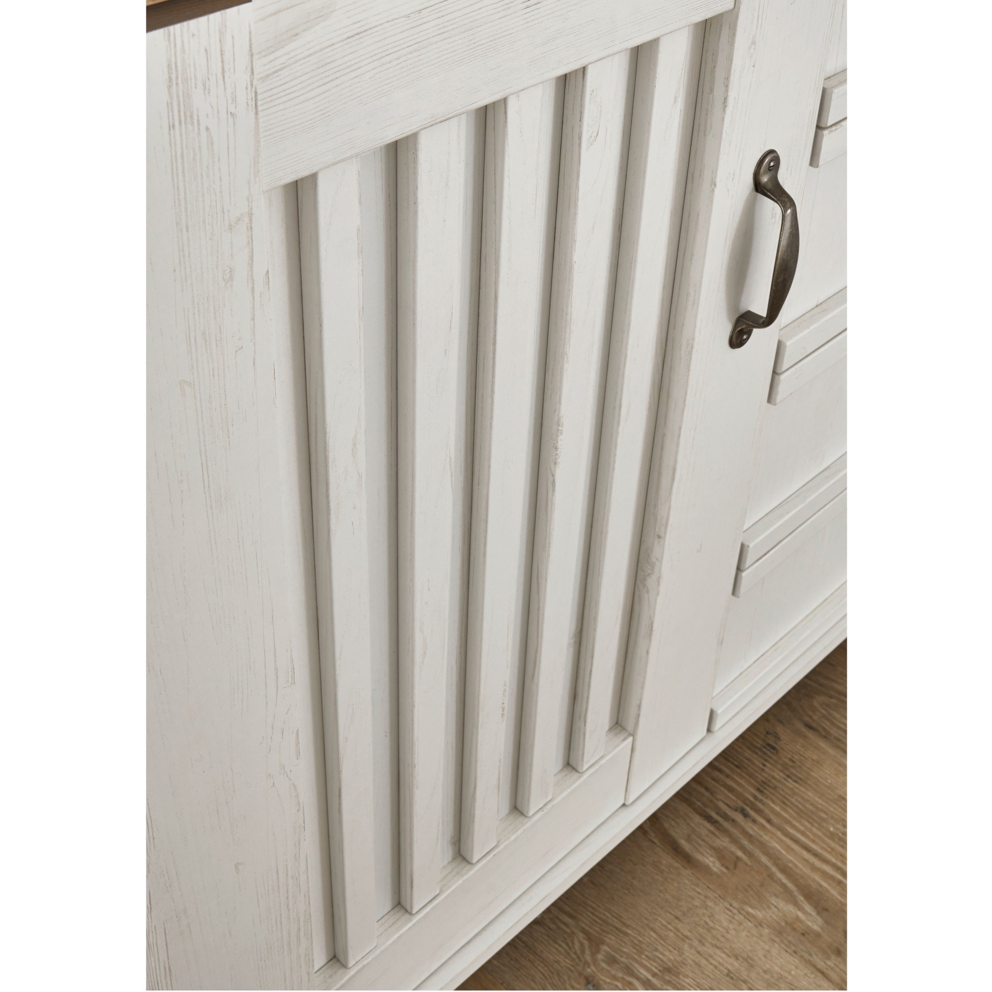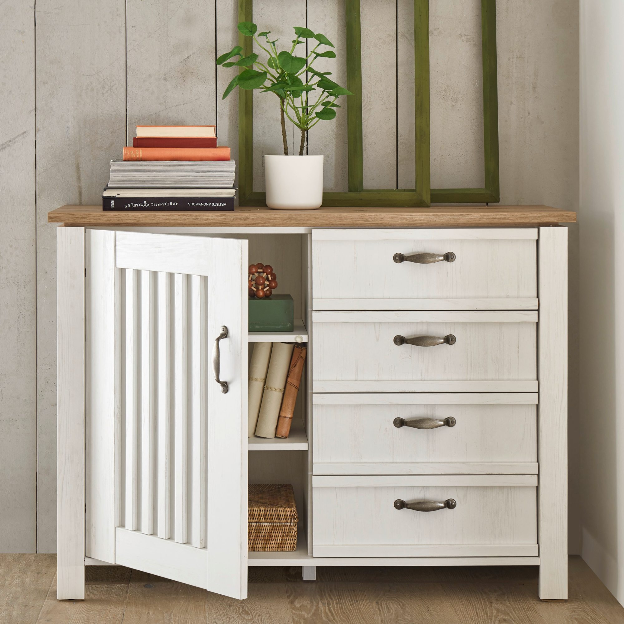 Komoda TRIENT je vyrobená v príjemnom štýle Provence. Odľahčujúci biely odtieň dekora borovice andersen je doplnený výraznejším dekorom duba artisan v podobe hornej dosky. Za dvierkami sa nachádza úložný priestor rozdelený pomocou dvoch vložených políc. Vďaka kombinácii dvierok a zásuviek poskytuje komoda dostatok úložného priestoru. Decentné rúčky dokresľujú celkový štýl a zároveň uľahčujú otváranie. Komoda vďaka svojmu fóliovanému drevenému materiálu nevyžaduje náročnú údržbu.