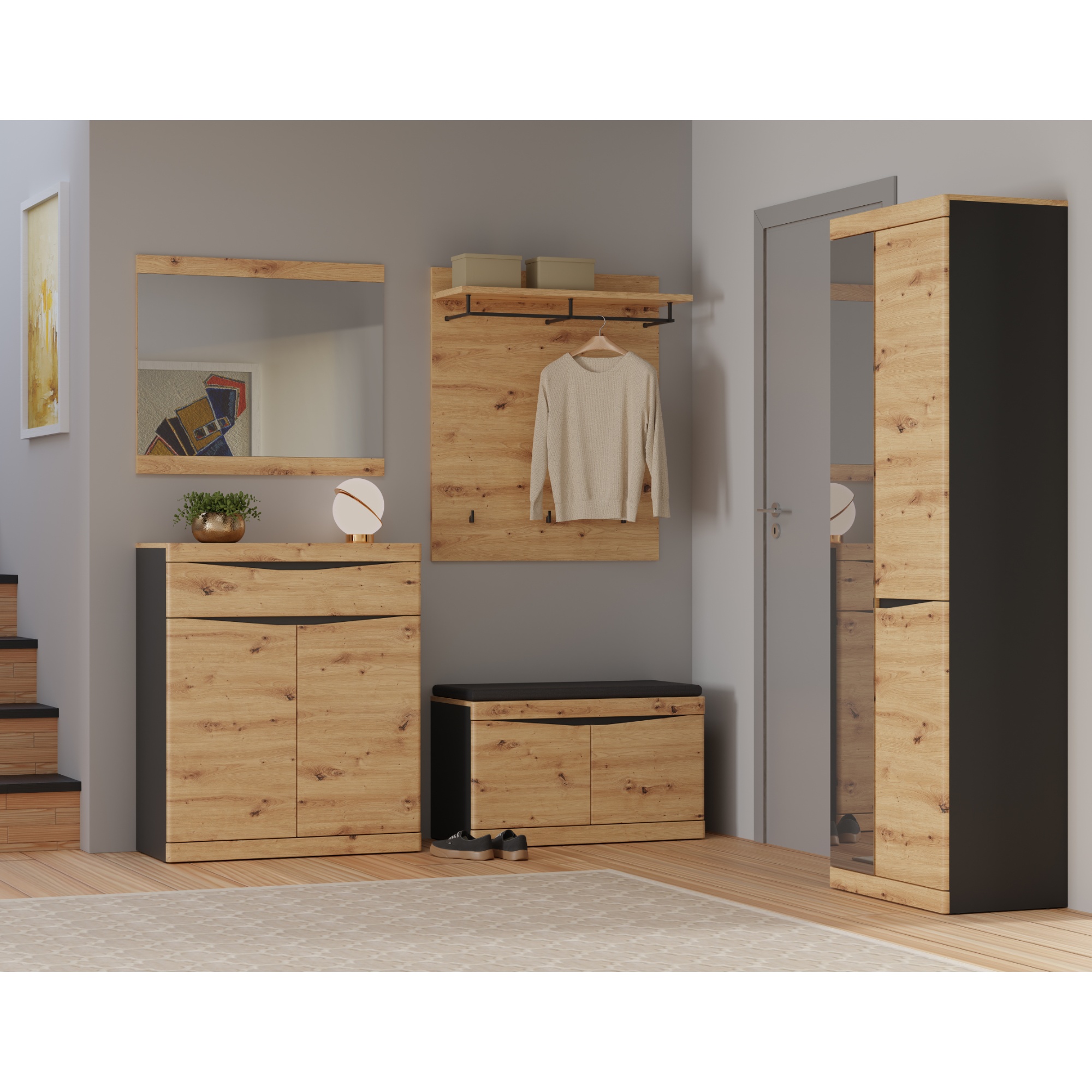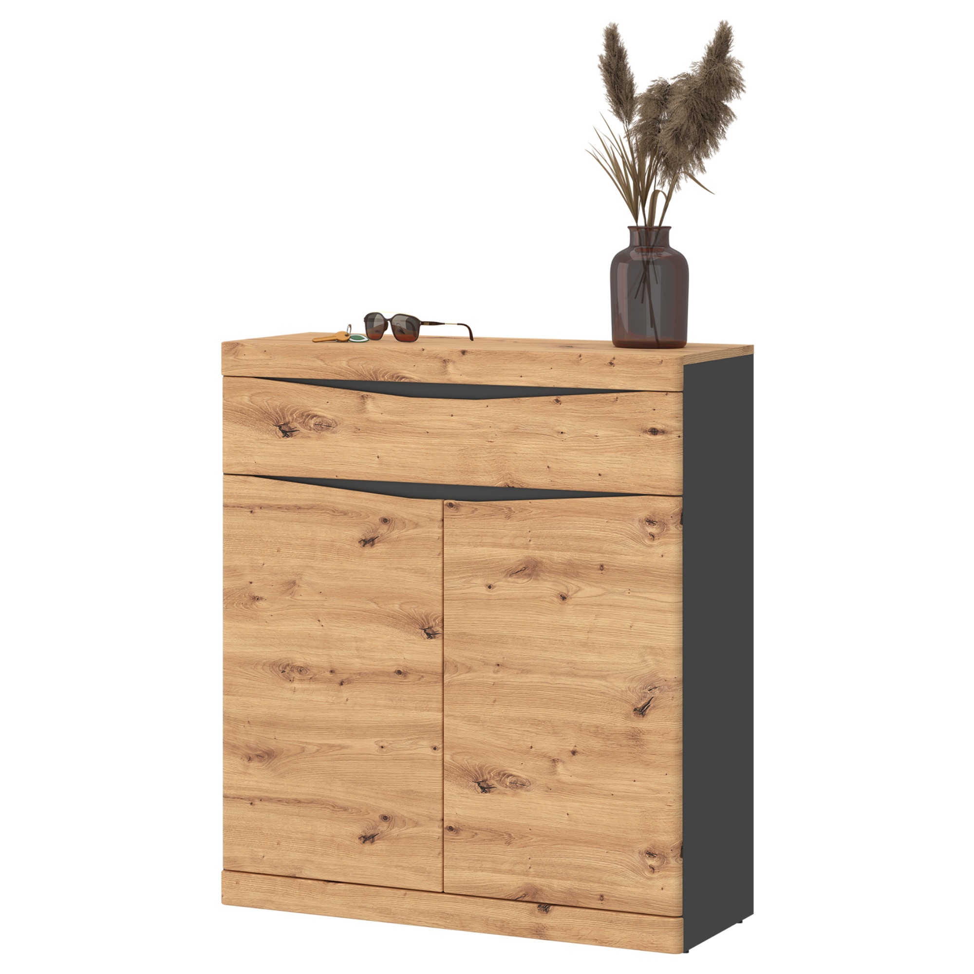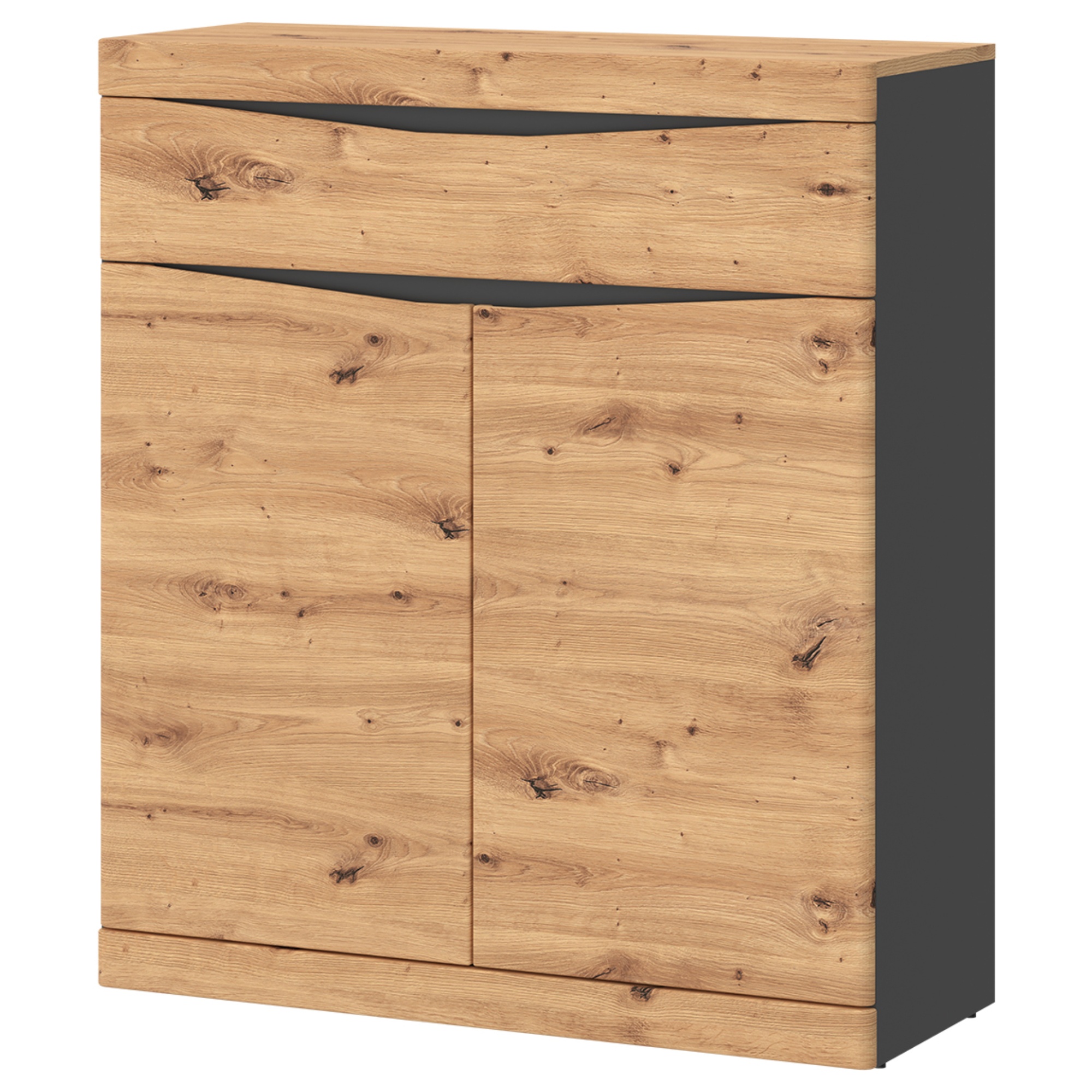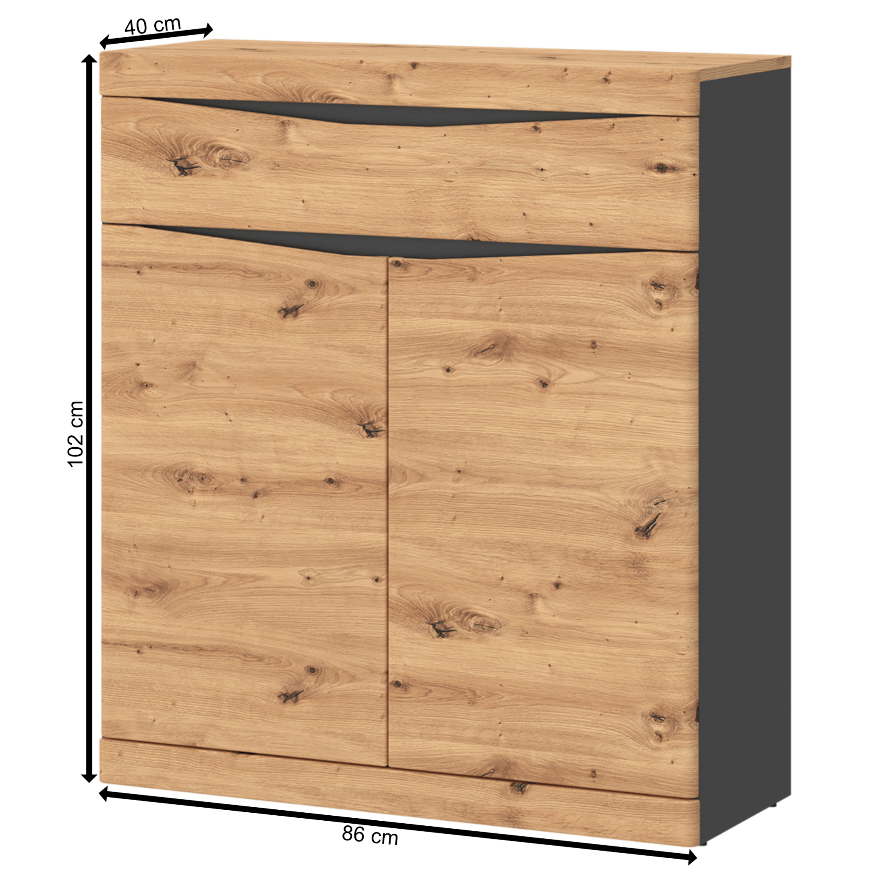 Elegantná komoda TURINO v minimalistickom dizajne, na ktorej vyniká výrazná drevená kresba v kombinácii s antracitovou farbou. Toto spojenie robí nábytok TURINO veľmi atraktívnym a vďaka tomu dokonale vyzdobí každý moderný interiér.
