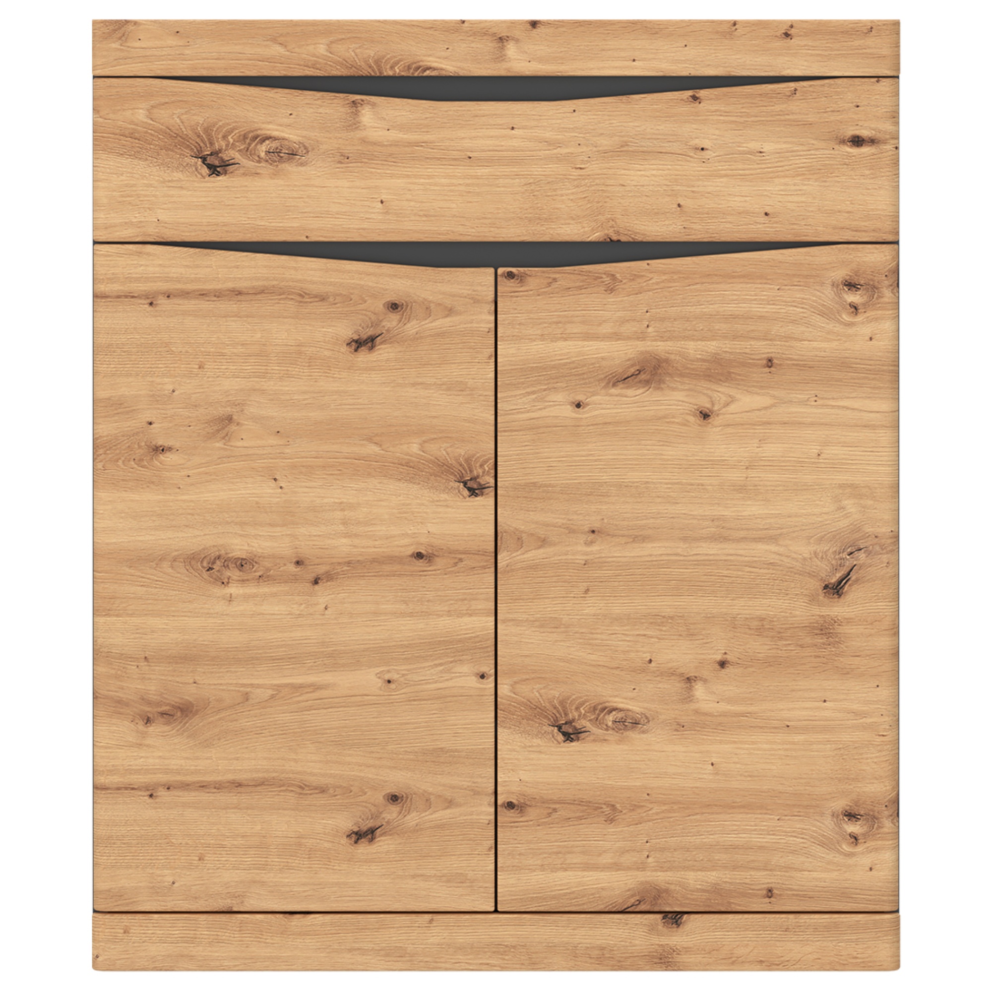 Úložný priestor sa skladá zo zásuvky a vnútorného priestoru s policami, takže všetko potrebné budete mať vždy pohromade. Manipuláciu dvierok a zásuviek vám navyše uľahčí mechanizmus nerušeného zatvárania SOFT CLOSE. Všetky predné plochy sú vyhotovené s funkčným otváraním bez rúčok. Celú konštrukciu podopierajú drobné plastové nôžky. Nábytok je navyše vybavený ABS hranami, ktoré znižujú riziko mechanického poškodenia. Povrch komody sa vám bude ľahko udržiavať.