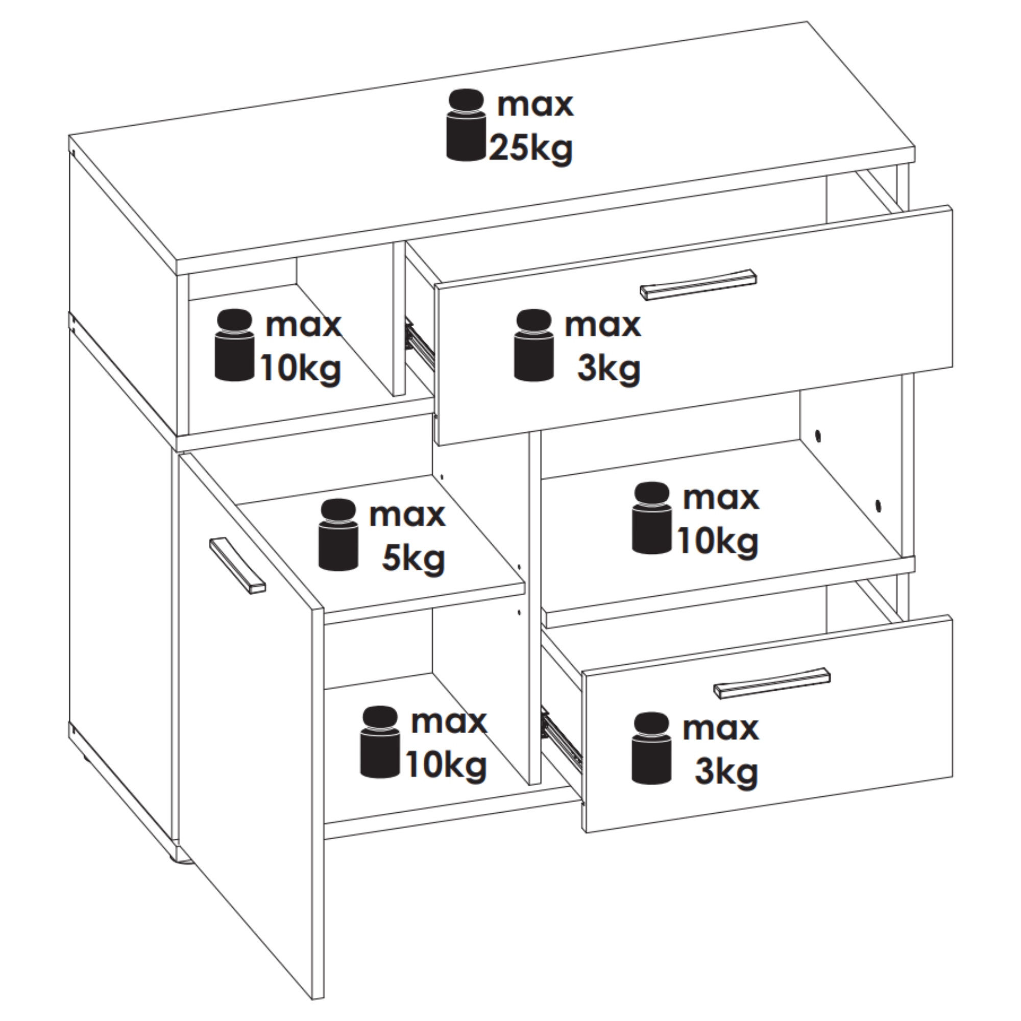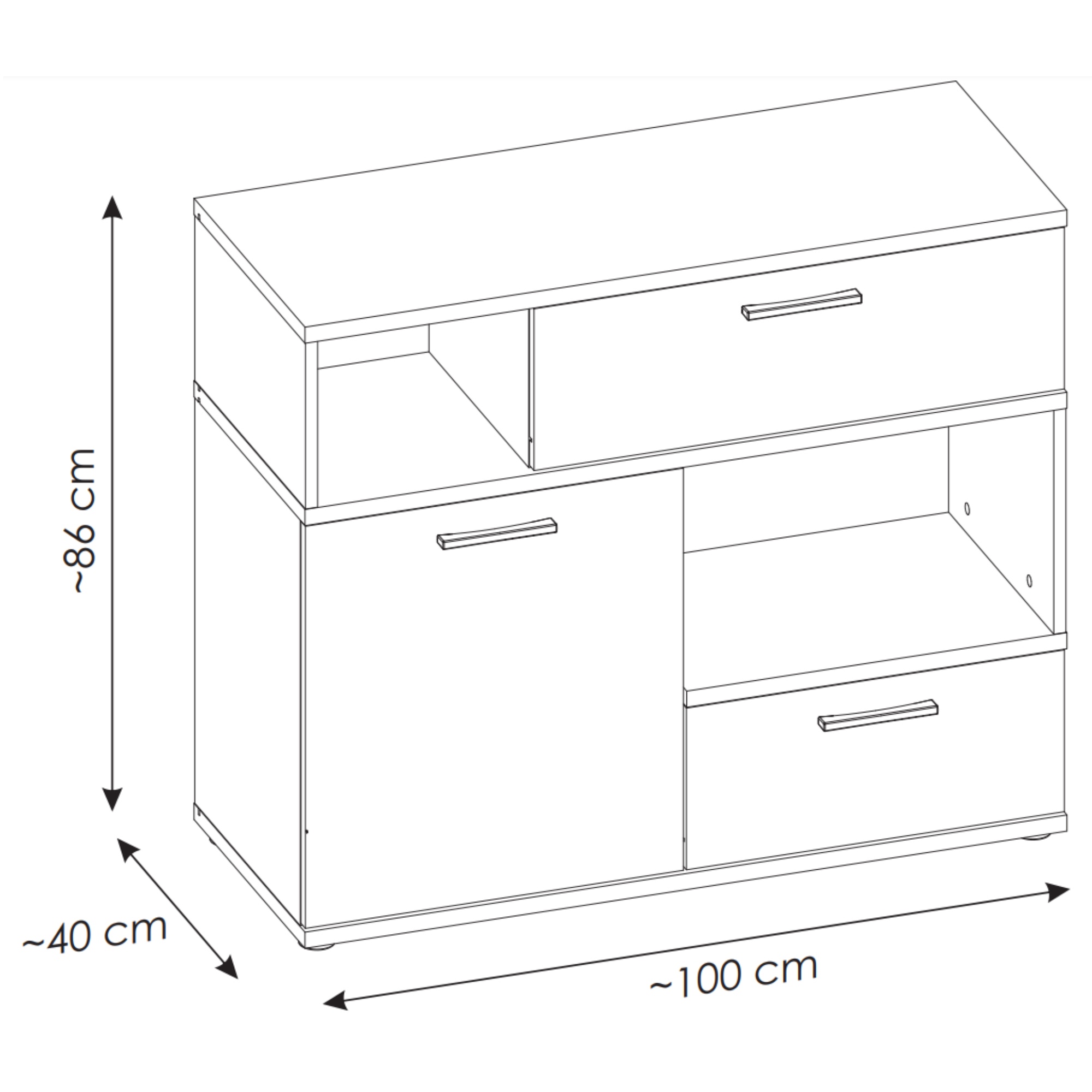 Úložný priestor zahŕňajú otvorené priehradky, jedna vnútorná polica za dvierkami a dve zásuvky. Manipulovať s dvierkami a zásuvkami vám navyše uľahčí mechanizmus tichého zatvárania SOFT CLOSE. Povrch komody sa vyznačuje jednoduchou údržbou.
