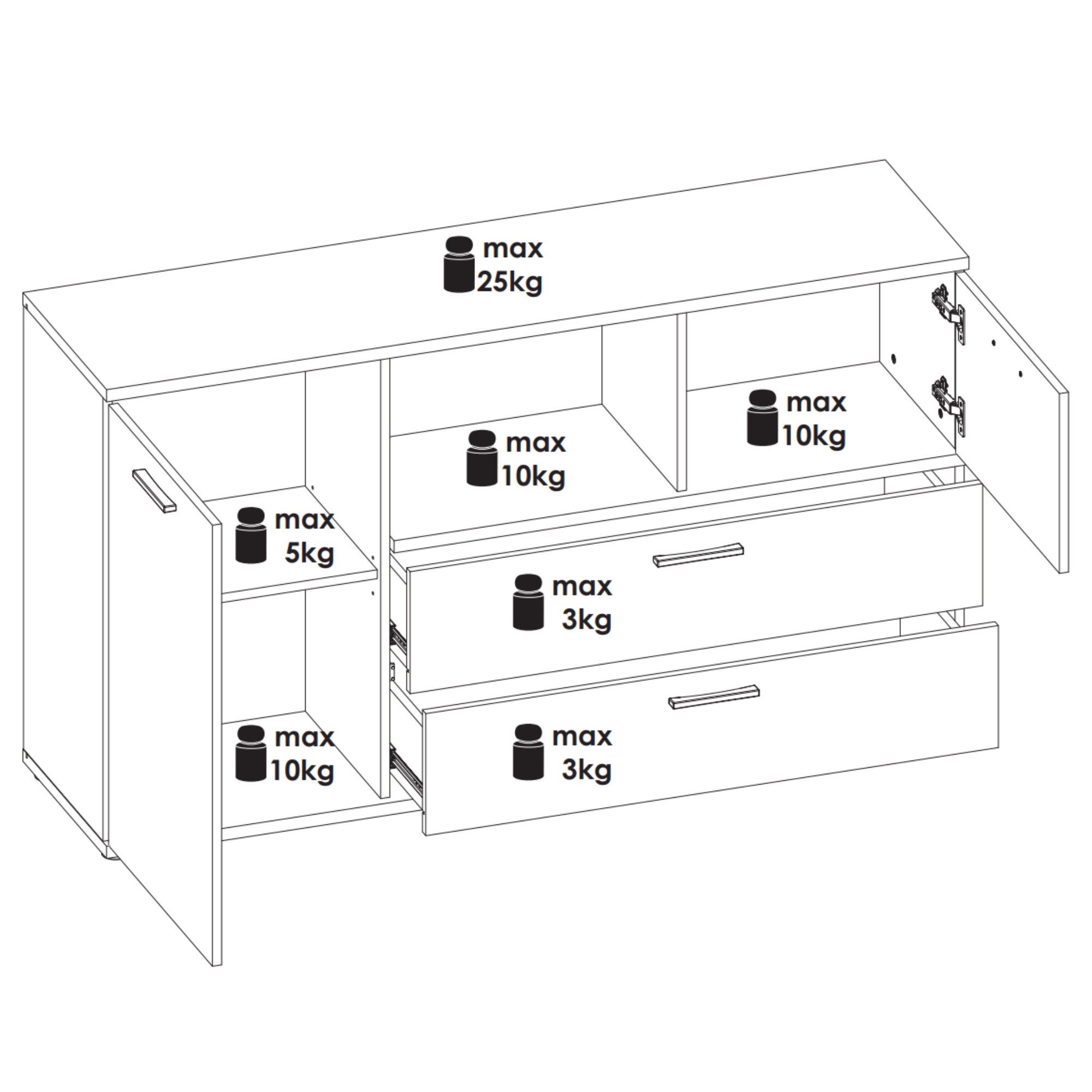Úložný priestor zahŕňajú otvorené priehradky, jedna vnútorná polica za dvierkami a dve zásuvky. Manipulovať s dvierkami a zásuvkami vám navyše uľahčí mechanizmus tichého zatvárania SOFT CLOSE. Povrch komody sa vyznačuje jednoduchou údržbou.