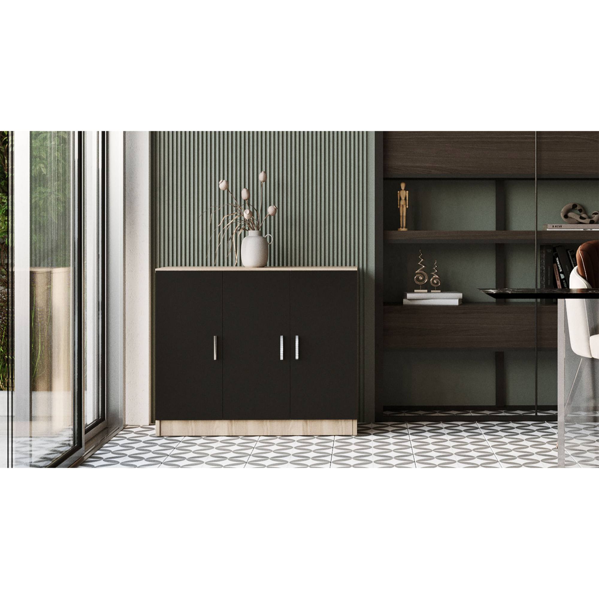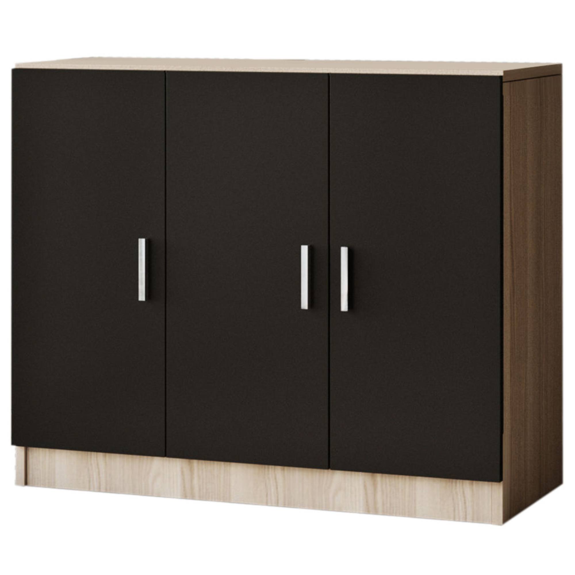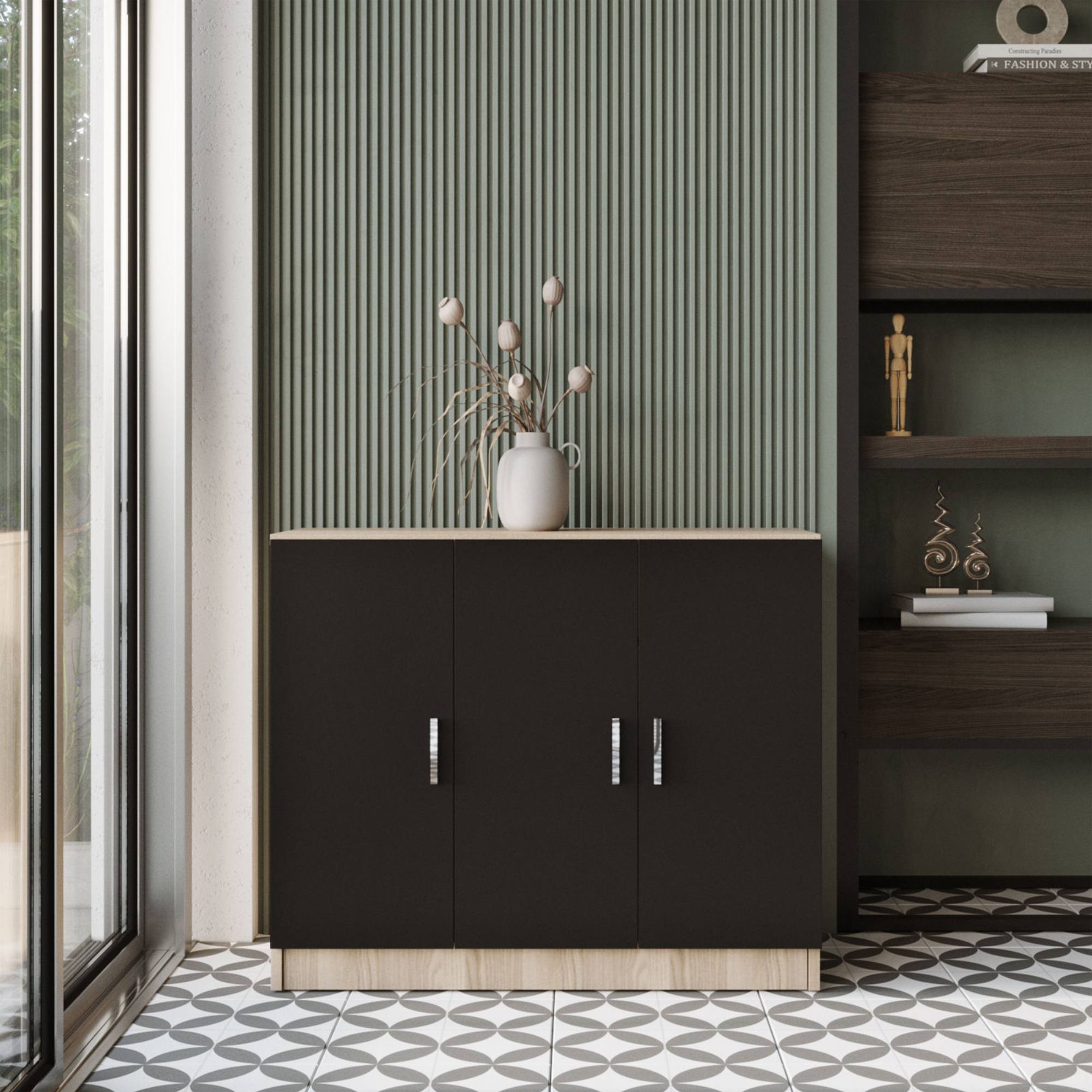 Komoda VARIO je praktický úložný priestor, ktorý sa vďaka svojmu dizajnu hodí takmer do akéhokoľvek interiéru. Svoje miesto nájde v obývacej izbe, spálni, ale aj v predsieni. K dispozícii máte vnútorný úložný priestor, rozdelený do dvoch častí, ktorý je chránený troma dvierkami. Vnútri ďalej nájdete dve vložené police. Celkovú manipuláciu dvierok vám uľahčia decentné rúčky. Na vystavenie rôznych dekorácii či vecí, ktoré chcete mať stále na očiach využijete hornú dosku komody. Jej povrch sa vám bude ľahko udržiavať.