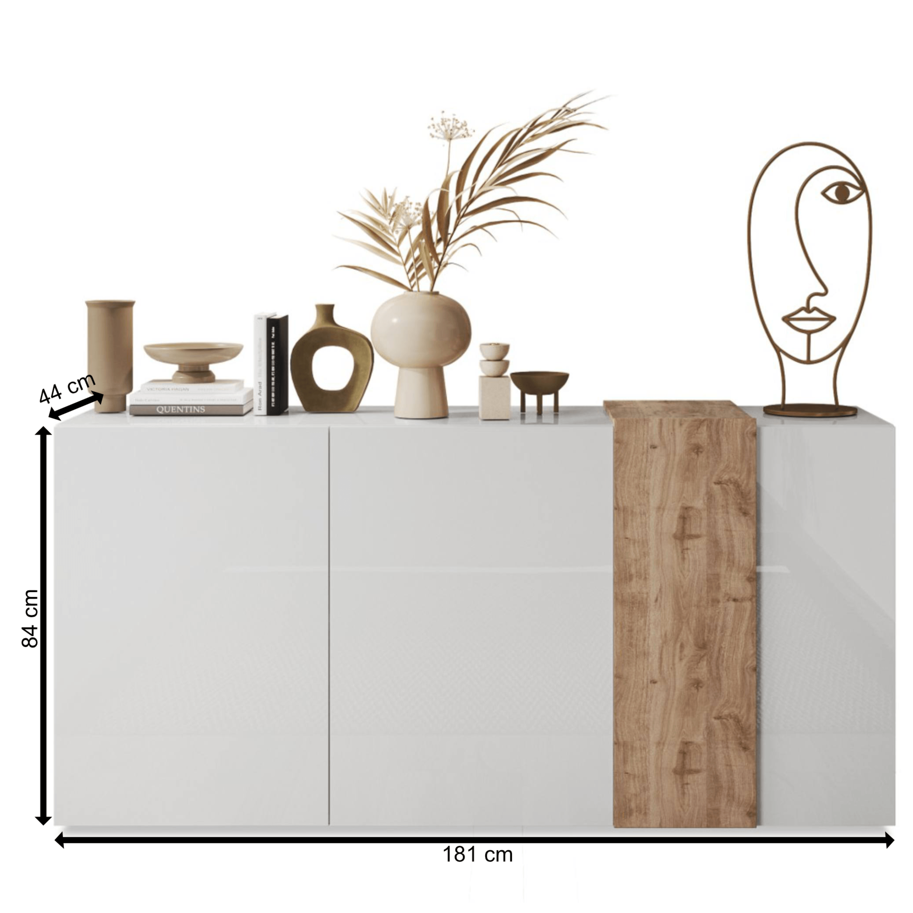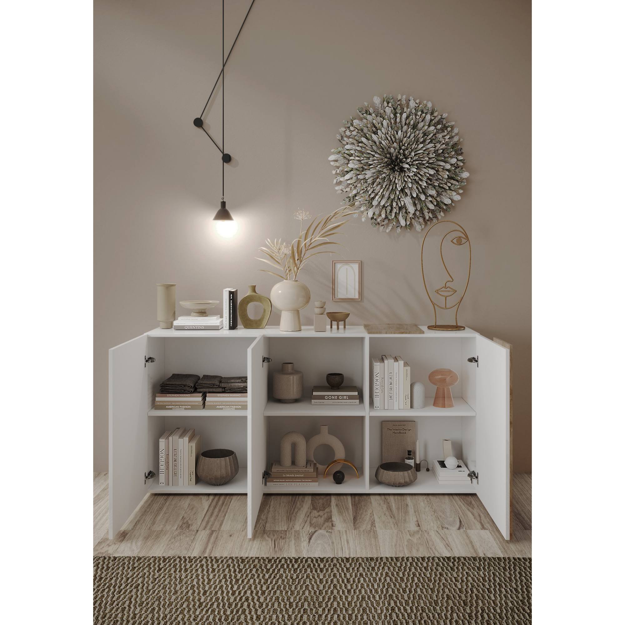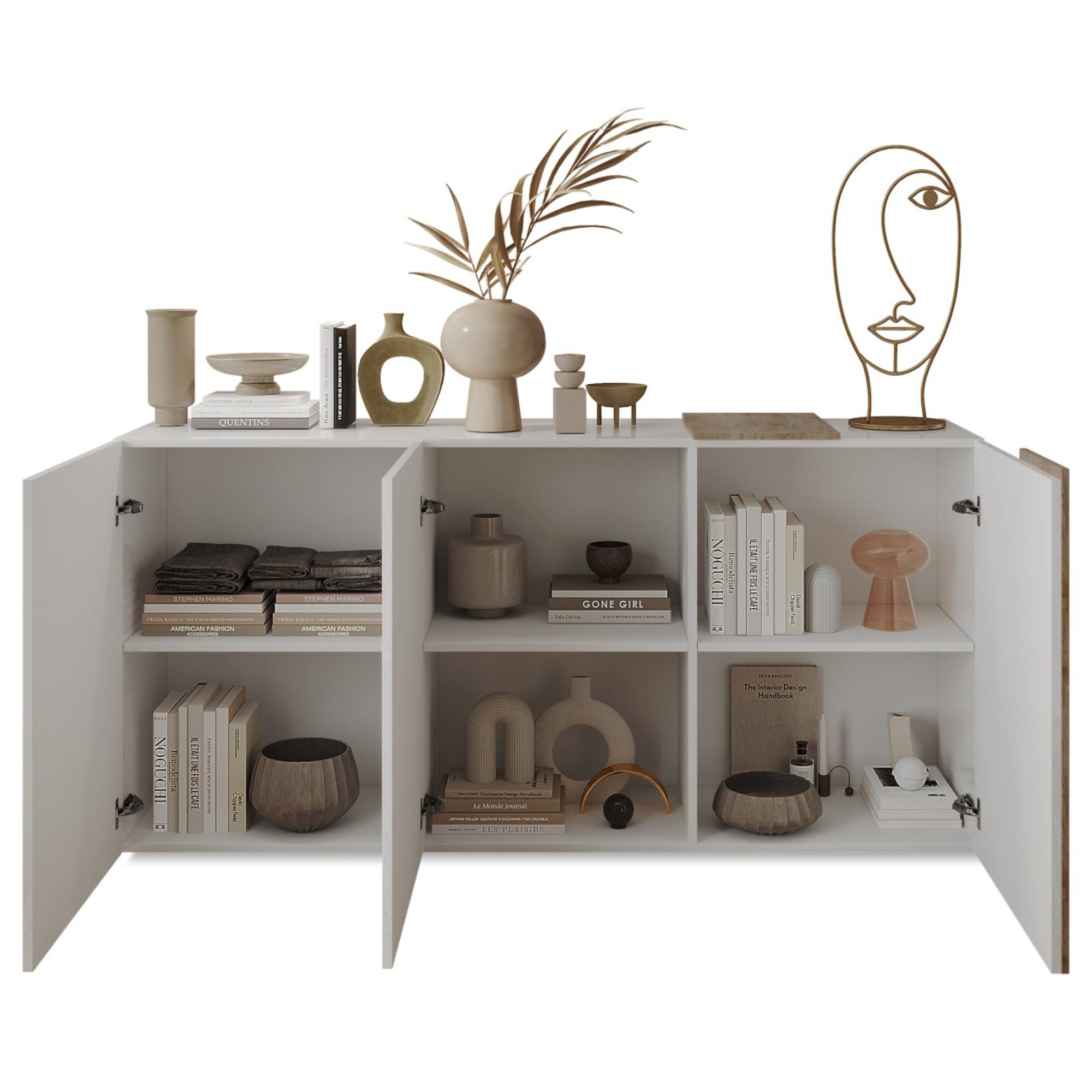 Komoda disponuje tromi vloženými policami, kam môžete uložiť všetko, čo nechcete mať priamo na očiach. Na celkovom čistom vzhľade pridáva bezrúčkové vyhotovenie. Laminovaný drevený materiál sa vám bude ľahko udržiavať.