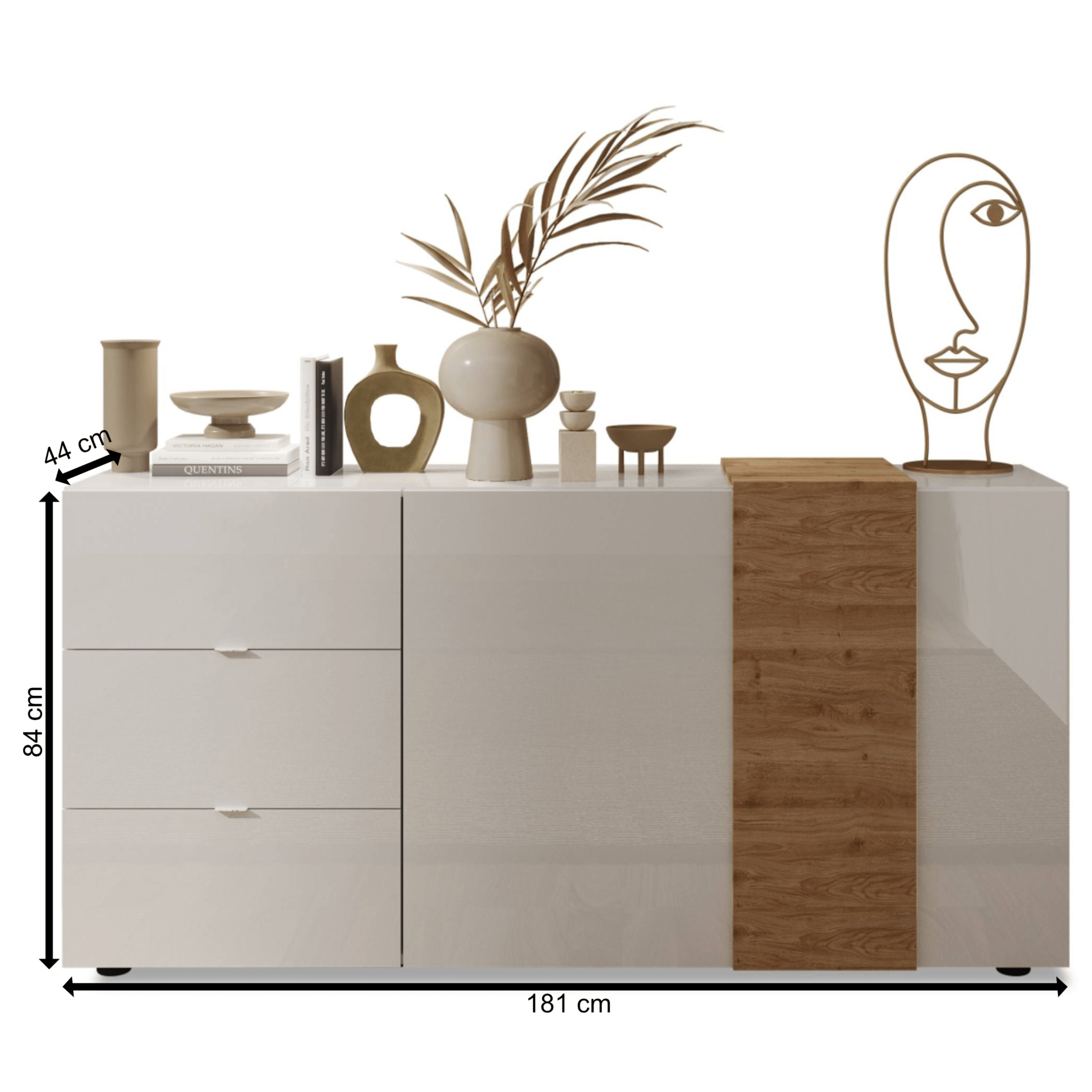 Komoda disponuje tromi zásuvkami a dvoma vloženými policami, kam môžete uložiť všetko, čo nechcete mať priamo na očiach. Na celkovom čistom vzhľade pridáva bezrúčkové vyhotovenie. Laminovaný drevený materiál sa vám bude ľahko udržiavať.