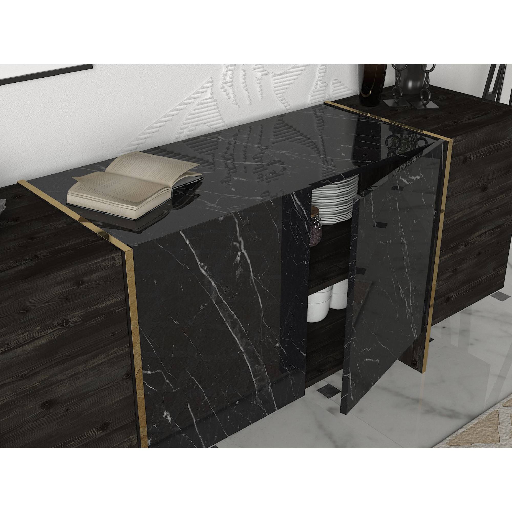 Vyrobená je z laminovaného dreveného materiálu, pre ktorý je typická ľahká udržiavateľnosť aj dlhá životnosť. Bočná oblasť a okrajové časti sú odeté do dekora dreva tmavohnedej farby, zatiaľ čo prostredná časť a predná plocha dvierok imitujú mramorovú dosku – tá komode dodáva kontrastný rozmer a interiéru punc luxusu. Mramorová oblasť je navyše po stranách lemovaná zlatými prstencami, ktoré v spodnej časti prirodzene prechádzajú do stabilnej podnože.