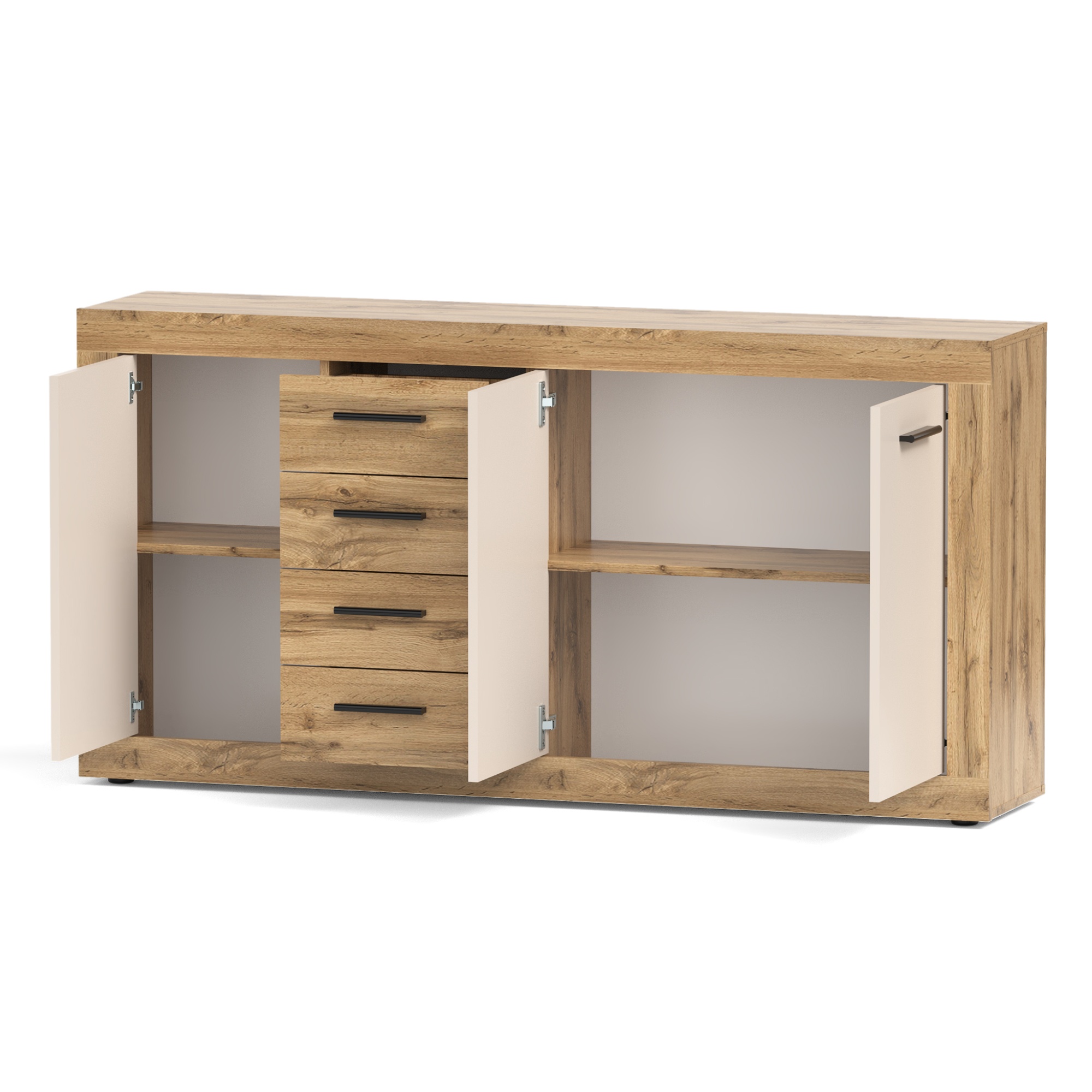 Za jej dvierkami sa nachádzajú 2 vložené police, na ktoré si môžete prehľadne uložiť všetko, čo sa dovnútra komody rozhodnete umiestniť. Nechýbajú ani 4 zásuvky. Aby sa s dvierkami a zásuvkami dobre manipulovalo, sú vybavené rúčkami.