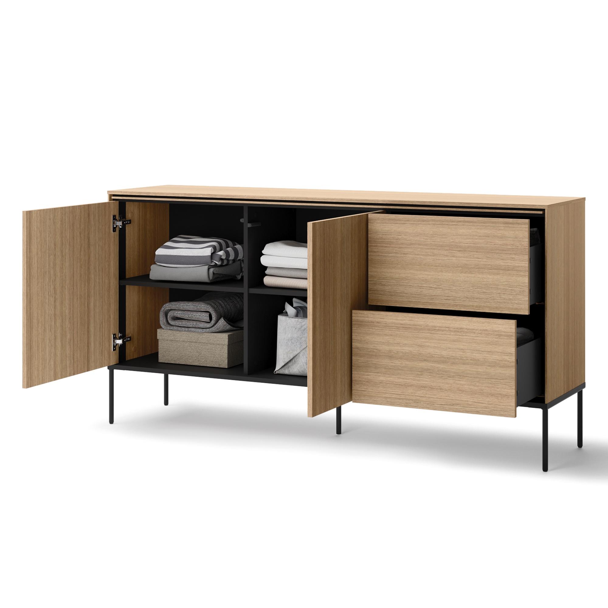 Komoda poskytuje dostatok úložného priestoru, vďaka čomu skvele poslúži aj vo vašej domácnosti. Okrem 2 vložených políc umiestnených za dvierkami disponuje aj 2 zásuvkami, do ktorých si môžete prehľadne uložiť rôzne drobnosti.