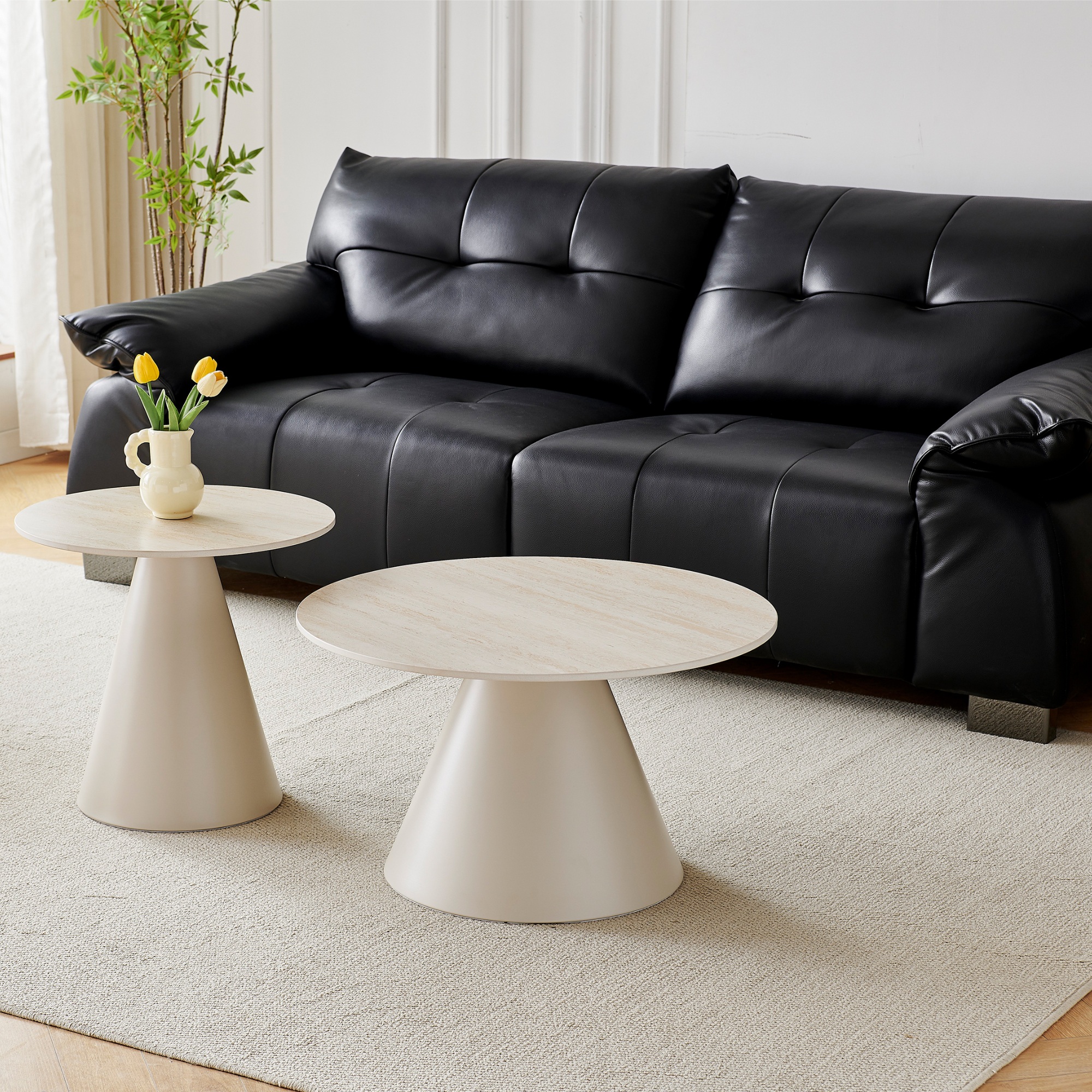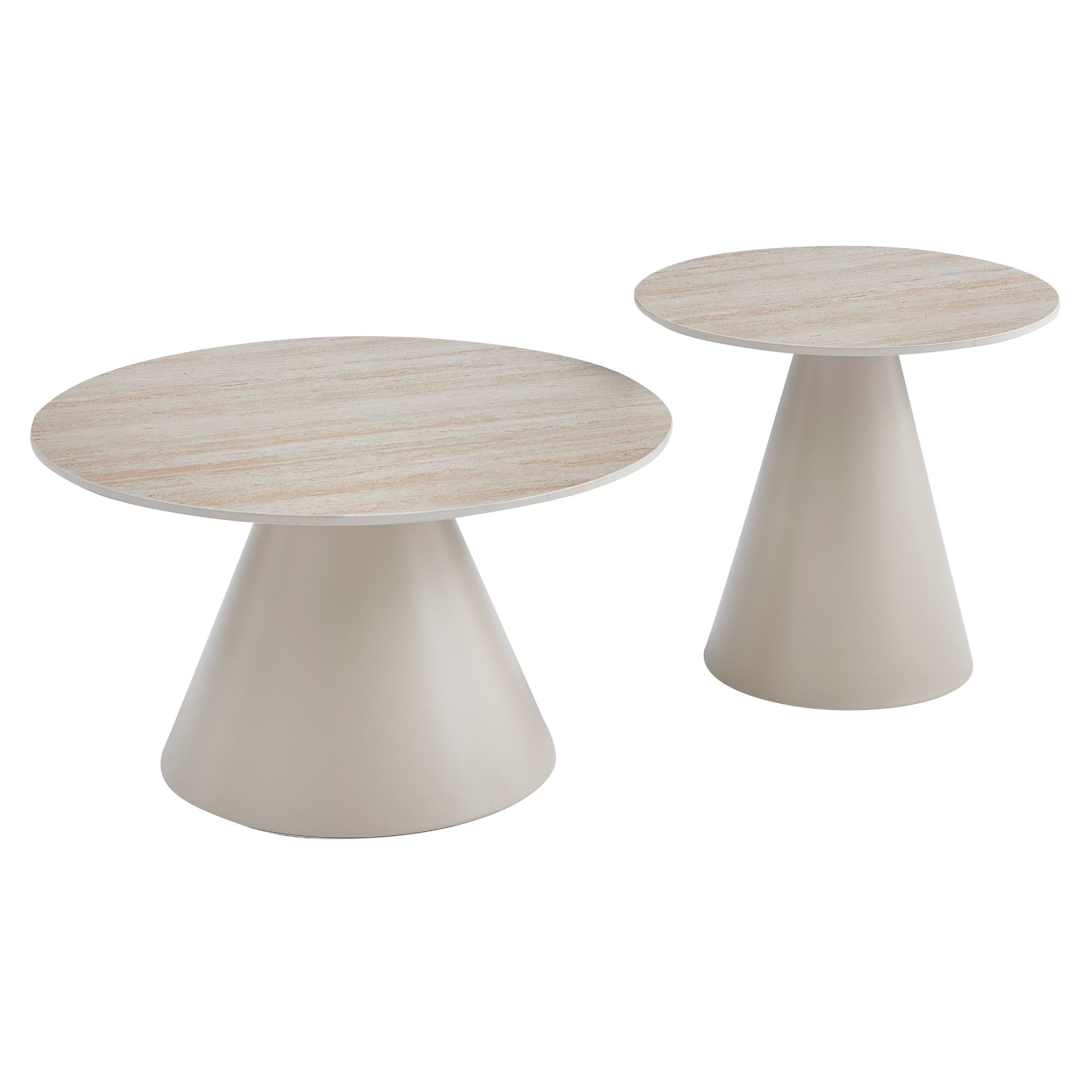 Dosky stolov s priemermi 70 a 50 cm sú vyrobené z kvalitnej keramiky, ktorá dodáva stolíkom luxusný vzhľad a zaisťuje ľahkú údržbu. Podnože sú z pevného kovu v tvare kužeľa, čo poskytuje stabilitu a zároveň z nich robí zaujímavý dizajnový prvok.
