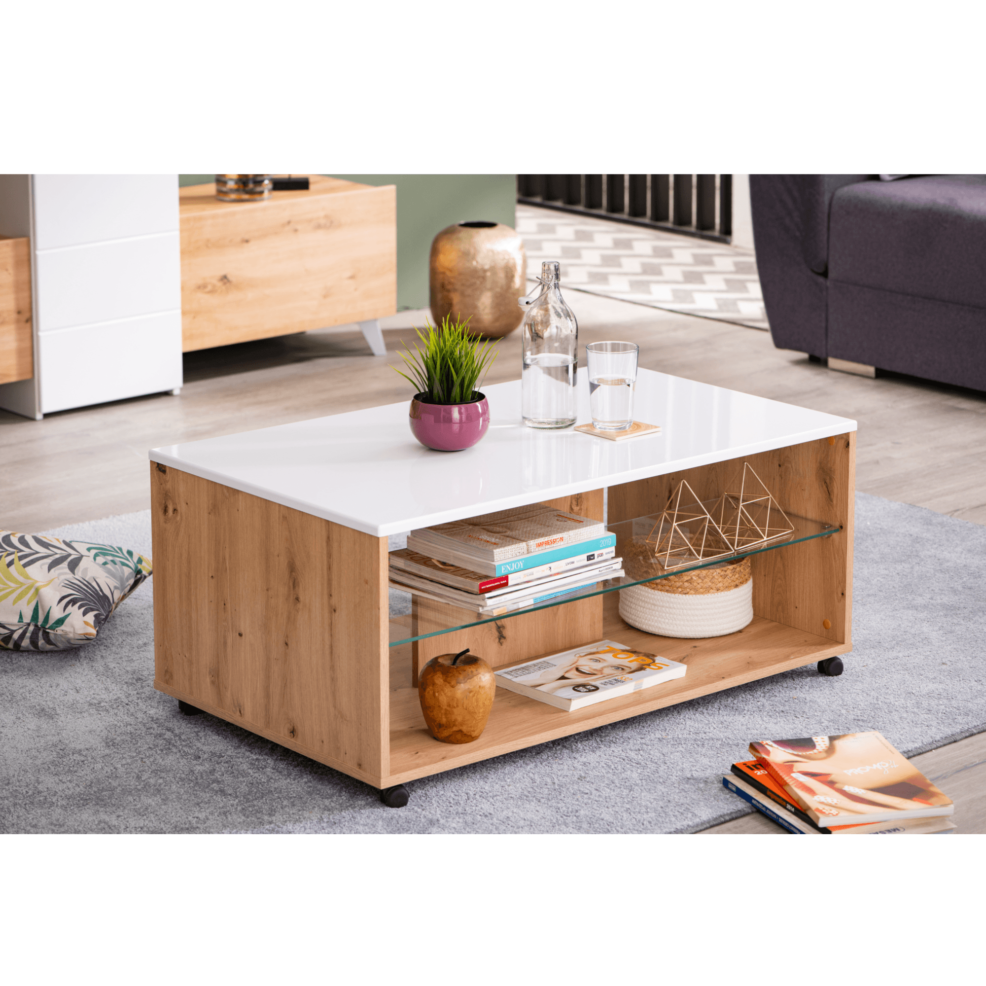Konferenčný stolík BARNABY - dub artisan/biela vysoký lesk
