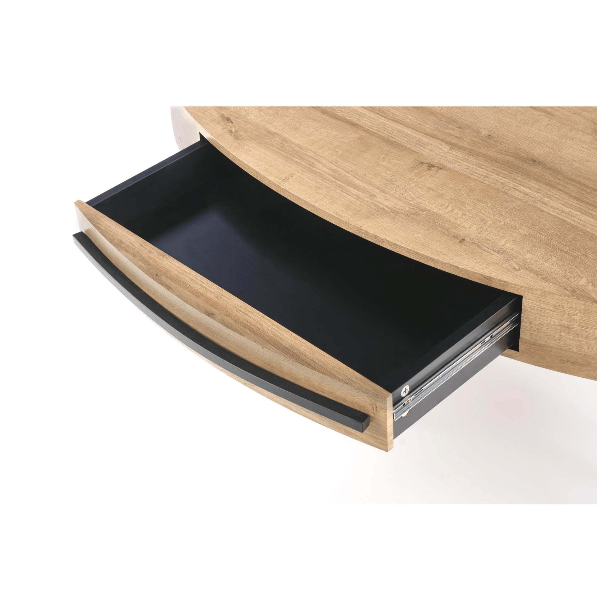 Hlavná oválna doska je vyrobená z kombinácie drevovláknitého materiálu MDF a dyhy. Ladená je do dekora duba zlatého v prírodnom odtieni. Maximálnu stabilitu zaisťuje kovová podnož v čiernom práškovom laku. Stolík disponuje praktickou zásuvkou s čiernou rúčkou.