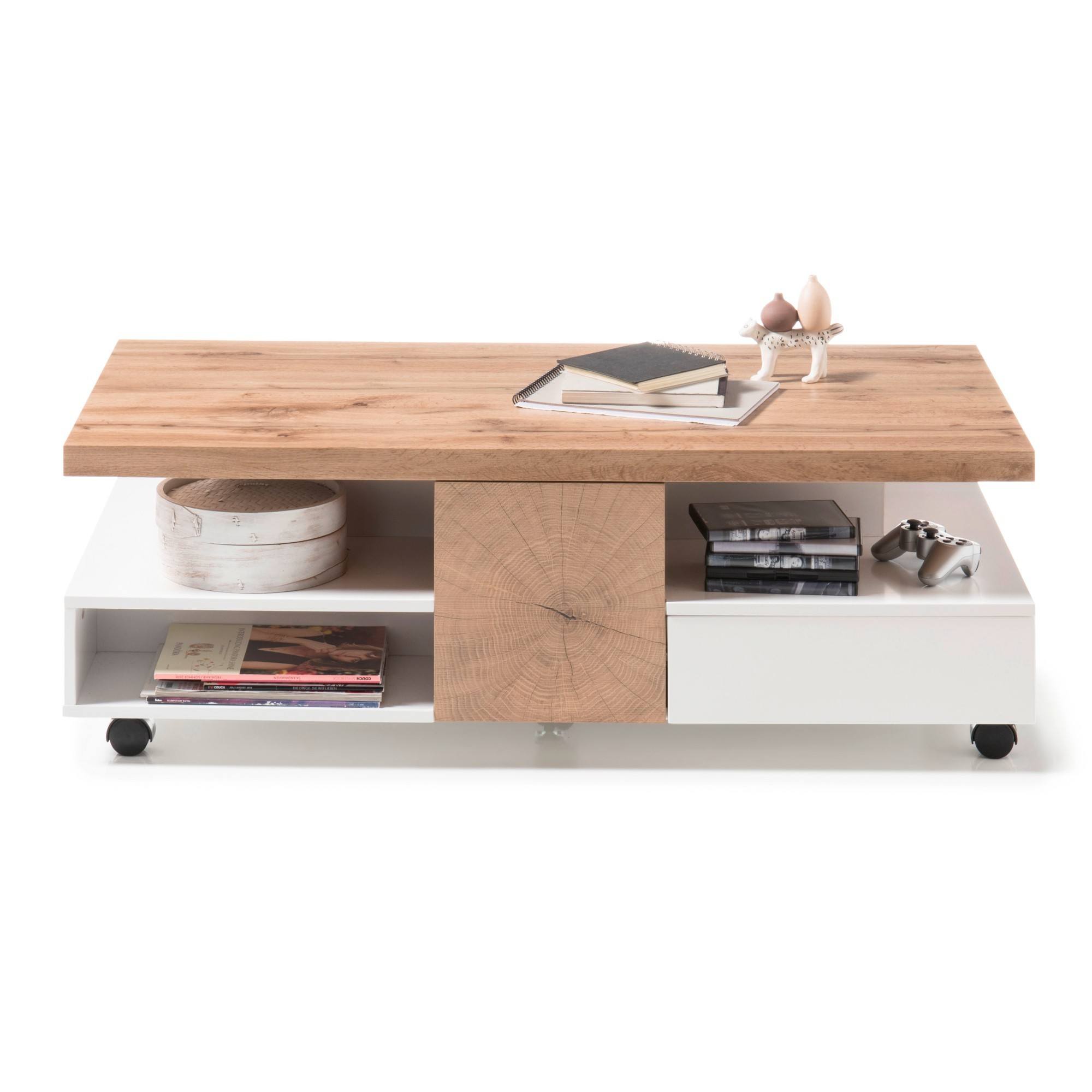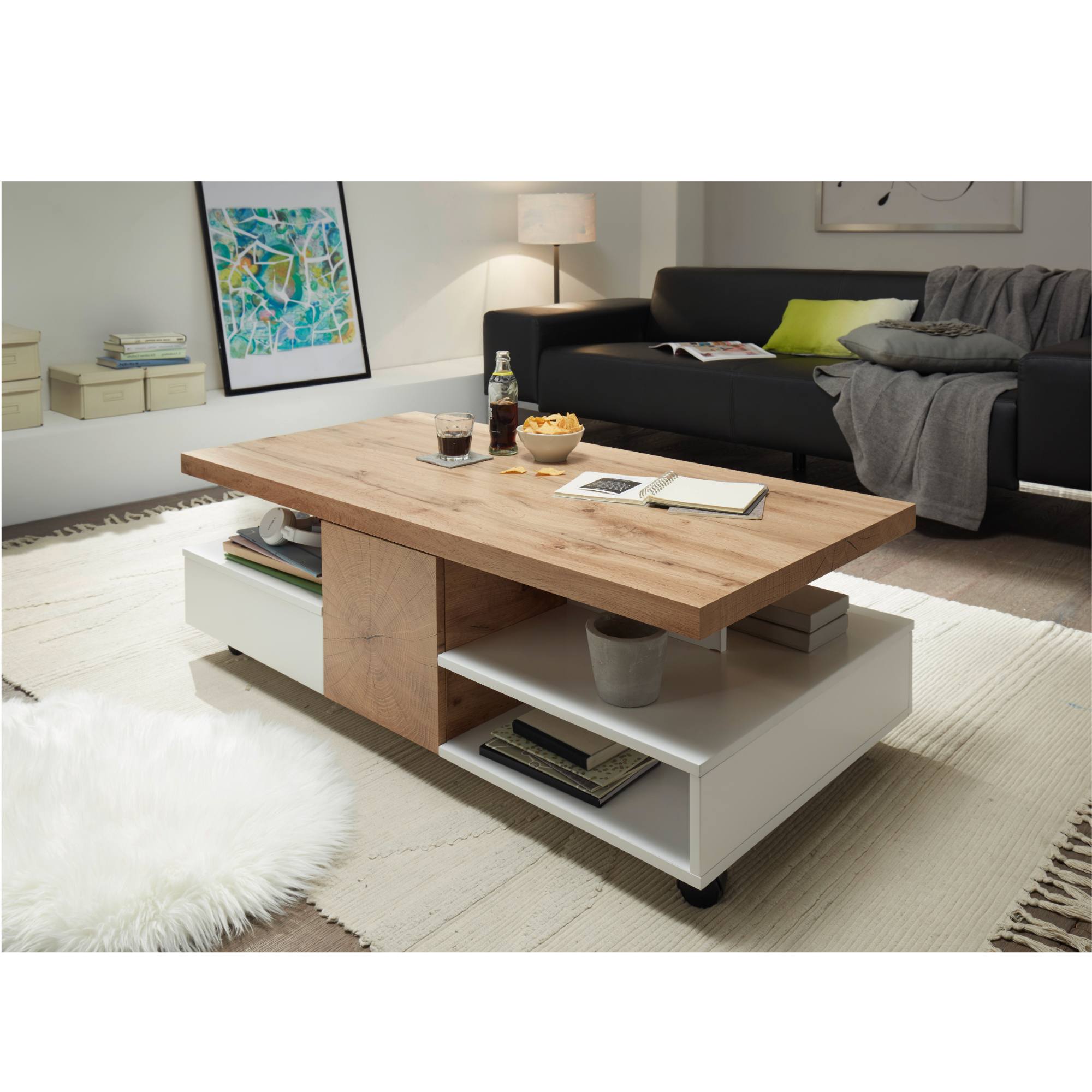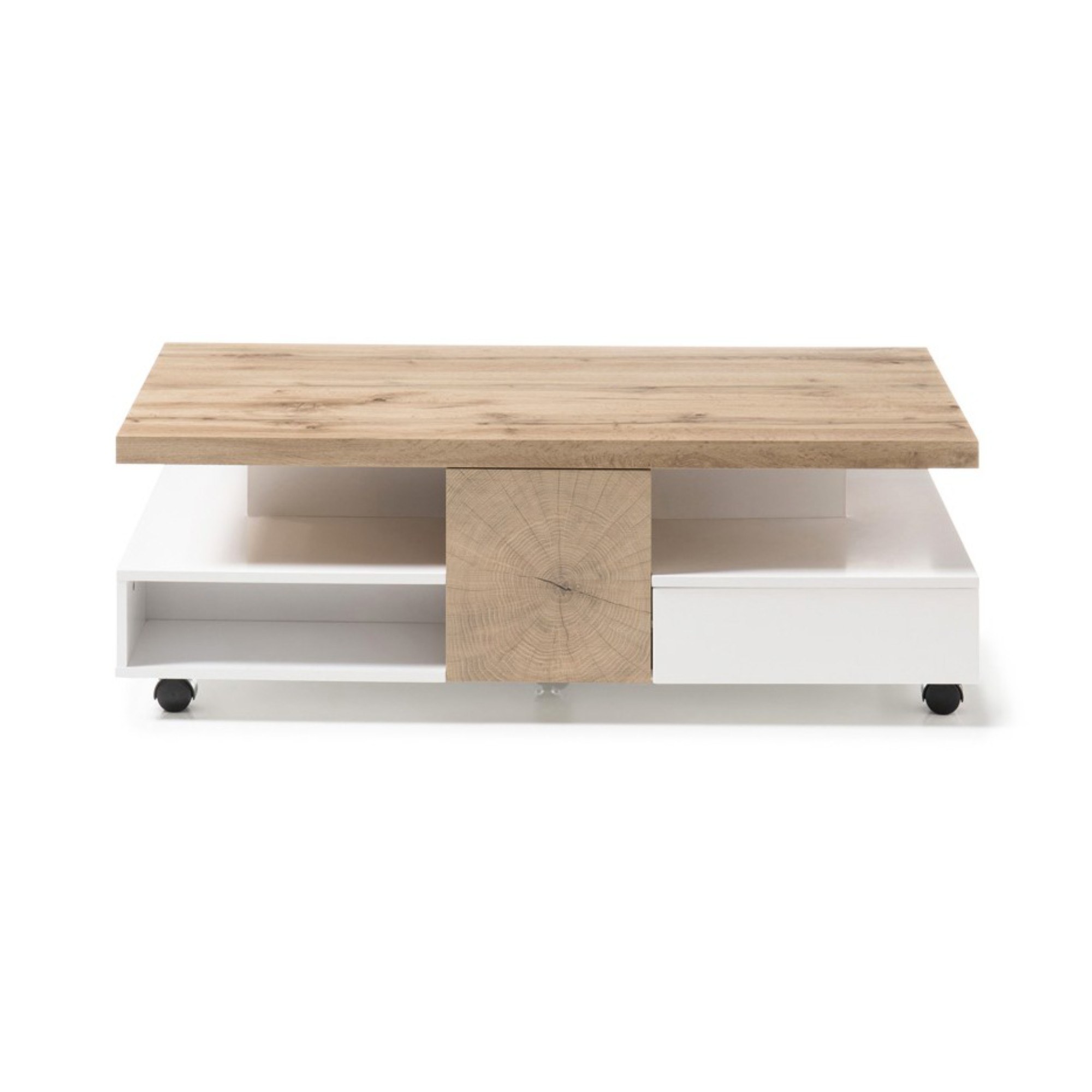 Konferenčný stolík CREVIN disponuje elegantným dizajnom a vysokou funkčnosťou. Pevná konštrukcia z lakovanej MDF je doplnená laminovanou doskou v dekore duba. Vnútri korpusu sa nachádza úložný priestor v podobe 2 zásuviek, 2 dvierok a police.