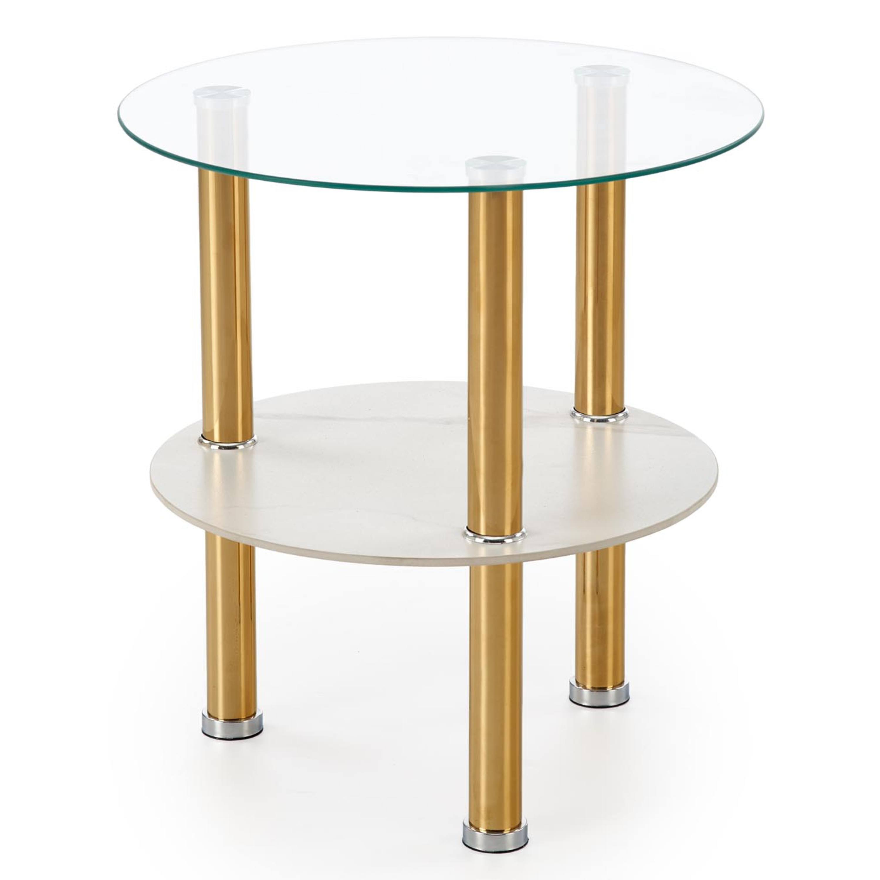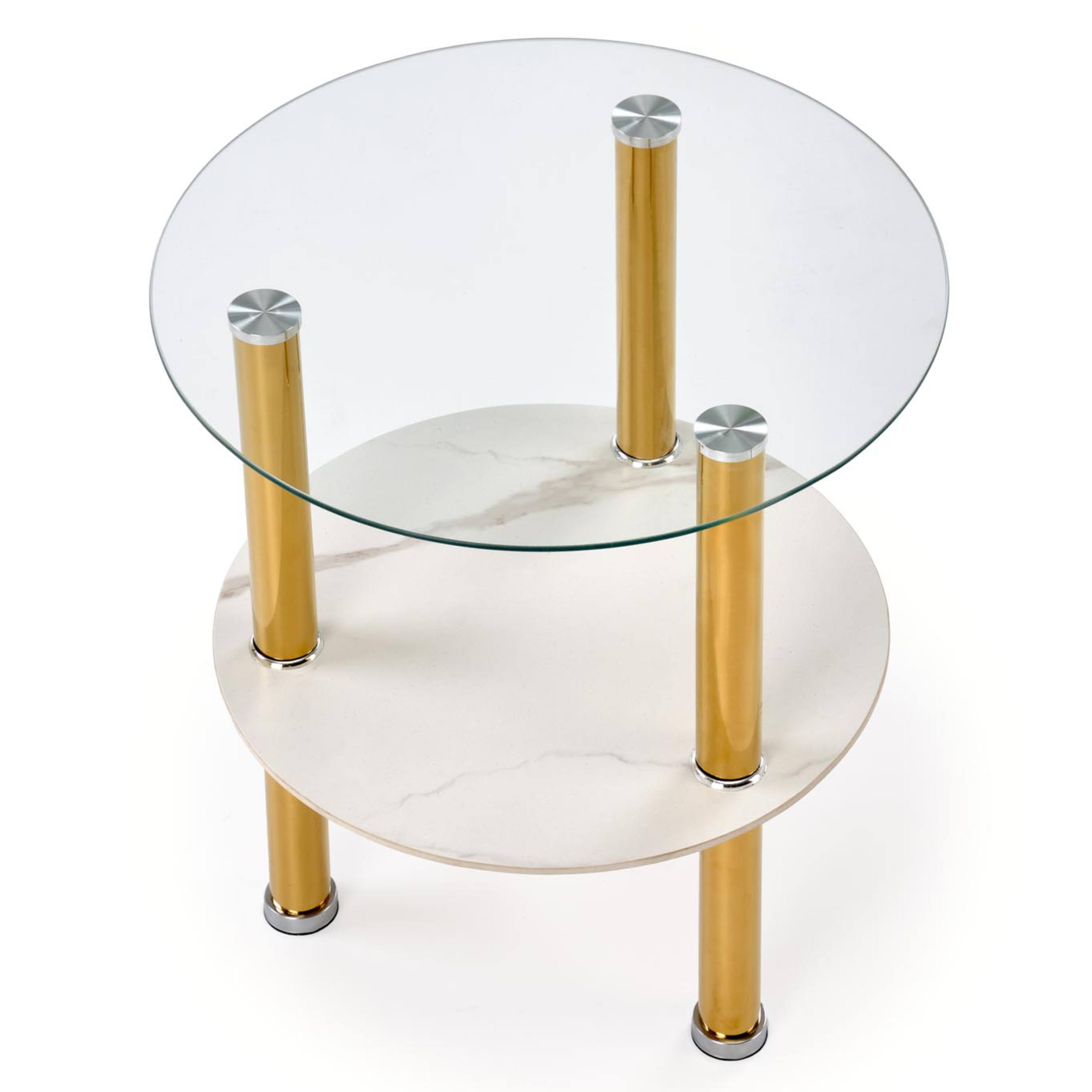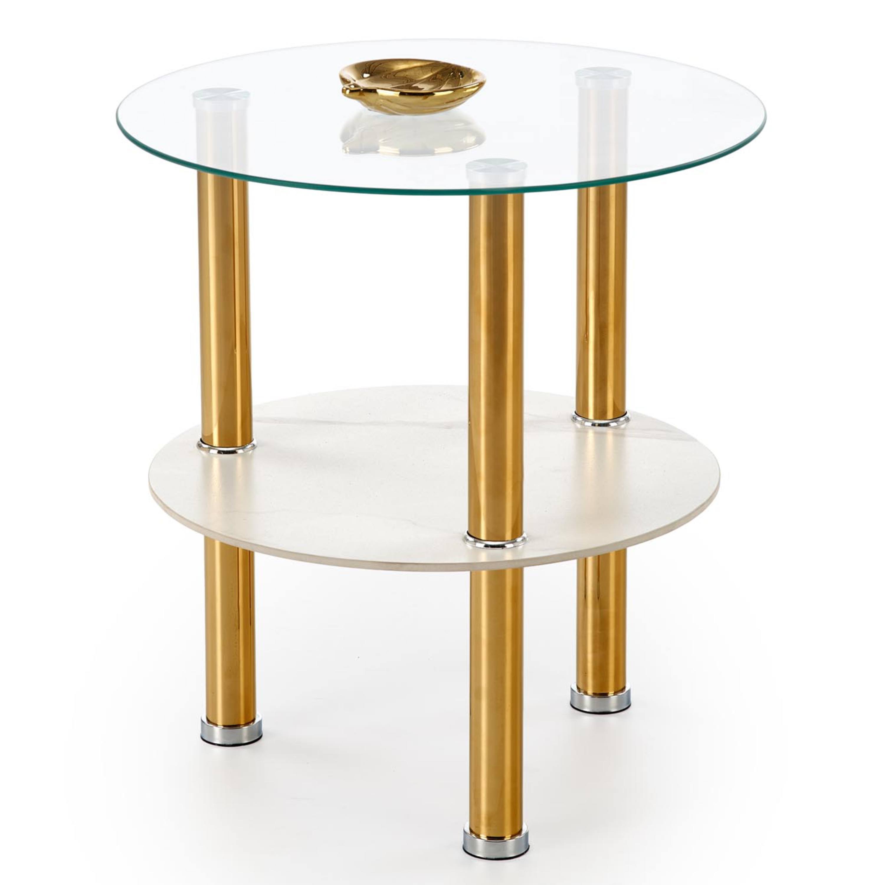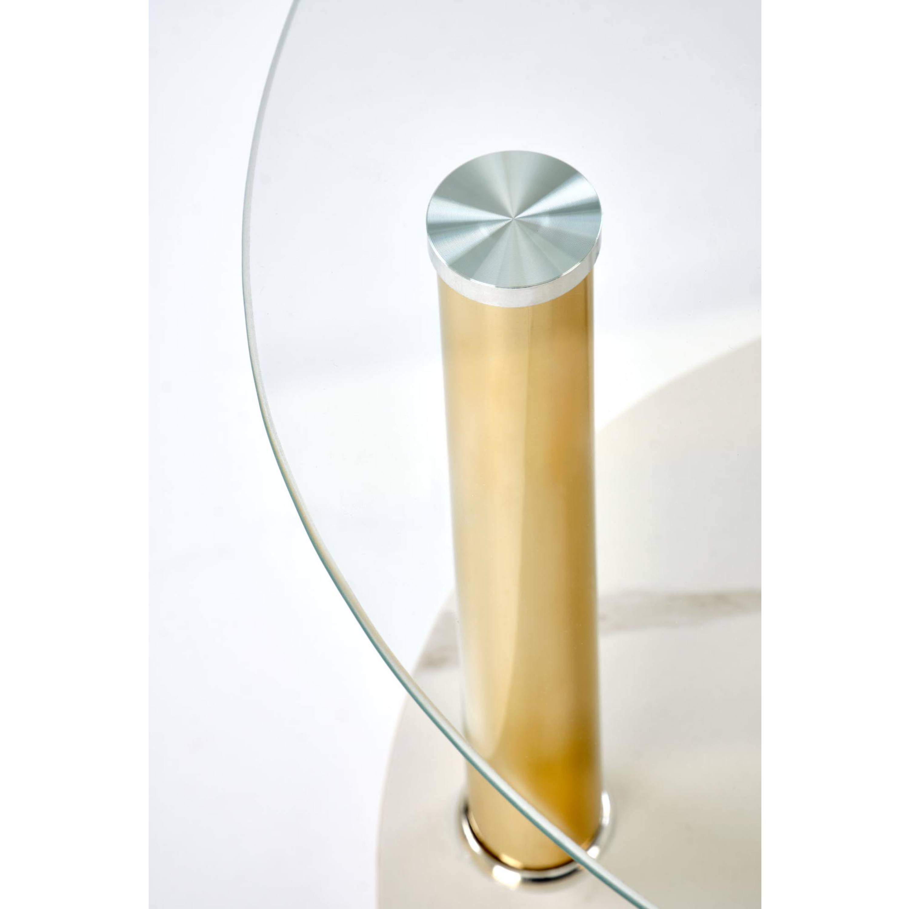 Vrchná doska je vyrobená z priehľadného skla, ktoré opticky odľahčí priestor. Spodná doska v dekore bieleho mramoru pôsobí luxusným dojmom a zároveň poskytuje praktický odkladací priestor. Konštrukcia z chrómovanej ocele vo výraznej zlatej farbe zabezpečuje potrebnú pevnosť a stabilitu a zároveň dodáva stolíku exkluzívny vzhľad.