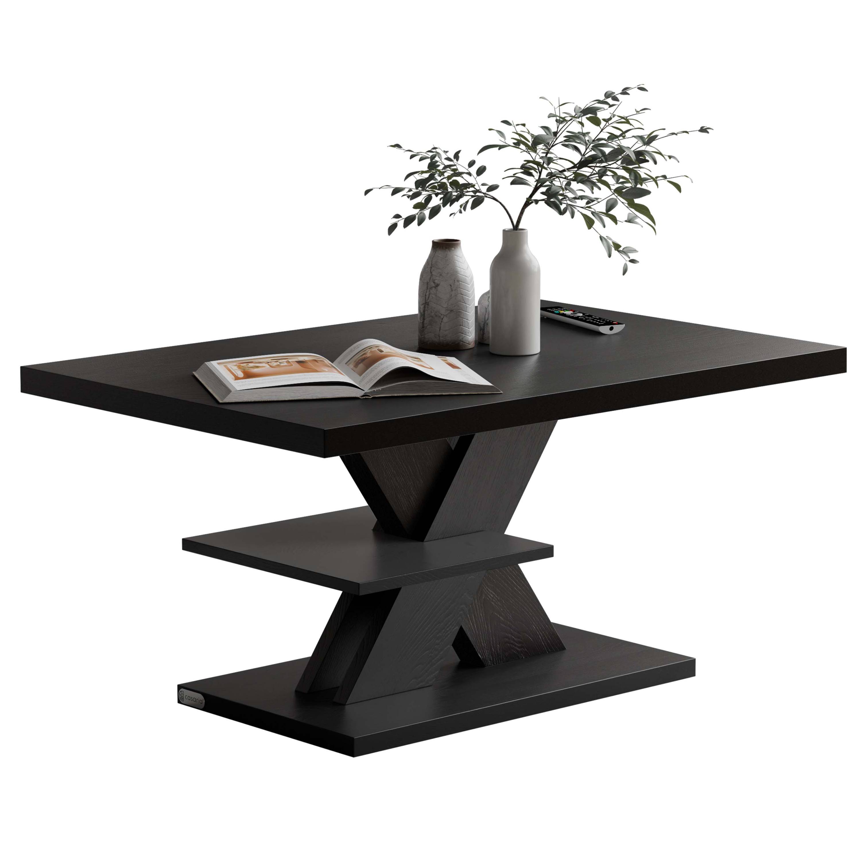 Obdĺžniková doska stolíka pôsobí robustným a stabilným dojmom, zatiaľ čo podnož v tvare X dodáva stolíku originálny vzhľad a zároveň zabezpečuje pevnú oporu. Veľkorysá doska poskytuje dostatok priestoru na odloženie kníh, časopisov, dekorácií alebo drobného občerstvenia. Praktická odkladacia polica v spodnej časti ponúka ďalšie miesto na uloženie vecí, ktoré chcete mať vždy po ruke. Protišmykové nožičky zároveň chránia podlahu pred poškriabaním. Stolík je vyrobený z drevotriesky s povrchom, ktorý sa jednoducho udržiava a odpudzuje vodu, čo prispieva k jeho dlhej životnosti a praktickosti.