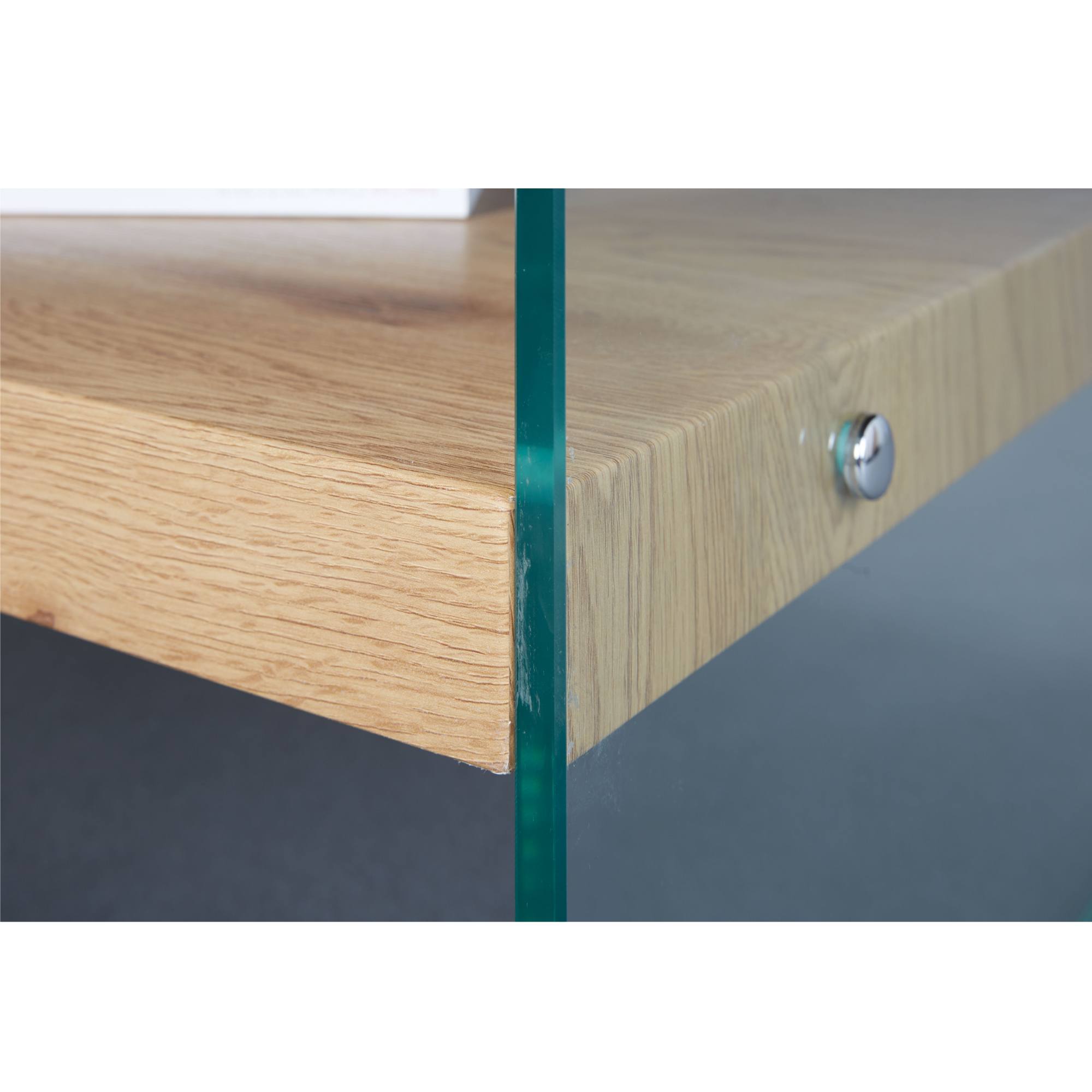 Moderný všestranný konferenčný stolík FESTINA vás zaujme svojim dizajnom a sklenenými bočnicami. Doska stola a odkladacia polica je vyrobená z MDF materiálu, ktorý je v dekore divokého duba a ponúka dostatok priestoru na vaše veci. Bočnice stola FESTINA sú vyrobené z bezpečnostného skla.