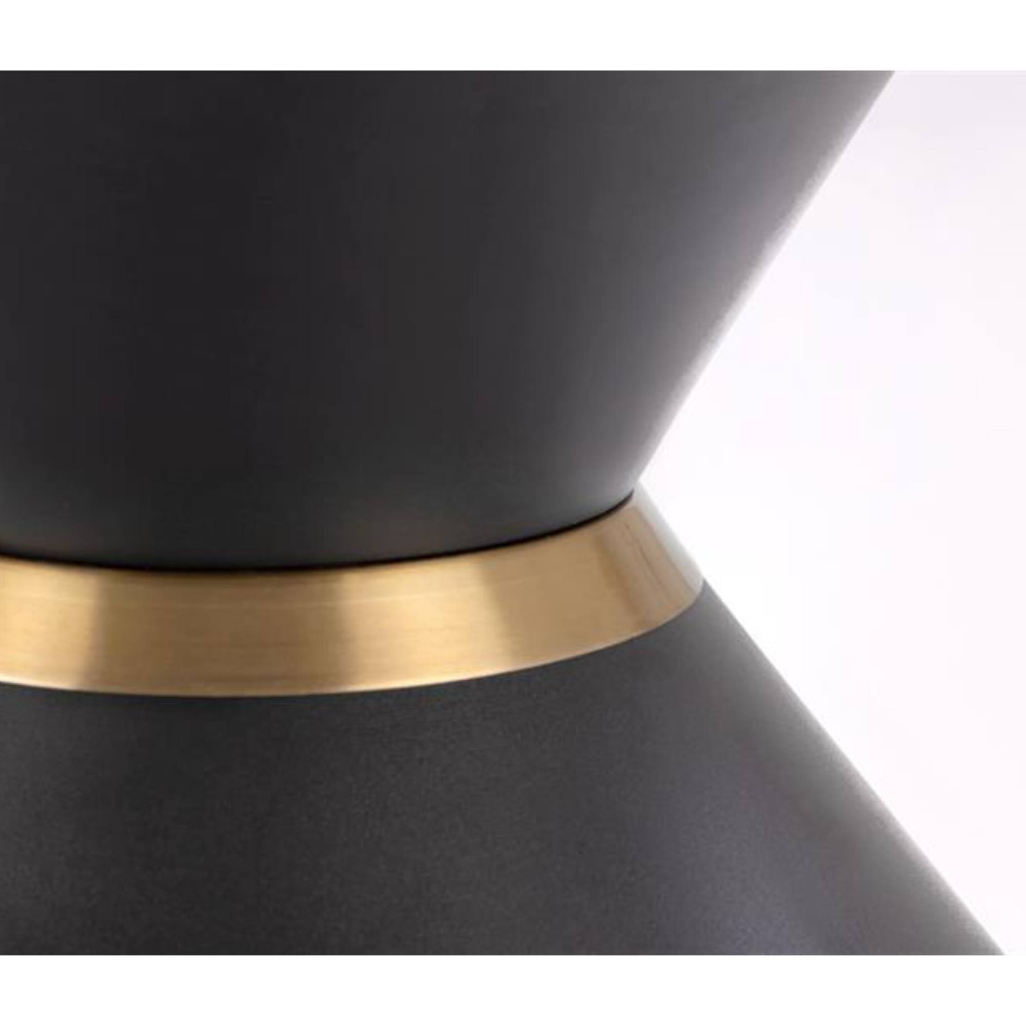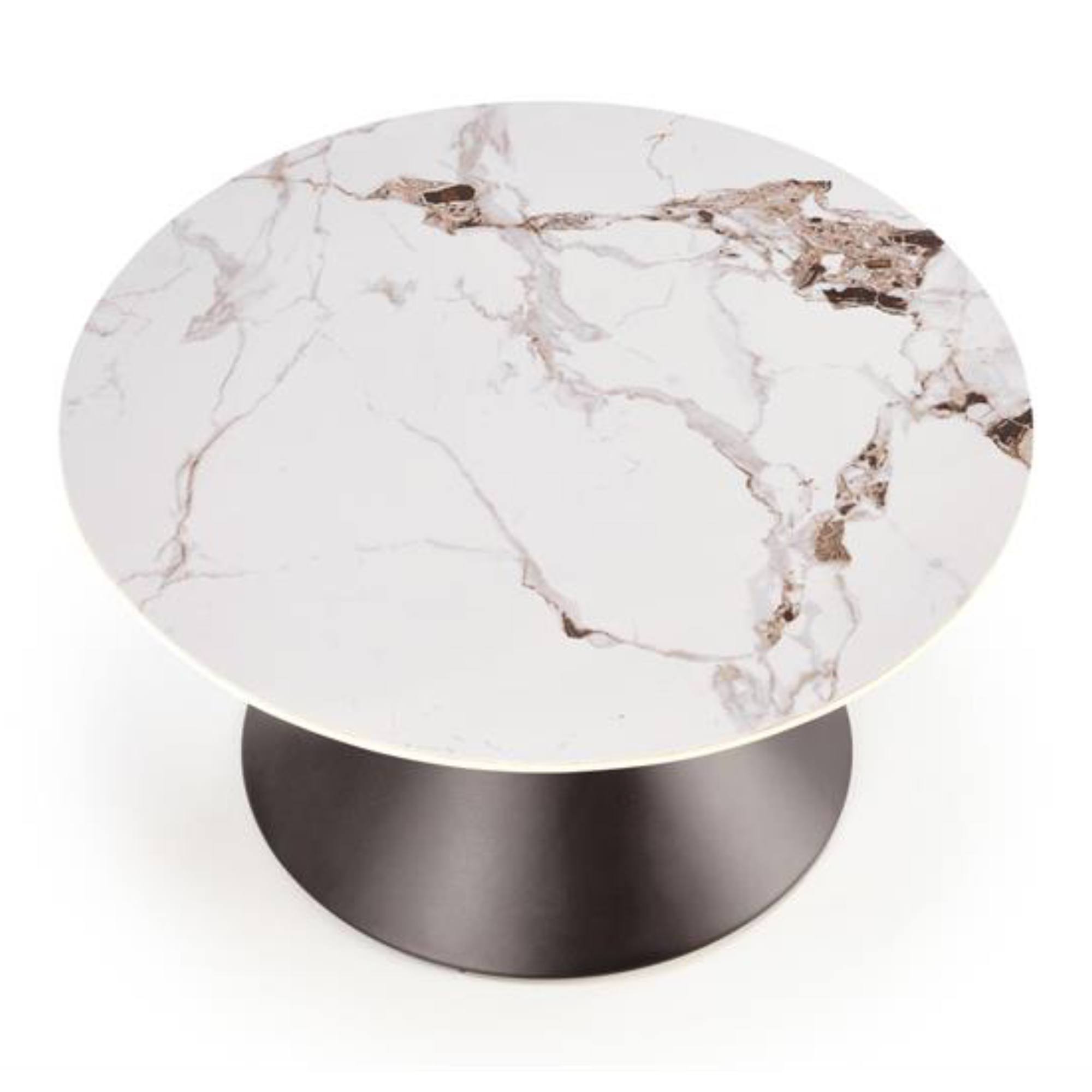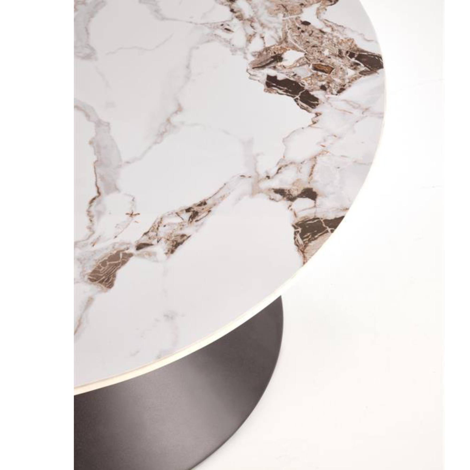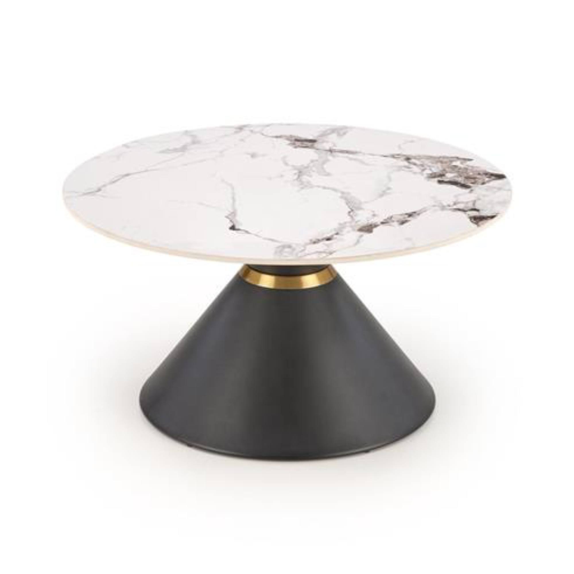 Stolík je vyrobený z kombinácie spekaného kameňa a kovu, hlavná doska kruhového tvaru je v dizajne bieleho mramoru. Základňa o kužeľovitom tvare je z ocele v čiernej farbe a je doplnená zlatým prúžkom, ktorý slúži ako doplnok.