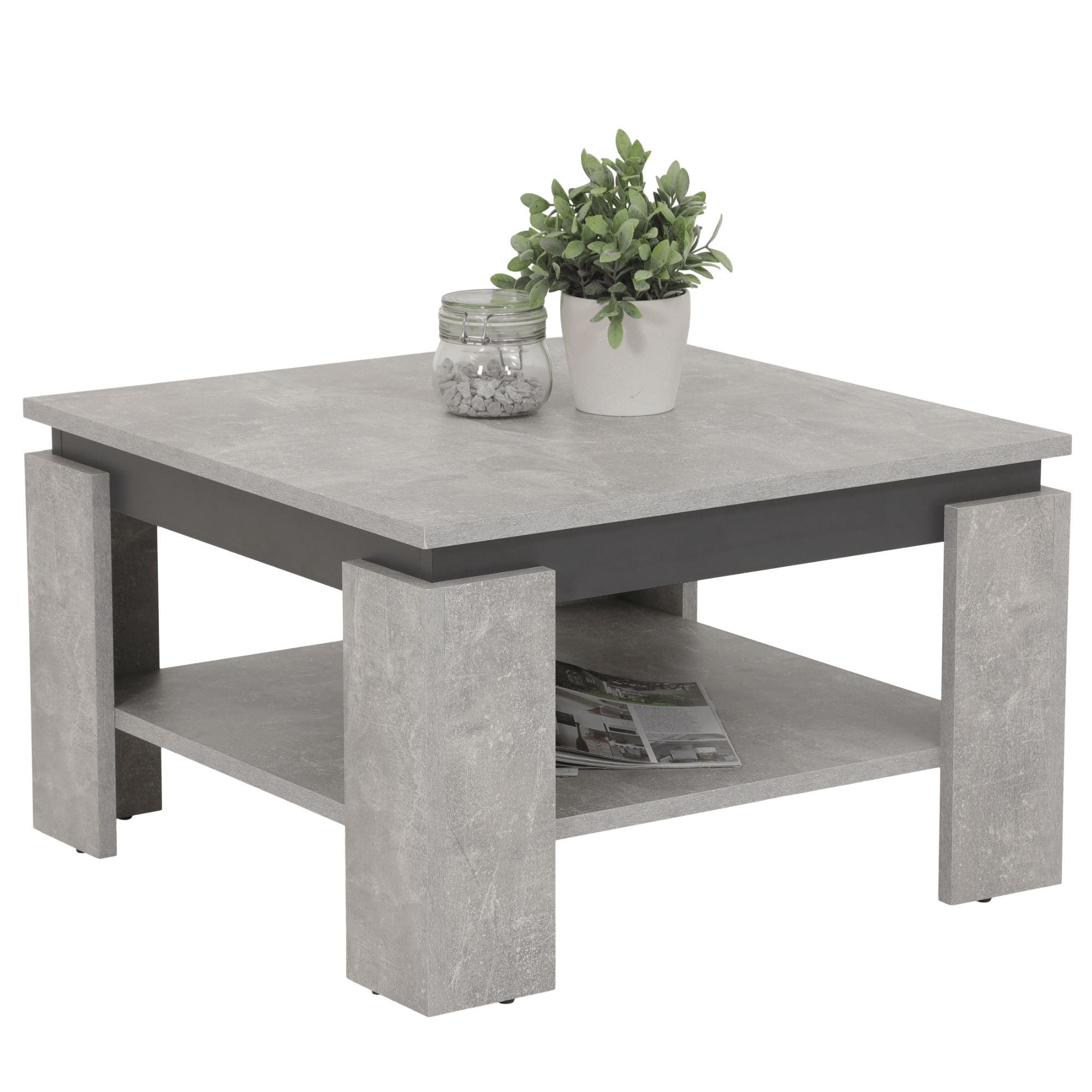 Vyrobený je z laminovaného dreveného materiálu, ktorý sa vyznačuje ľahkou udržiavateľnosťou aj dlhou životnosťou. Hlavná odkladacia plocha je doplnená o spodnú celoplošnú policu na časopisy, knihy a jednoducho na všetko, čo sa vždy hodí mať po ruke. Vďaka striedmym rozmerom a štvorcovému formátu sa hodí do menších domácností.