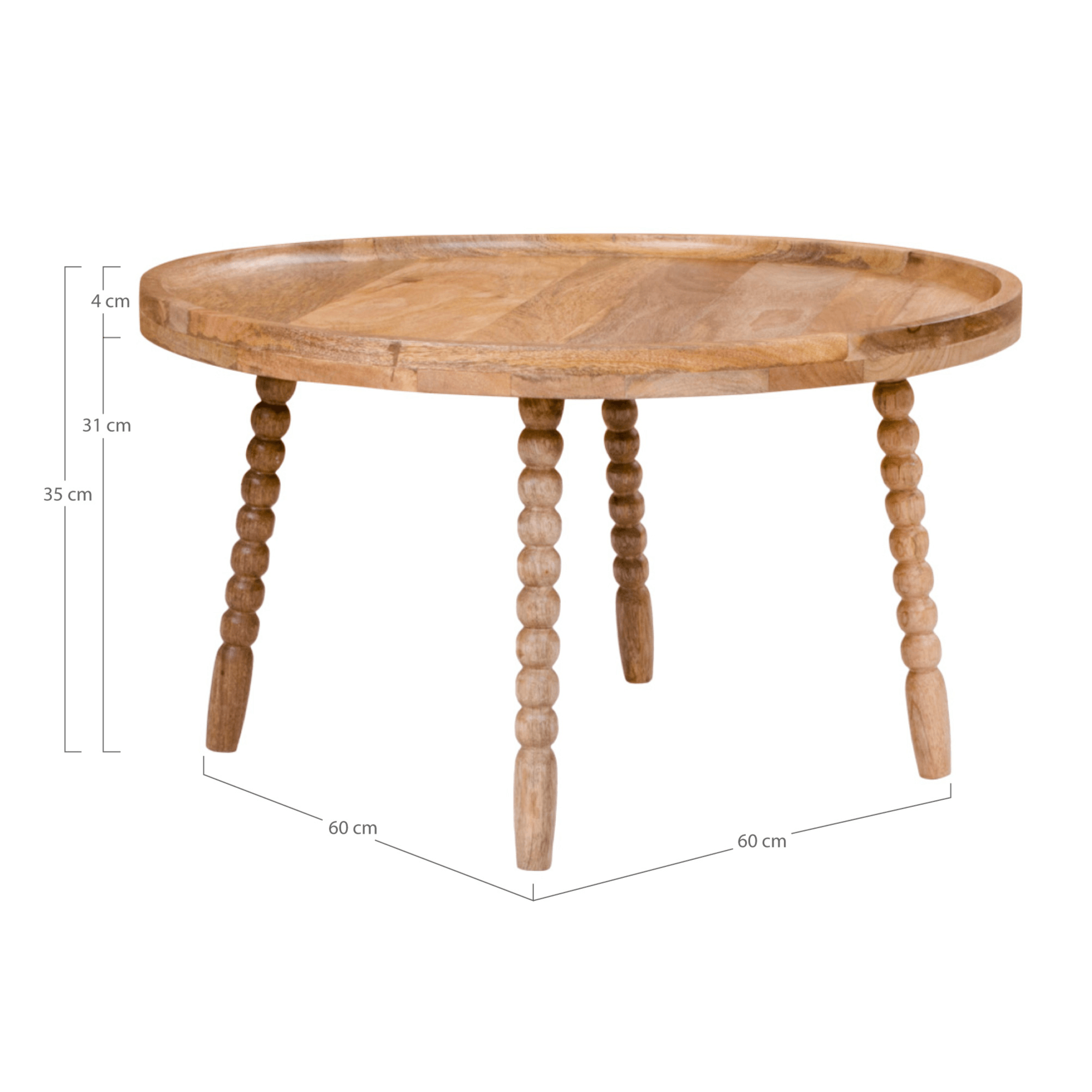 Celý stolík je vyrobený z masívneho mangovníkového dreva s priznanými chybami a farebnými prechodmi, ktoré dodávajú stolíku jedinečný vzhľad. Každý kus je preto úplným originálom. Stabilitu zaisťuje štvorica nôh s dekoratívnym frézovaním.
