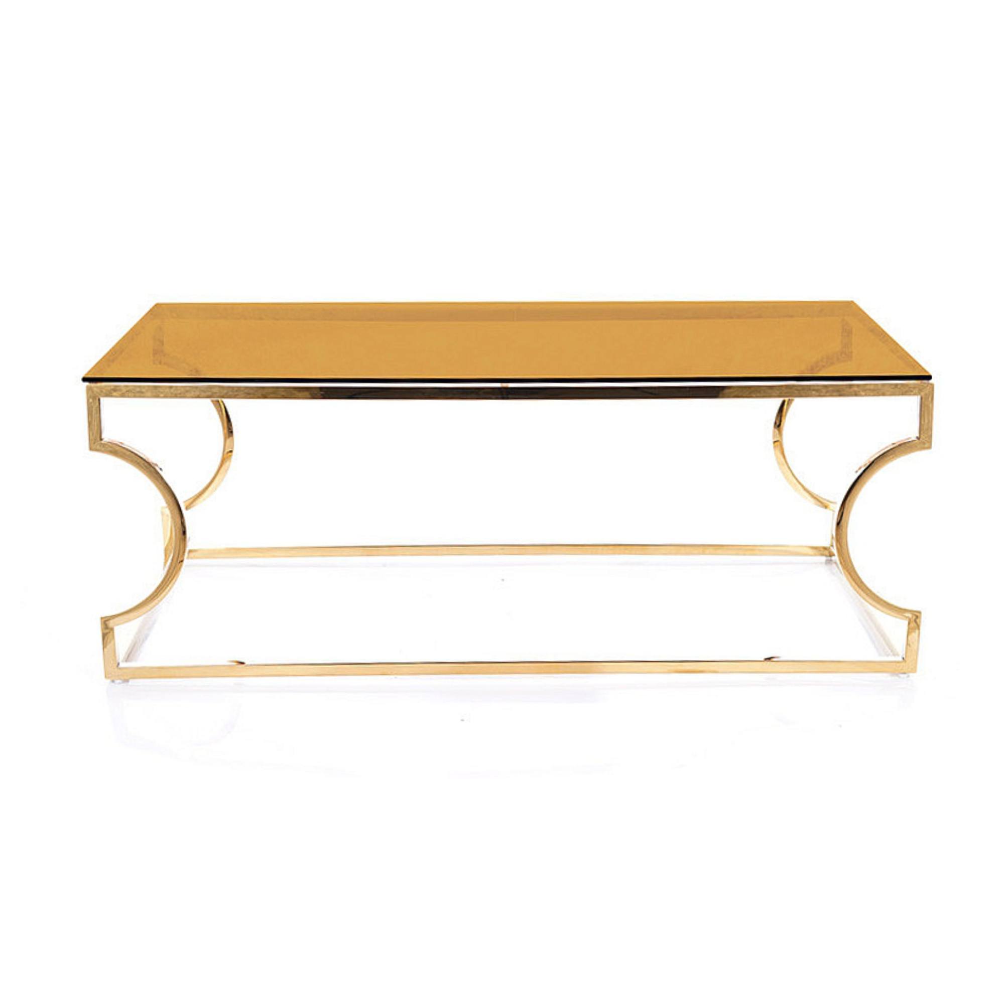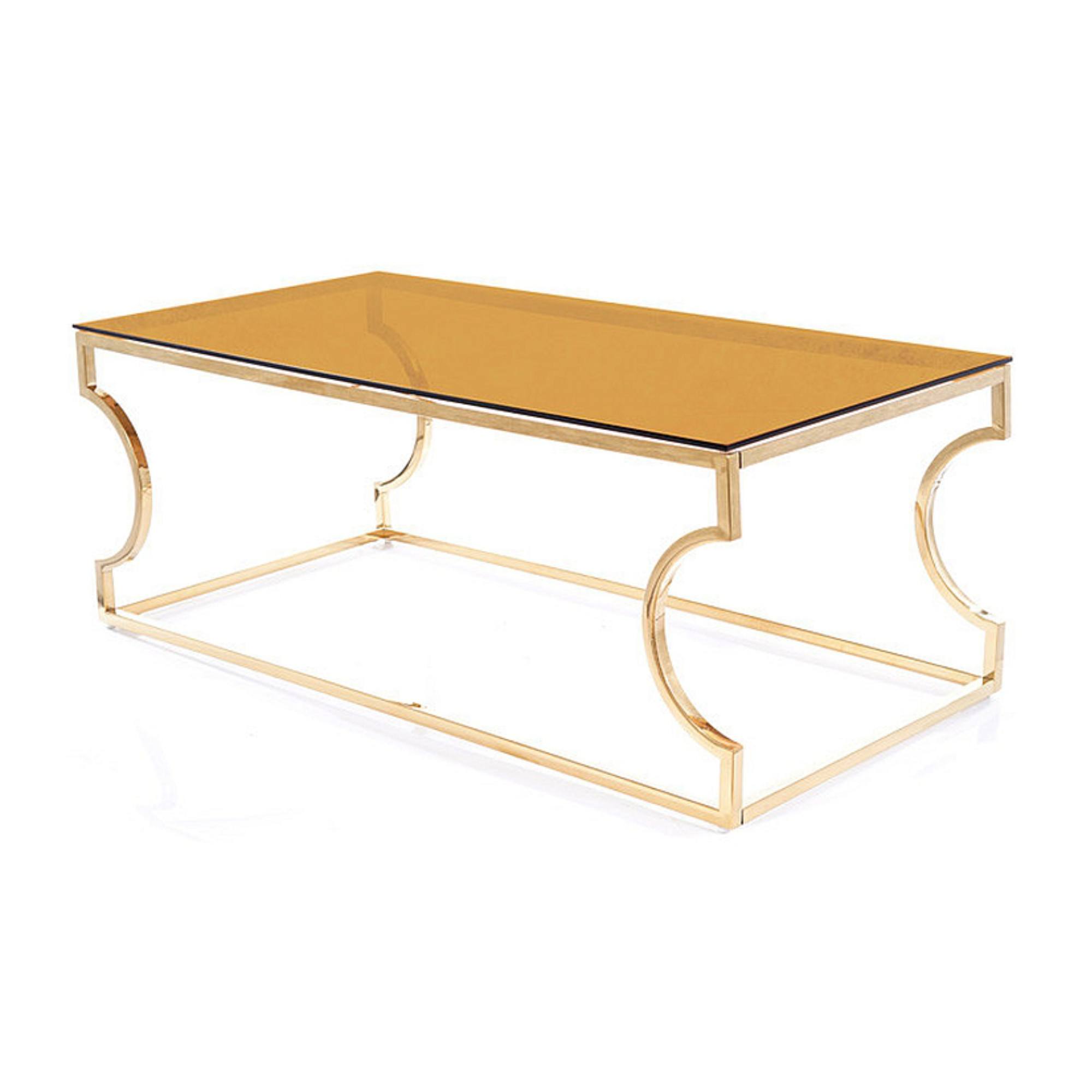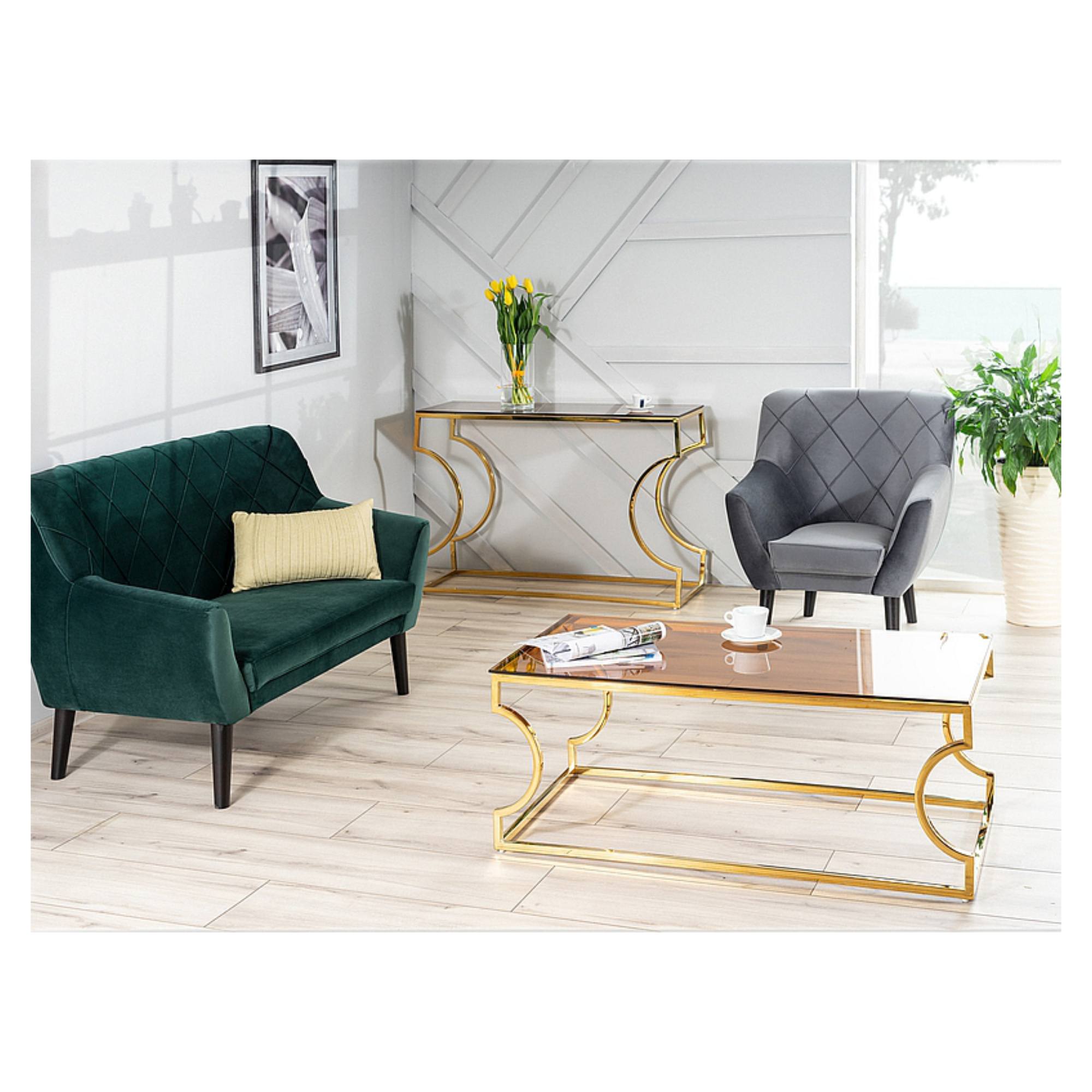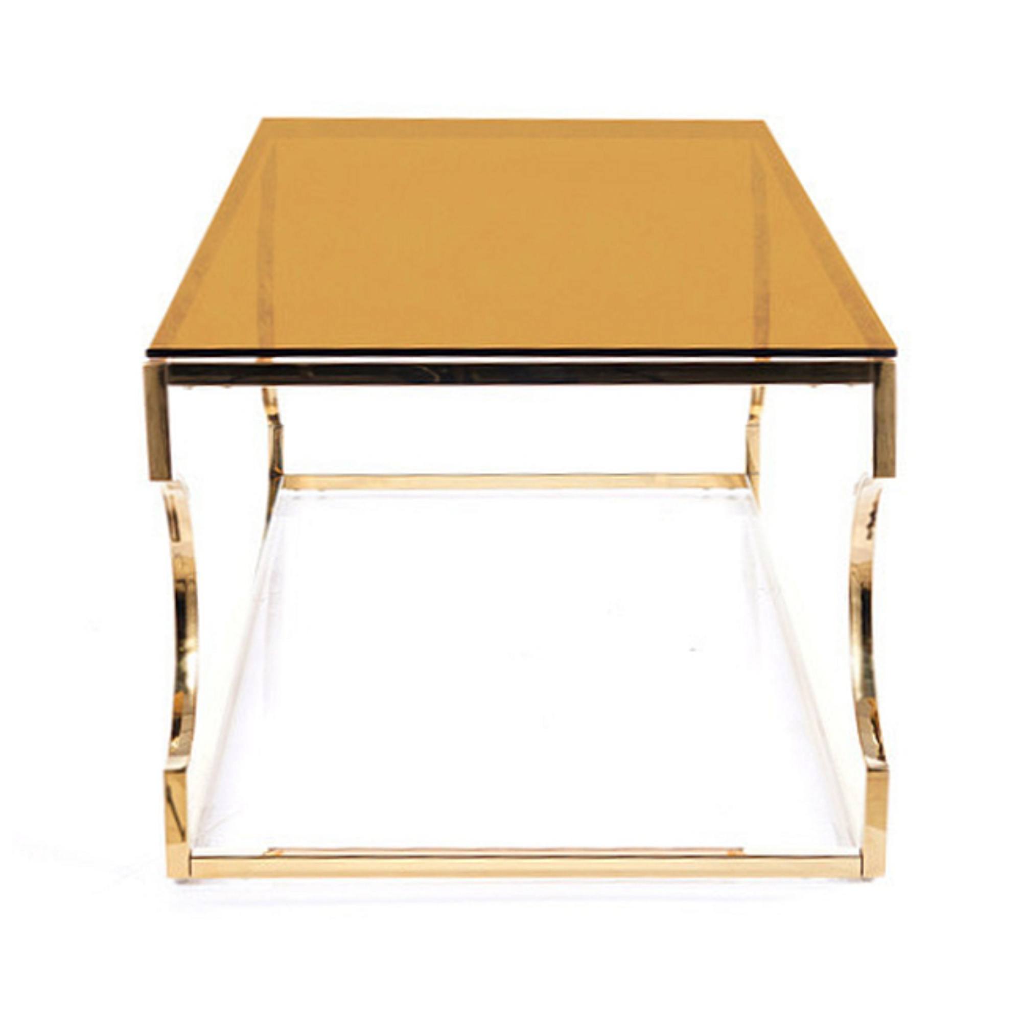 Hlavná doska je vyrobená z jantárového tvrdeného skla. Maximálnu stabilitu zaisťuje dizajnová kovová podnož v zlatom odtieni, ktorá štýl stolíka perfektne zvýrazňuje a interiéru dodáva punc luxusu.