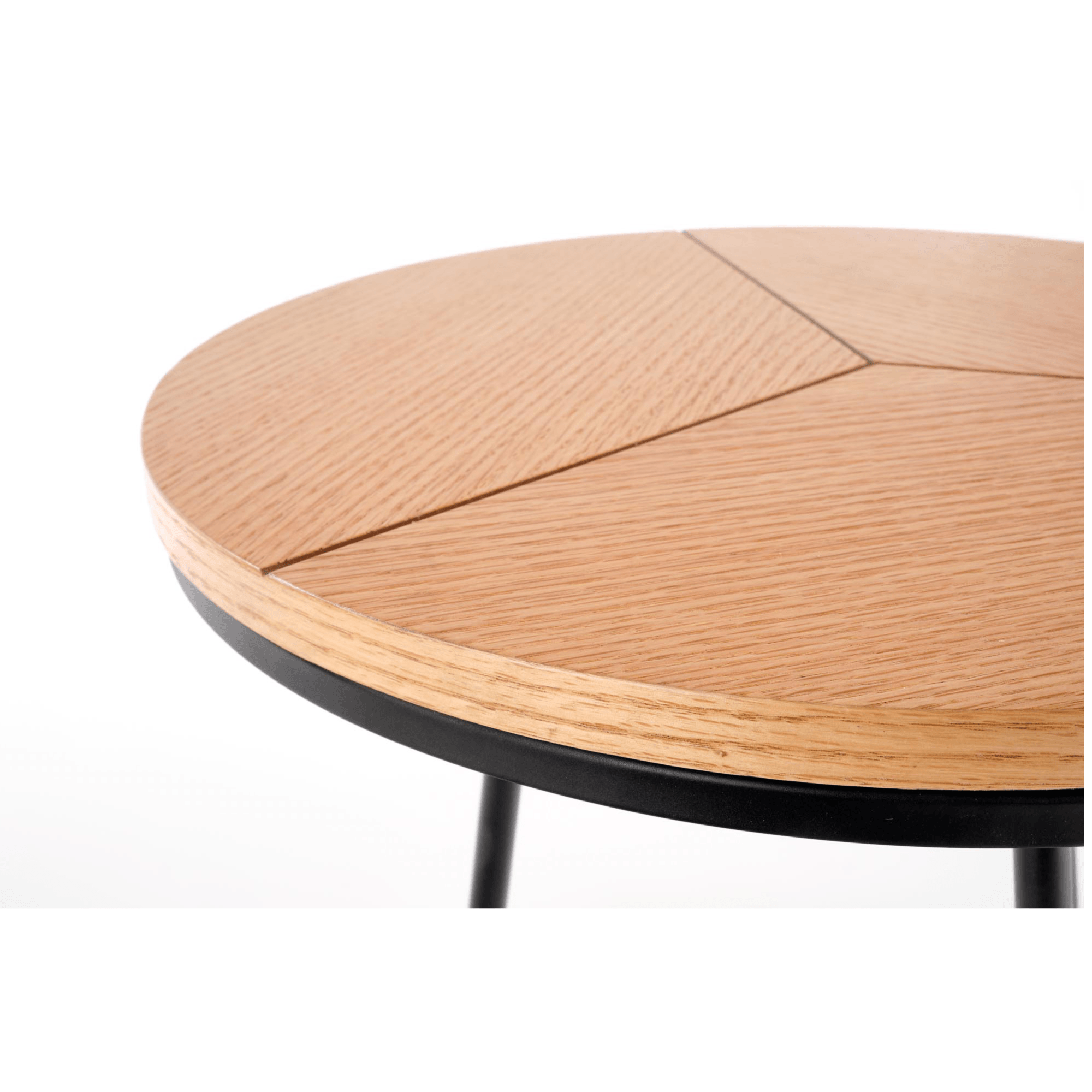 Hlavná doska je vyrobená z prírodnej dubovej dyhy na podklade z drevovláknitého materiálu MDF. Maximálnu stabilitu zaisťuje kovová podnož v čiernom práškovom laku. Štýl stolíka zvýrazňuje dekoratívne frézovanie odkladacej plochy. Vybavte svoju domácnosť s moderným konferenčným stolíkom KORADO.