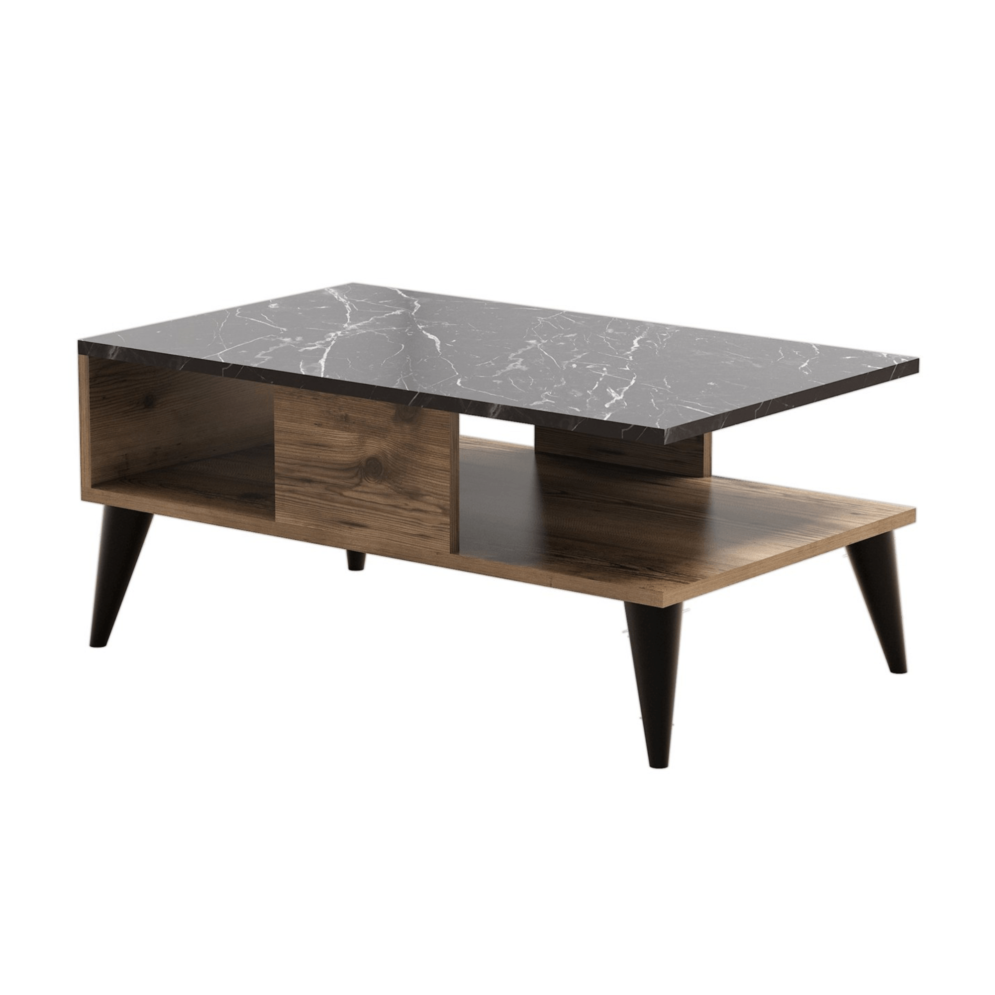 Vyrobený je z laminovaného dreveného materiálu, pre ktorý je typická jednoduchá udržiavateľnosť aj dlhá životnosť. Bočné podporné bloky a celoplošná polica sú ladené do dekora orecha s výraznou kresbou dreva, zatiaľ čo hlavná odkladacia plocha vzhľadovo evokuje mramorovú dosku – tá stolíku dodáva kontrastný rozmer a interiéru punc luxusu. Maximálnu stabilitu zaisťuje štvorica kónických nožičiek v matnom čiernom vyhotovení.