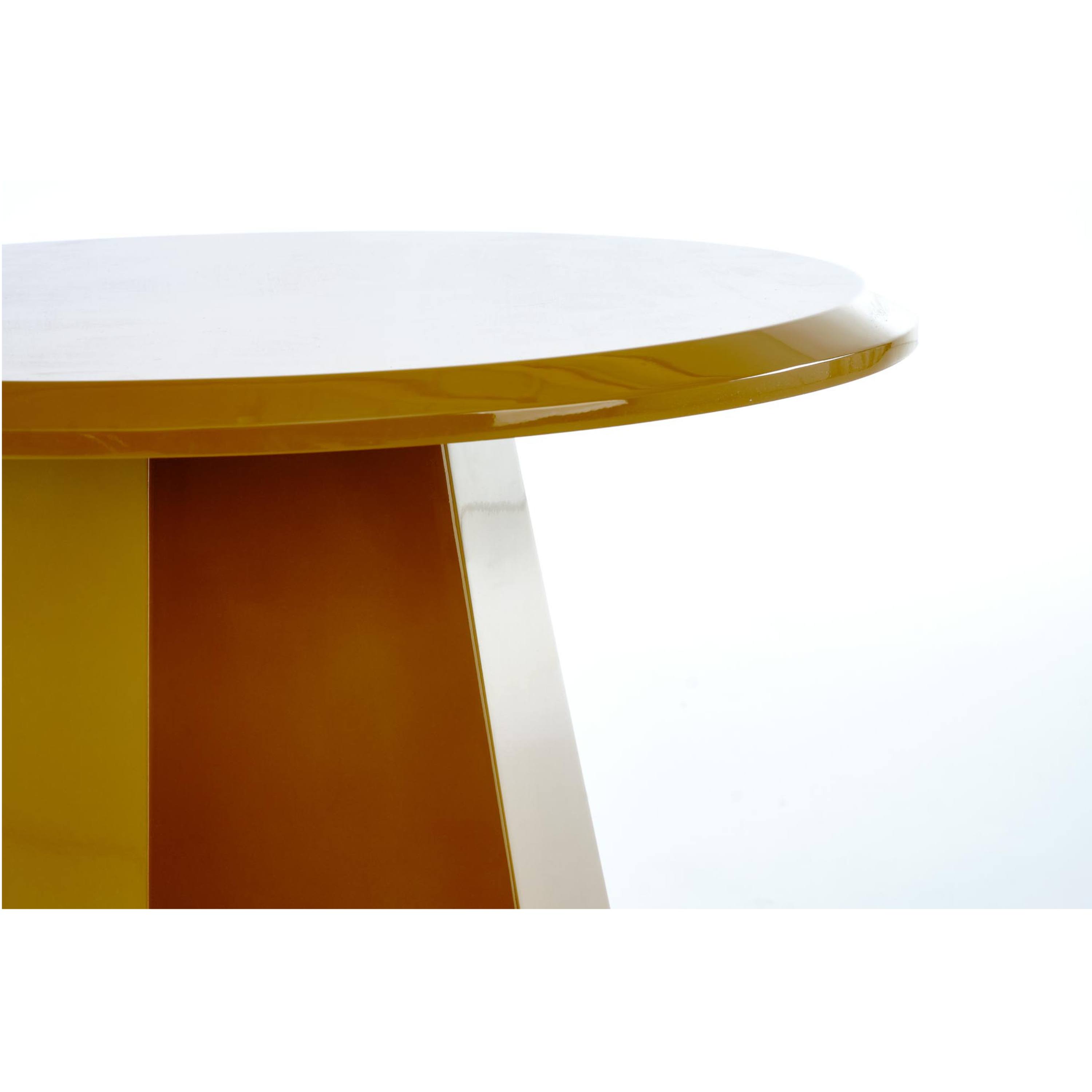 Stolík je vyrobený z MDF dosiek s hladkým, lakovaným povrchom, ktorý je nielen estetický, ale aj ľahko udržiavateľný. Okrúhla doska ponúka dostatok priestoru na odkladanie, zatiaľ čo netradične riešená podstava dodáva celku potrebnú oporu. Vďaka jednofarebnému prevedeniu vo výraznom odtieni sa stolík stane neprehliadnuteľným prvkom každého moderne zariadeného interiéru.