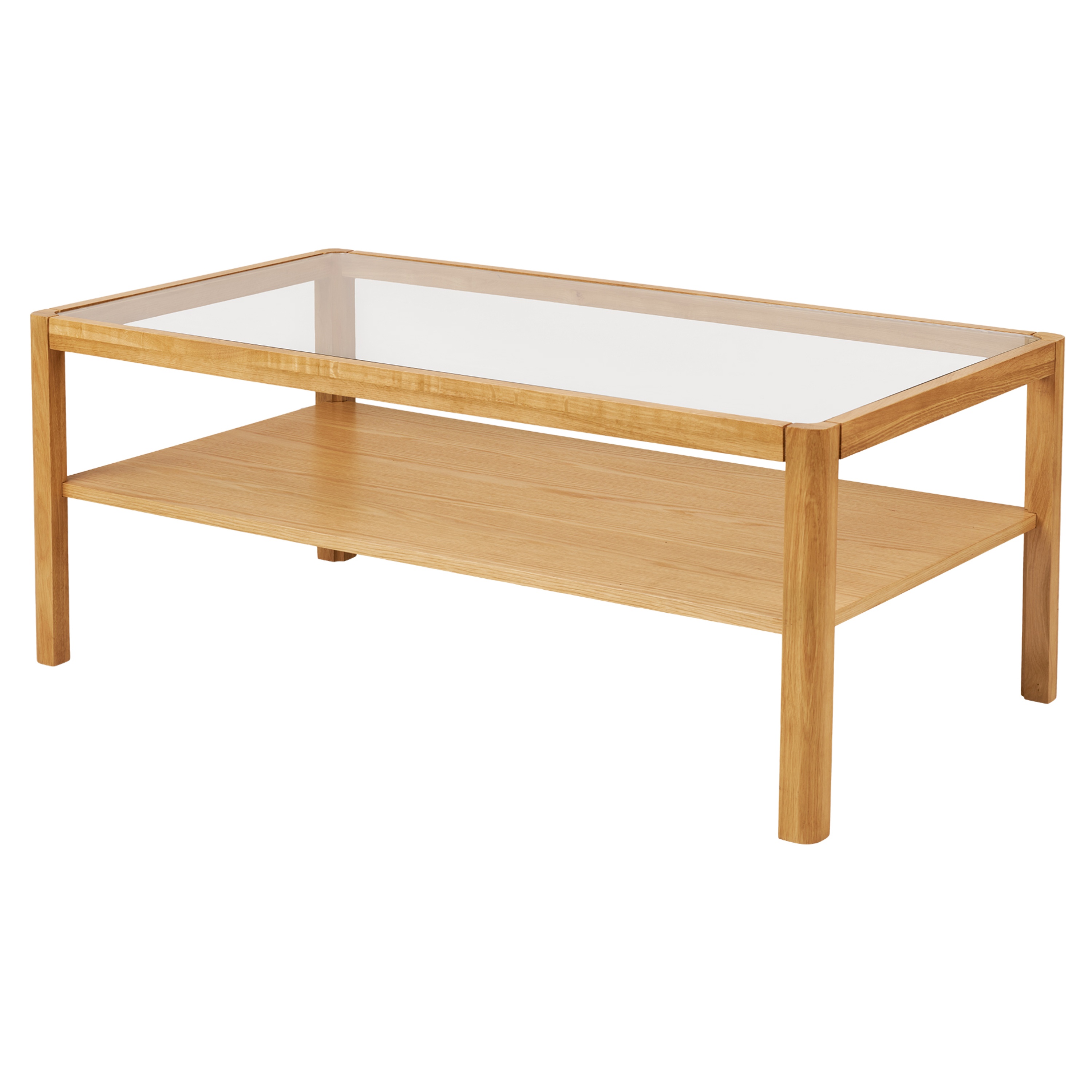 Konferenčný stolík LUERMORAN zaujme nadčasovým dizajnom, ktorý kombinuje vzdušnú sklenenú dosku s prírodným dubovým dekorom.
