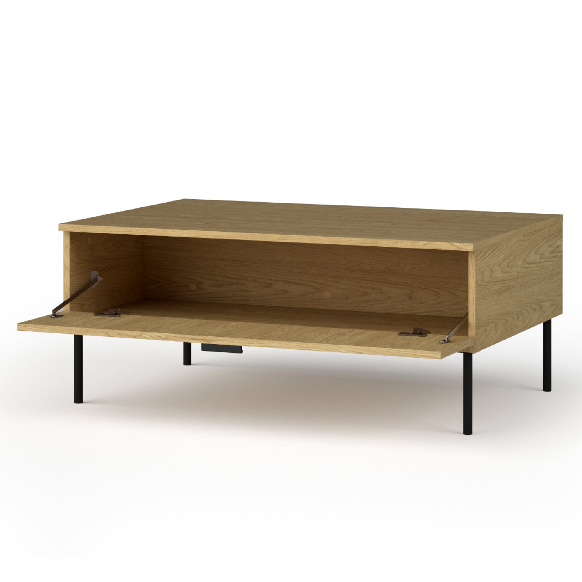 Za výklopnými dvierkami sa ukrýva praktický úložný priestor, do ktorého môžete prehľadne usporiadať všetky predmety, ktoré potrebujete mať po ruke. Na výrobu tohto konferenčného stolíka bol využitý laminovaný drevený materiál, ktorý je nenáročný na údržbu. Stabilné nohy a rúčka sú z kovu.