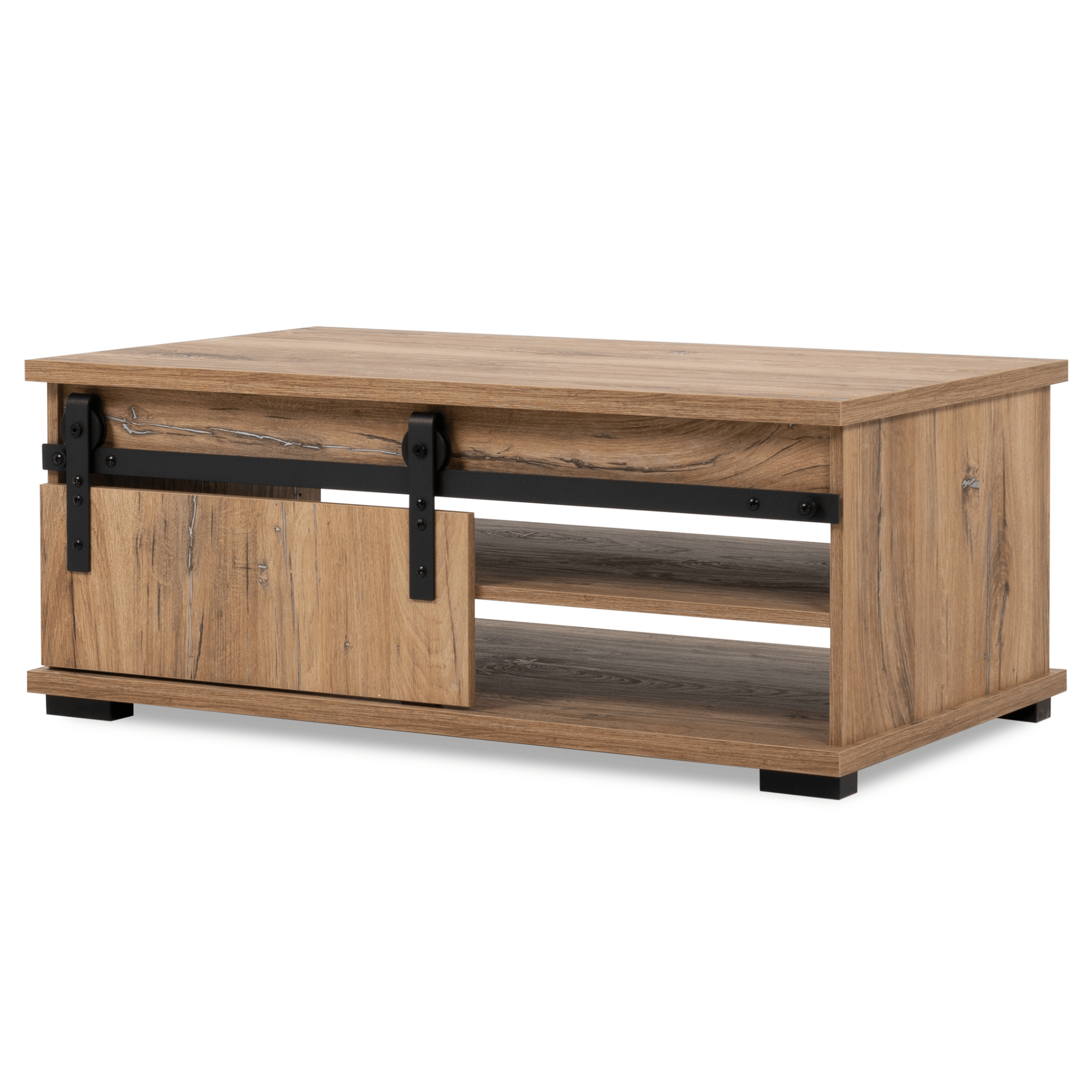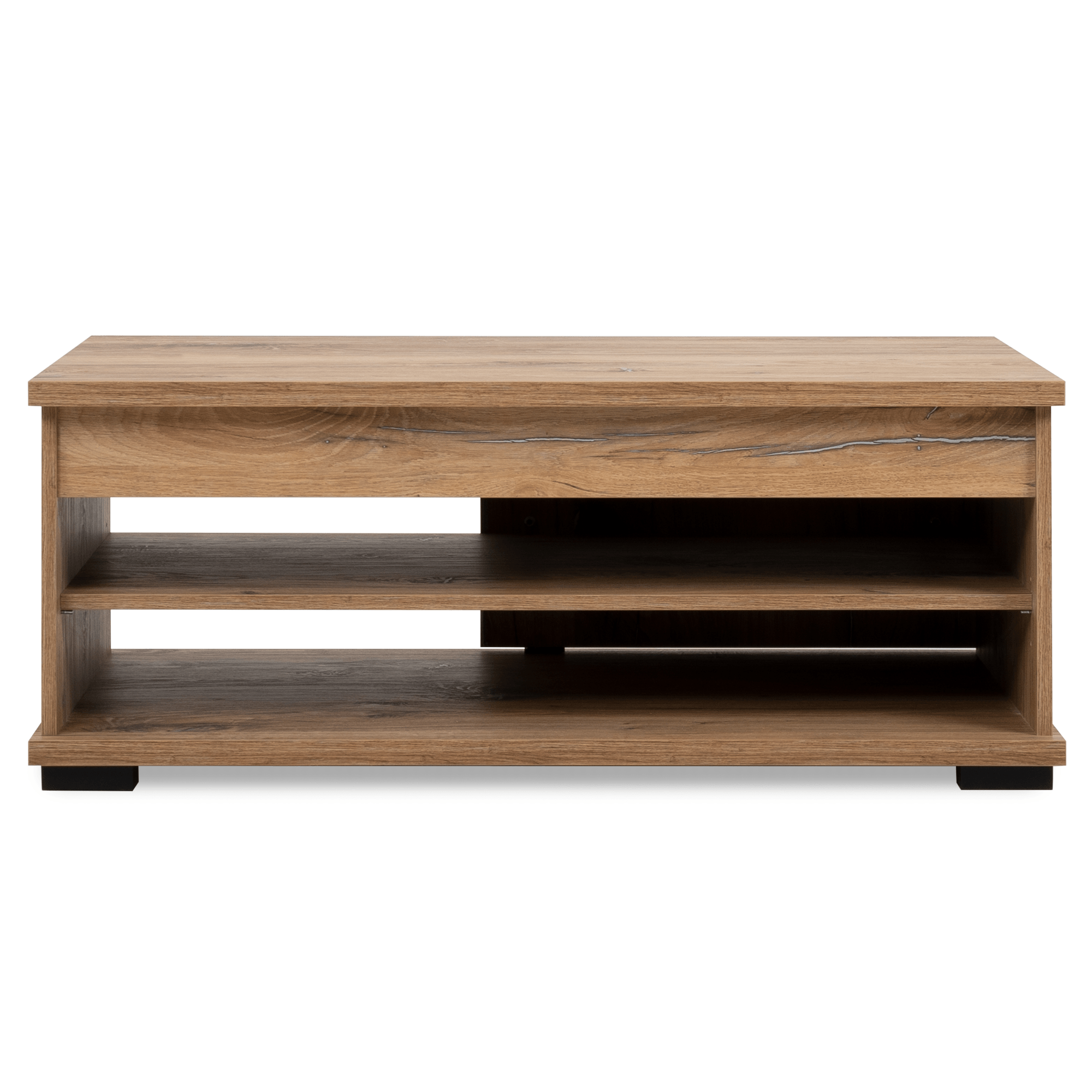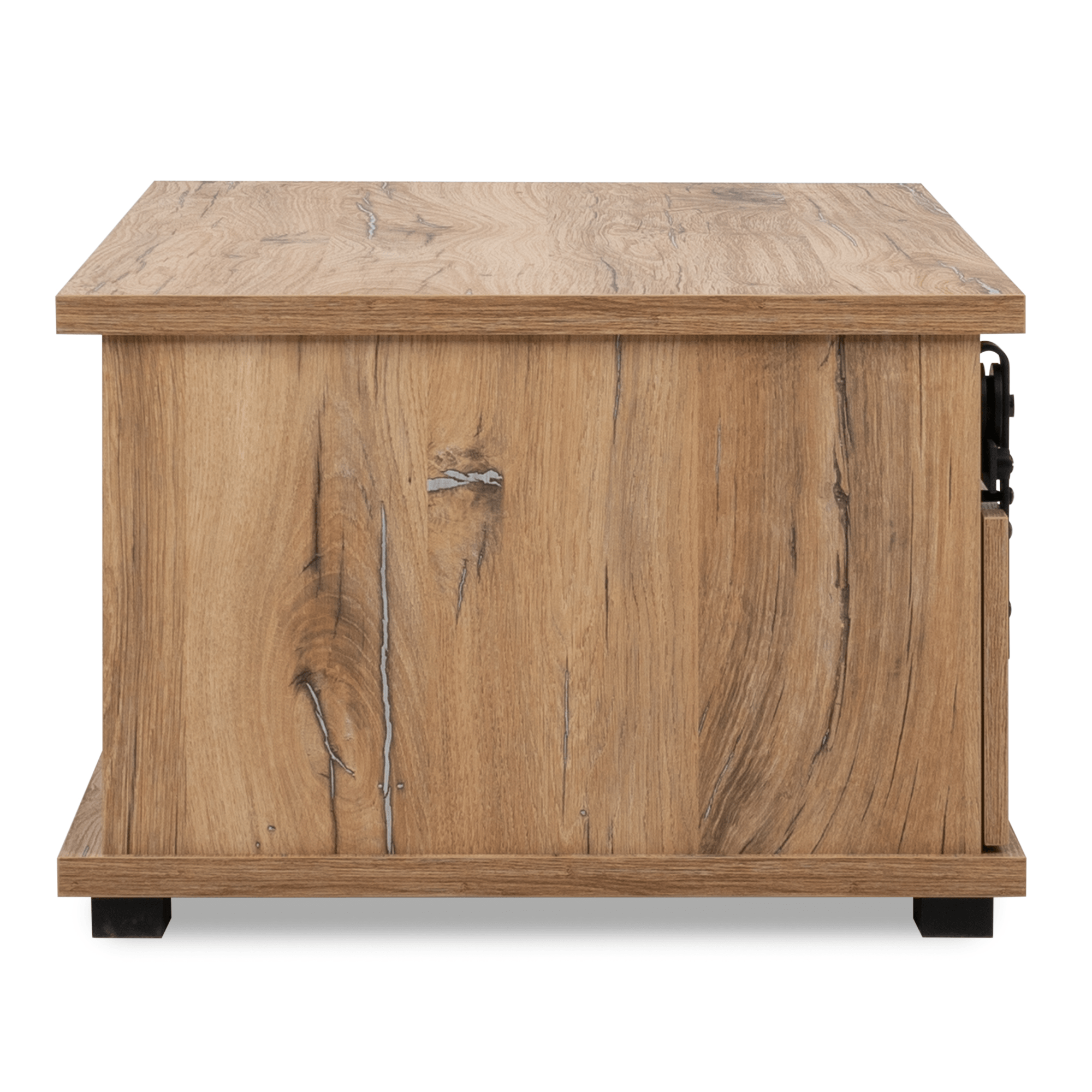 Vyrobený je z laminovaných drevotrieskových dosiek, ktoré sa vyznačujú ľahkou udržiavateľnosťou aj dlhou životnosťou. Ladený je do dekora duba flagstaff s výraznou kresbou dreva – to interiér zútulňuje a obohacuje o prírodný nádych. Dostatočný úložný priestor zaisťuje spodná celoplošná polica – tá je čiastočne krytá posuvnou doskou na kovovej koľajničke v čiernom práškovom laku.