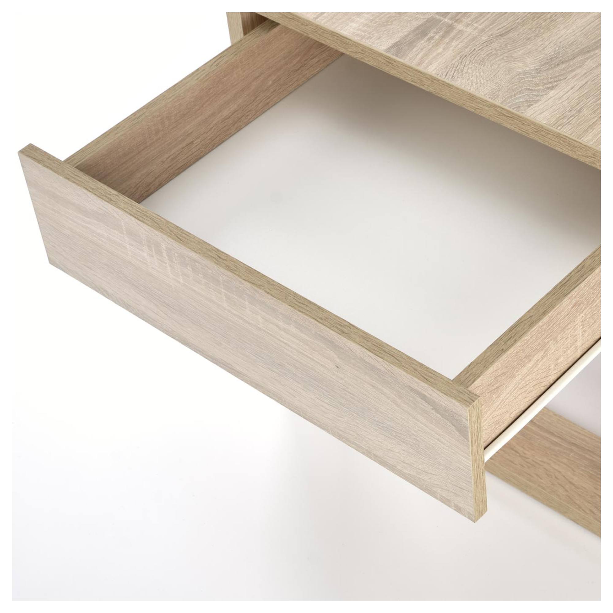 Stolík je vyrobený z ľahko udržiavateľného dyhovaného dreveného materiálu v prírodnom dekore a poskytuje dostatok odkladacieho priestoru na vrchnej odkladacej doske. Bočná zásuvka bez rúčok ponúka dodatočný úložný priestor, kam pohodlne uschováte nevyhnutné drobnosti.