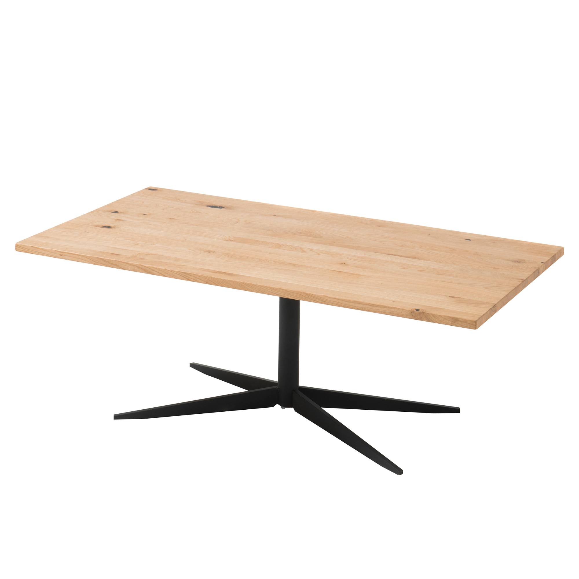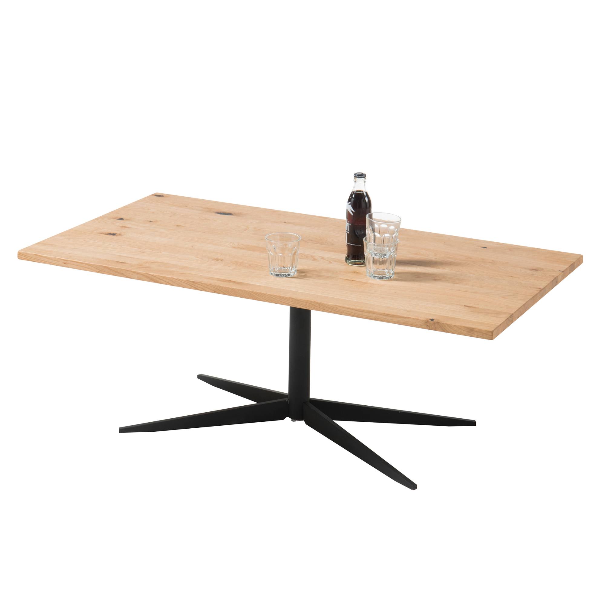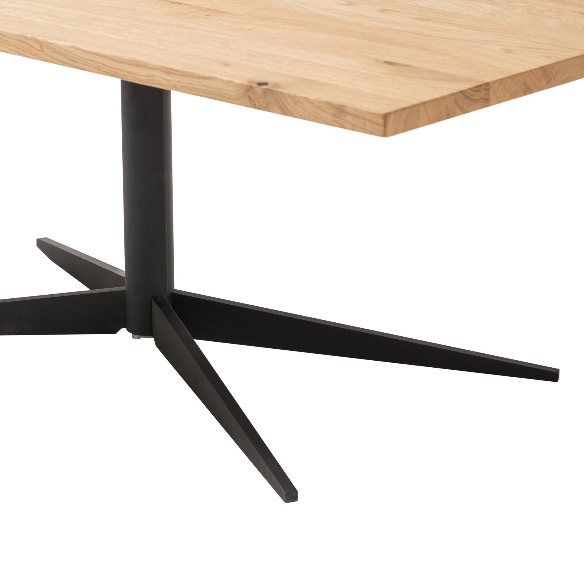 Jednoduchý dizajnový stolík, ktorý môžete použiť napríklad do obývačky. Doska je z masívneho dubového dreva, vďaka čomu je zaručená dlhá životnosť. Celokovová noha v čiernom laku sa od stredného stĺpu rozdeľuje do štvorčlennej podstavy, ktorá zabezpečí maximálnu stabilitu.