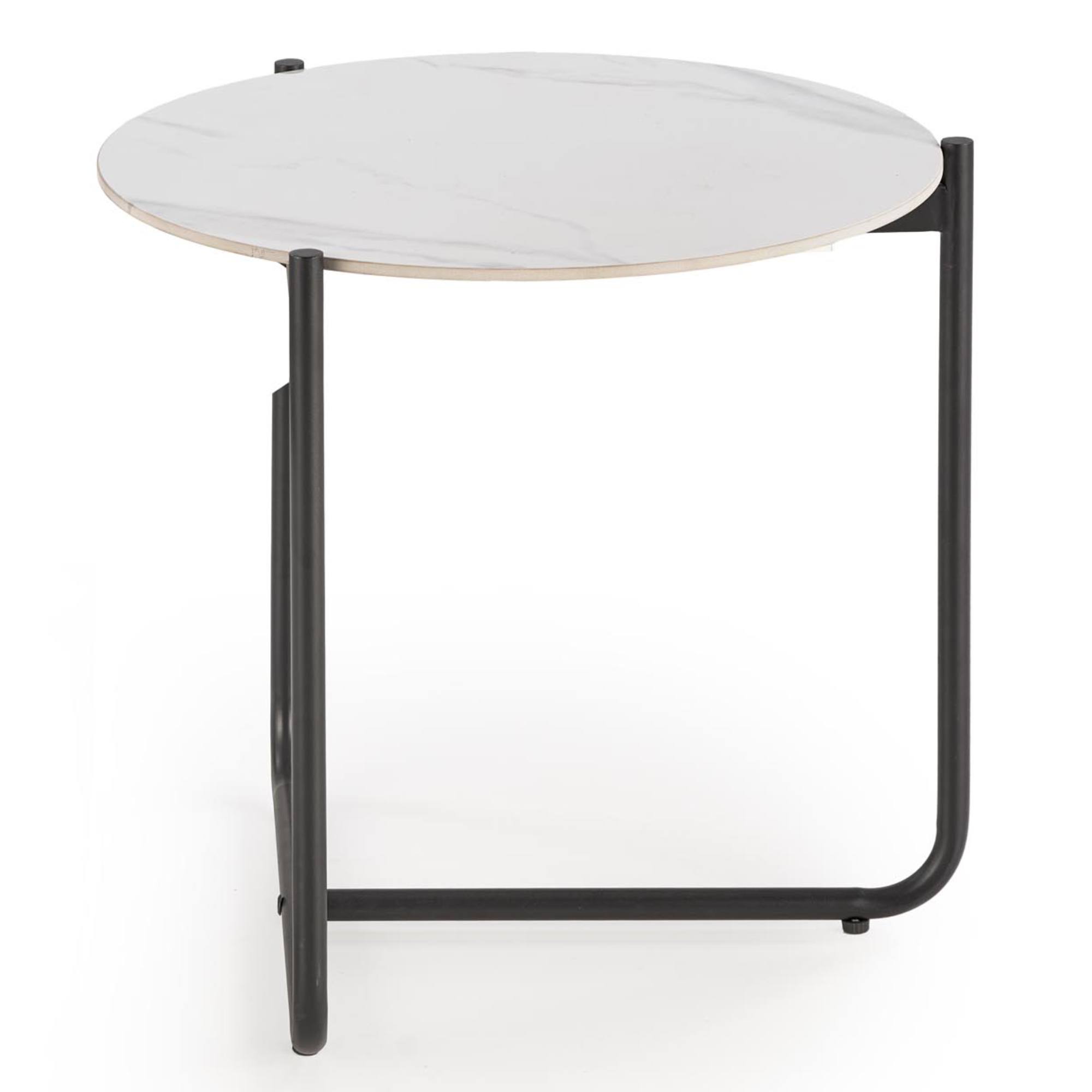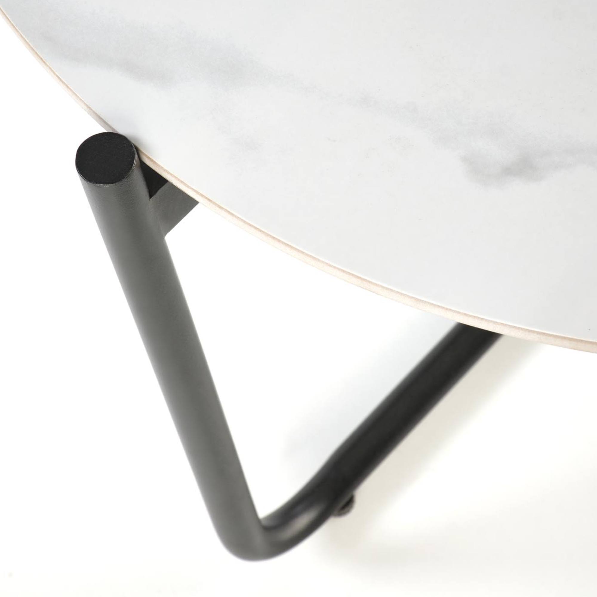 Pevná a stabilná konštrukcia tohto stolíka je vyrobená z kovu, ktorý je pokrytý práškovým nástrekom. Horná doska zo spekaného kameňa je ozdobená dekorom mramoru.