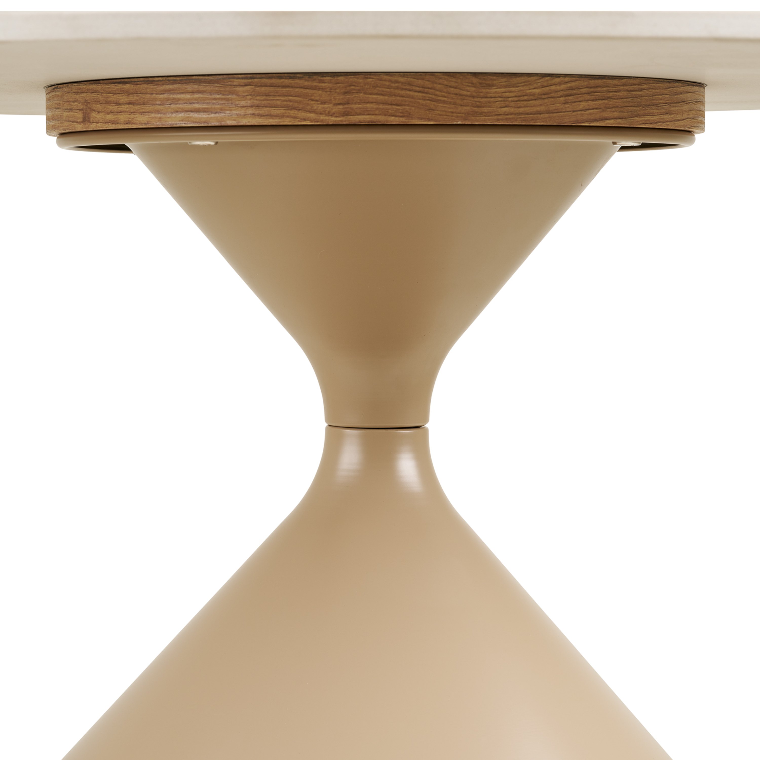 Okrúhla doska vyrobená z keramiky s dekorom kameňa dodáva interiéru prírodný nádych, zatiaľ čo subtílna oceľová noha v teplom odtieni podčiarkuje moderný charakter celku. Stolík ponúka dostatok priestoru na odkladanie predmetov každodennej potreby aj štýlové dekorácie, pričom stabilná konštrukcia zaisťuje pevnosť a spoľahlivosť pri používaní. Použité materiály zaručujú dlhú životnosť a jednoduchú údržbu.