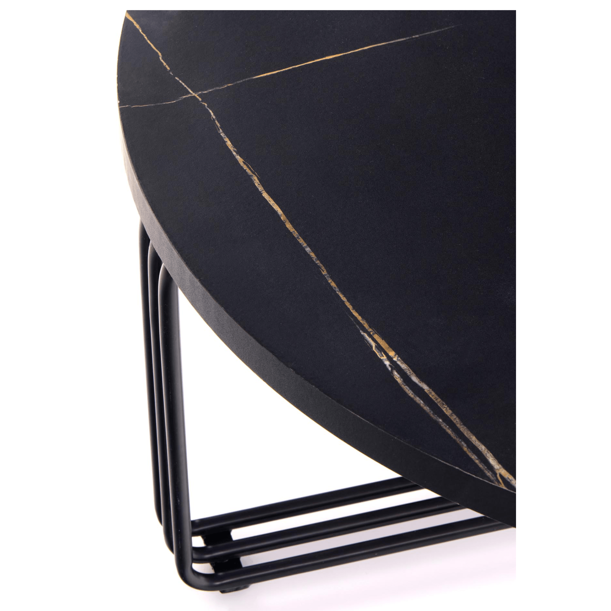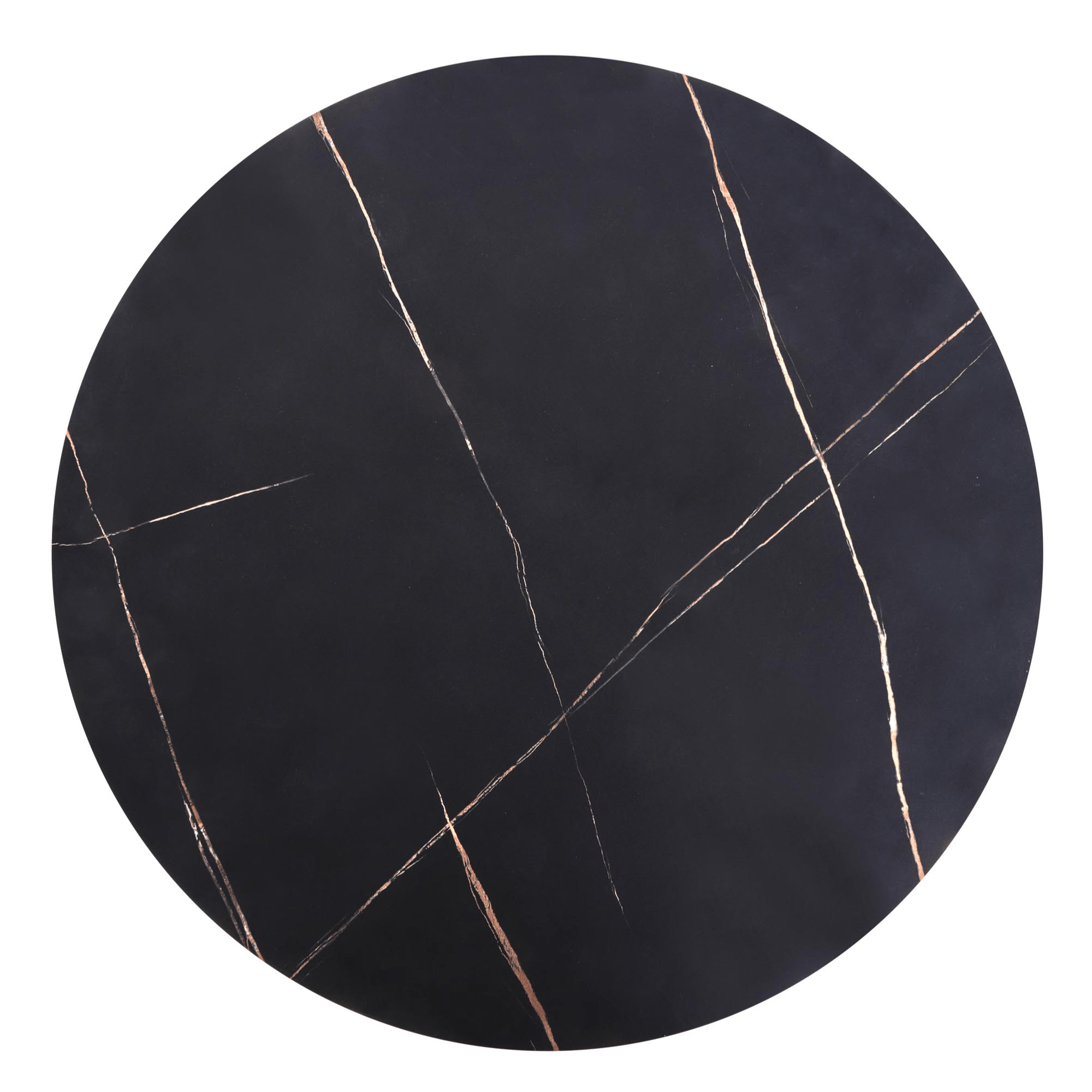 Hlavná doska kruhového tvaru je vyrobená z drevovláknitého materiálu MDF, ktorý sa vyznačuje ľahkou udržiavateľnosťou aj dlhou životnosťou. Ladená je do dekora mramoru, ktorý interiér obohacuje o punc luxusu. Stabilitu obstaráva netradičná podnož z kovu v čiernom práškovom laku.
