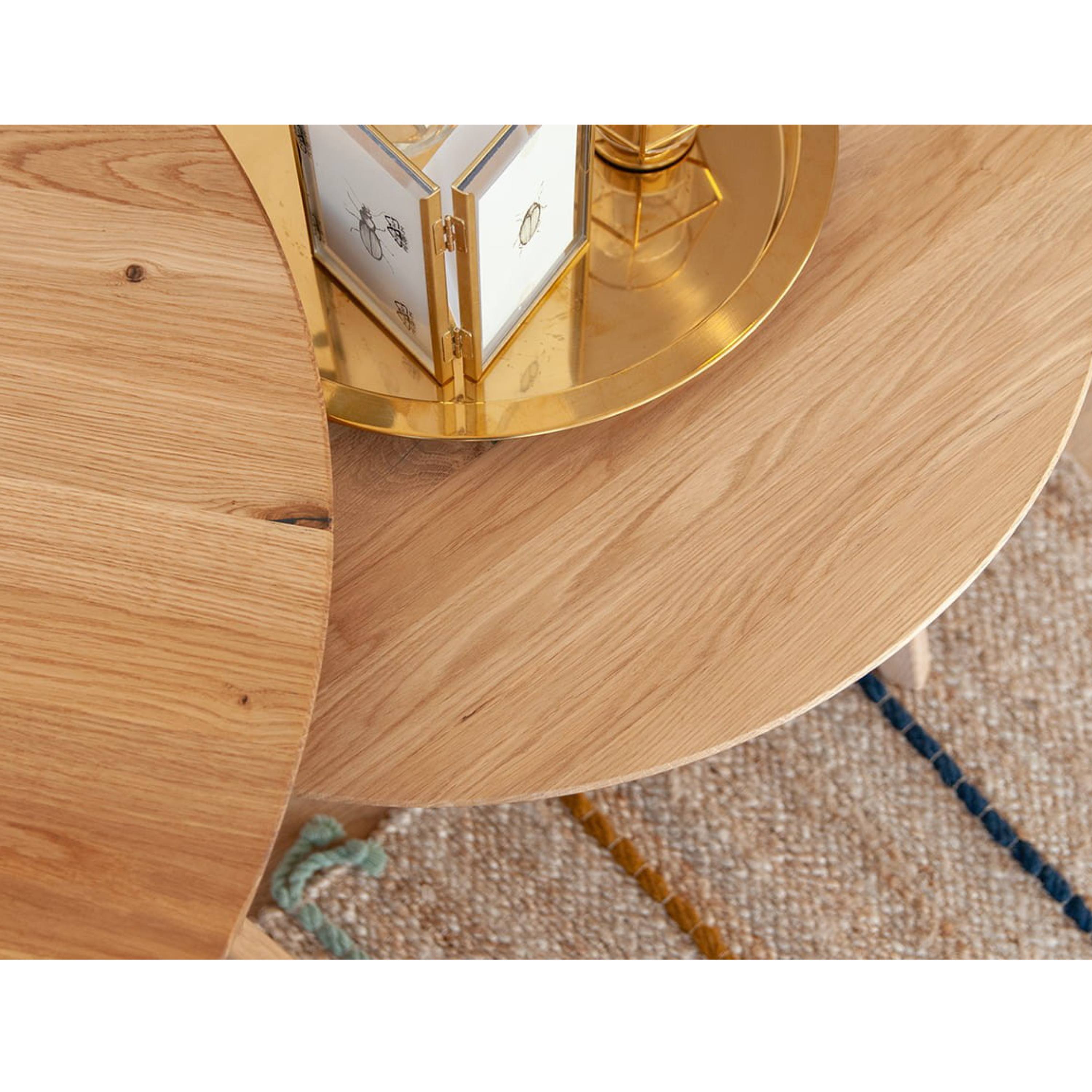 Konštrukcia stolíka je vyrobená z masívneho dubového dreva, ktoré sa vyznačuje svojou pevnosťou, odolnosťou, vyššou nosnosťou a tiež dlhou životnosťou. Stolík je vybavený okrúhlou doskou s priemerom 70 cm, ktorá ponúka dostatok miesta na odloženie nevyhnutností, ktoré chcete mať po ruke, alebo aj na vystavenie dekorácií či posedenie pri káve. Dosku podopiera trojnohá podnož zabezpečujúca potrebnú stabilitu.
