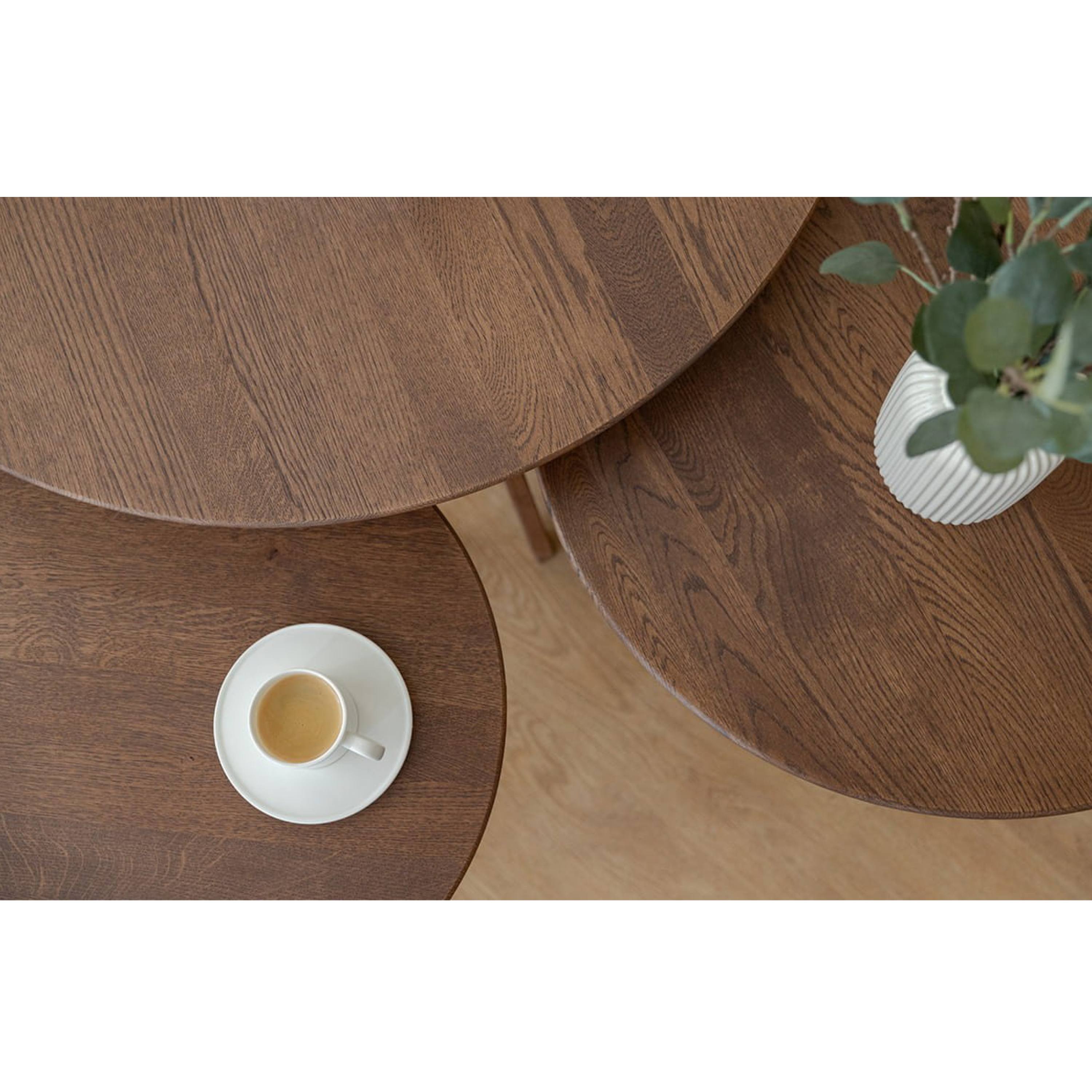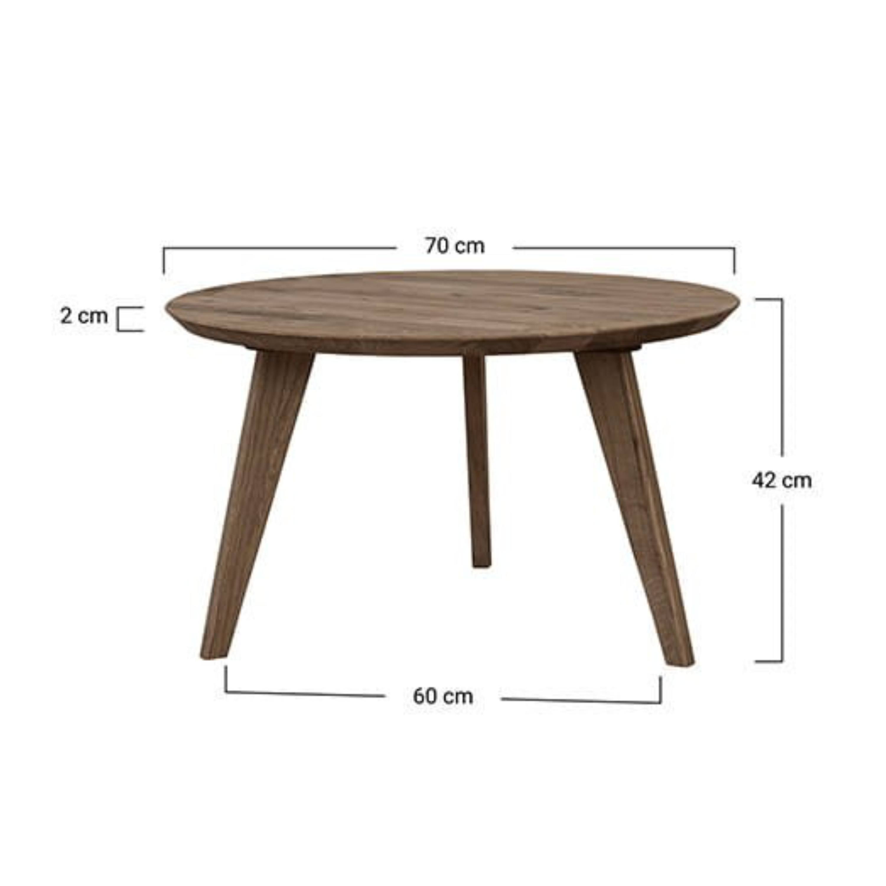 Konštrukcia stolíka je vyrobená z masívneho dubového dreva, ktoré sa vyznačuje svojou pevnosťou, odolnosťou, vyššou nosnosťou a tiež dlhou životnosťou. Stolík je vybavený okrúhlou doskou s priemerom 70 cm, ktorá ponúka dostatok miesta na odloženie nevyhnutností, ktoré chcete mať po ruke, alebo aj na vystavenie dekorácií či posedenie pri káve. Dosku podopiera trojnohá podnož zabezpečujúca potrebnú stabilitu.