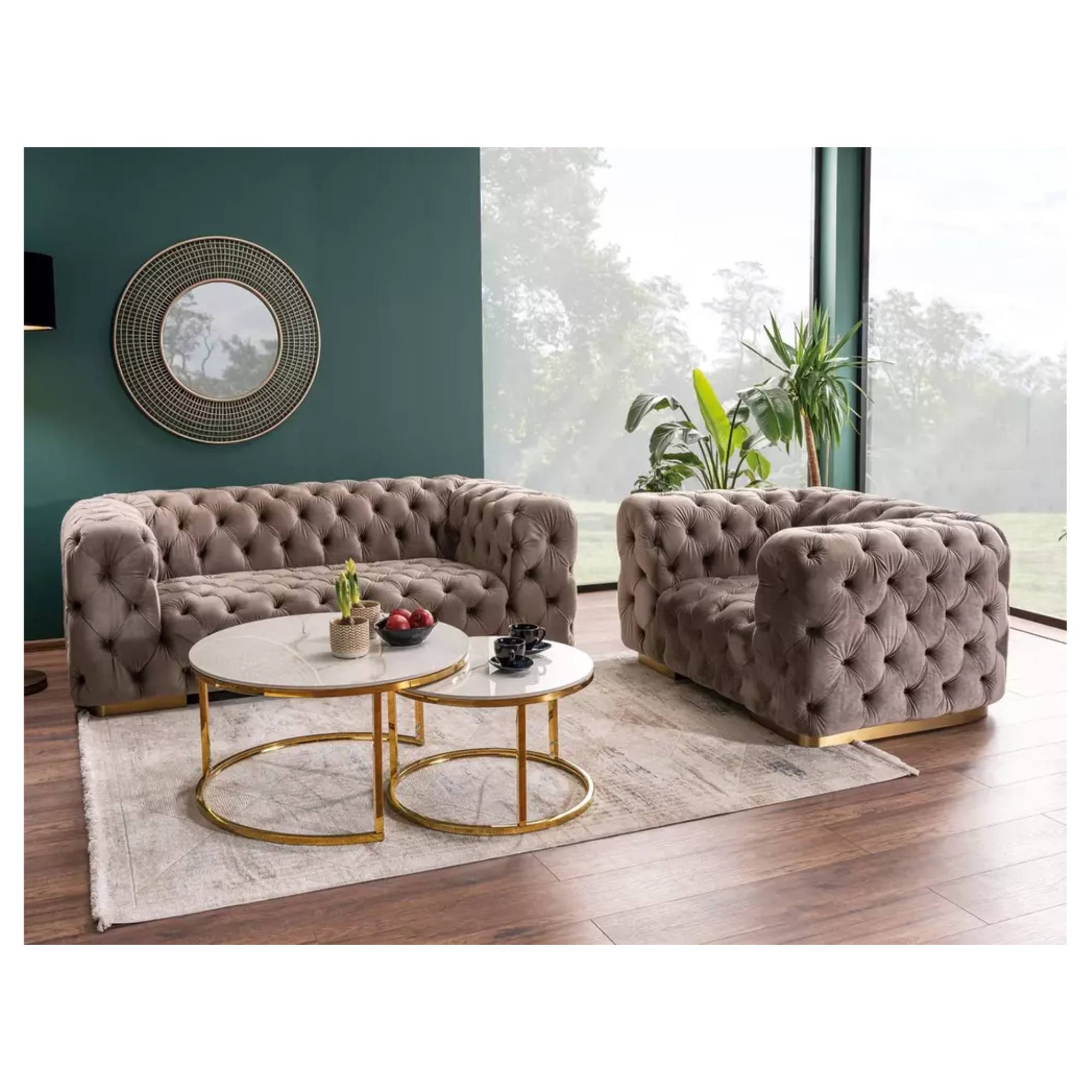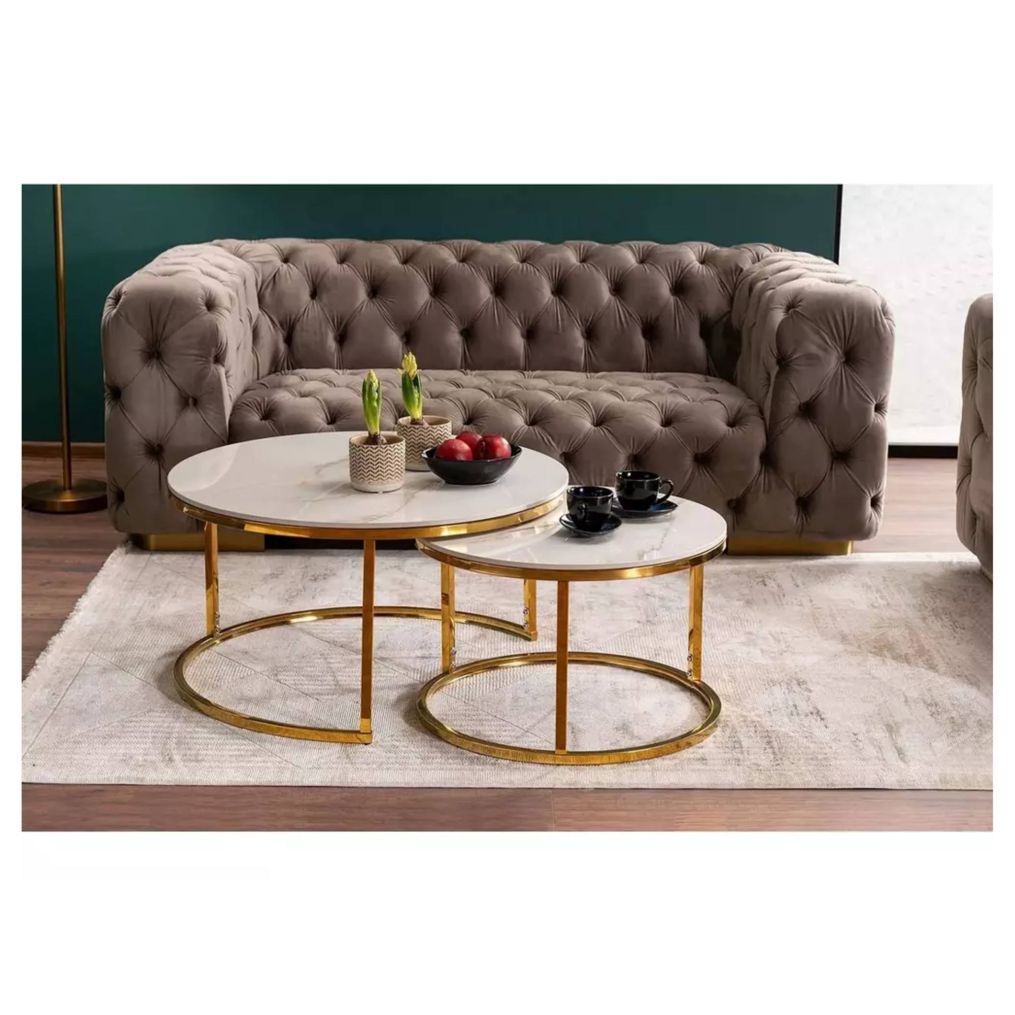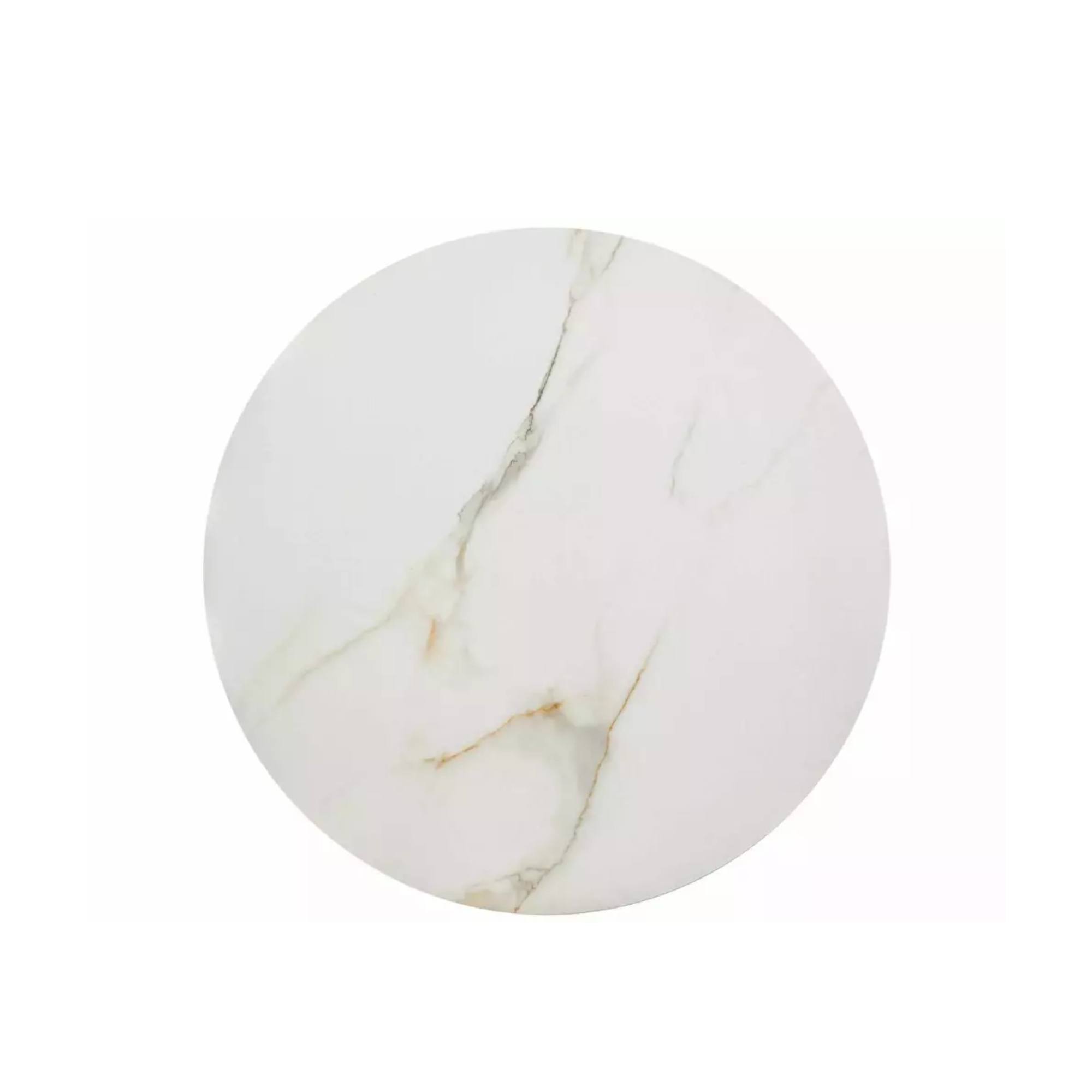 Kruhové odkladacie dosky sú vyrobené z keramiky. Ladené sú do dekora mramoru, ktorý interiéru prepožičia punc luxusu. Maximálnu stabilitu zaisťuje kovová konštrukcia. Odlišná veľkosť stolíkov umožňuje zasunúť menší stolík pod väčší, čím v prípade potreby ušetríte cenné miesto.